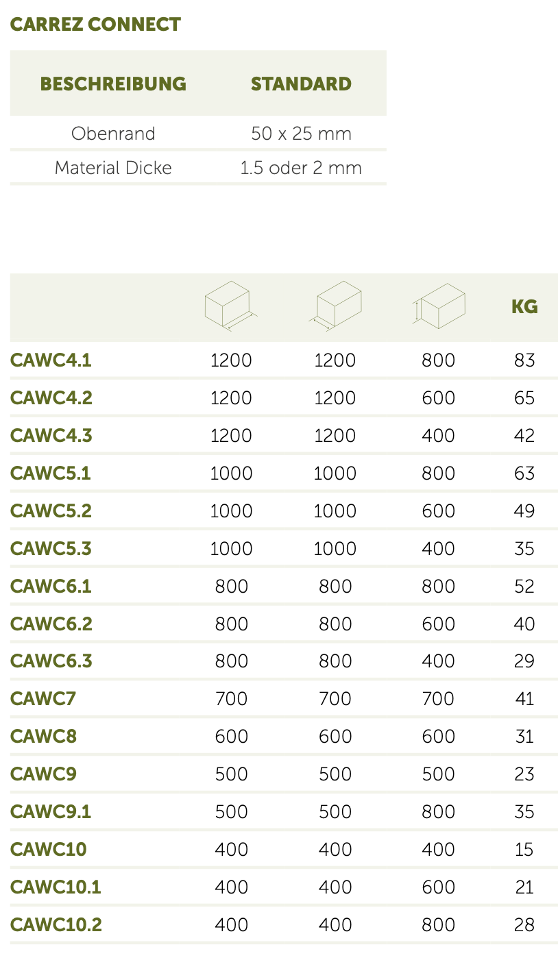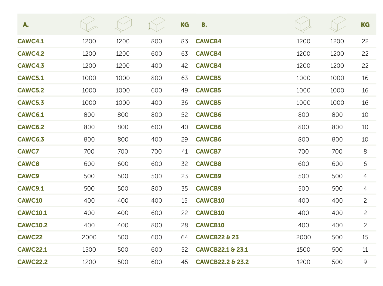 CAWC4.1 (1200x1200x800 mm),CAWC4.2 (1200x1200x600 mm),CAWC4.3 (1200x1200x400 mm),CAWC5.1 (1000x1000x800 mm),CAWC5.2 (1000x1000x600 mm),CAWC5.3 (1000x1000x400 mm),CAWC6.1 (800x800x800 mm),CAWC6.2 (800x800x600 mm),CAWC6.3 (800x800x400 mm),CAWC7 (700x700x700 mm),CAWC8 (600x600x600 mm),CAWC9 (500x500x500 mm),CAWC9.1 (500x500x800 mm),CAWC10 (400x400x400 mm),CAWC10.1 (400x400x600 mm),CAWC10.2 (400x400x800 mm)