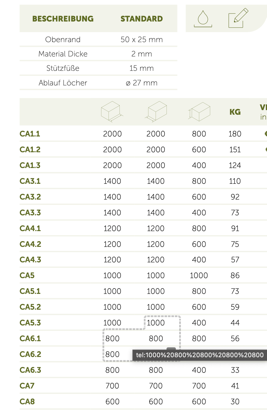 Maße: Verfügbar in Breiten von 400 bis 2000 mm, Tiefen von 400 bis 2000 mm, und Höhen von 400 bis 1000 mm