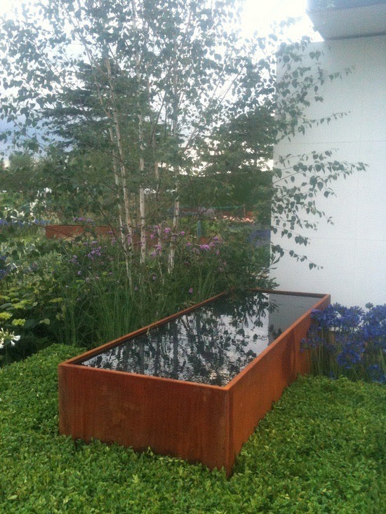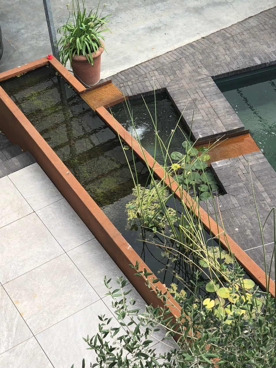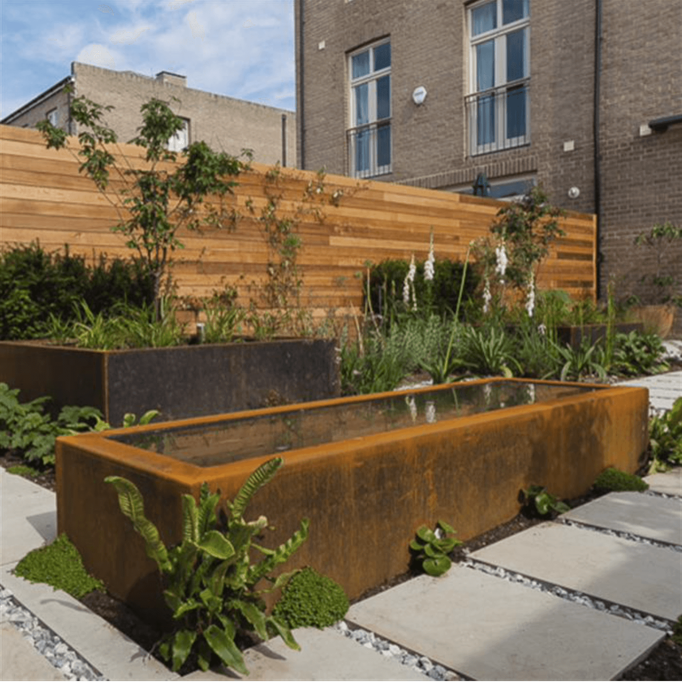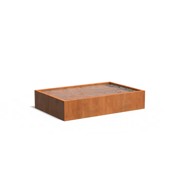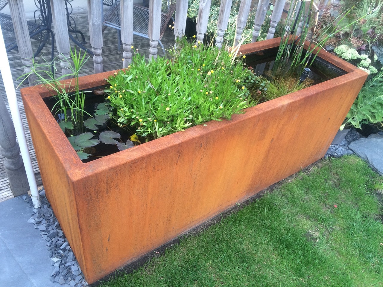 Cortenstahl ist eine Metalllegierung, die aus Eisen besteht, dem Kupfer, Phosphor, Silizium, Nickel und Chrom zugesetzt sind. Wenn das Material der Außenluft freigesetzt wird, überzieht es sich im Laufe der Zeit mit einer schützenden Rostschicht. Diese natürliche Rostschicht bildet den Schutz vor weiterer Korrosion. Dadurch haben die Teiche eine lange Lebensdauer.