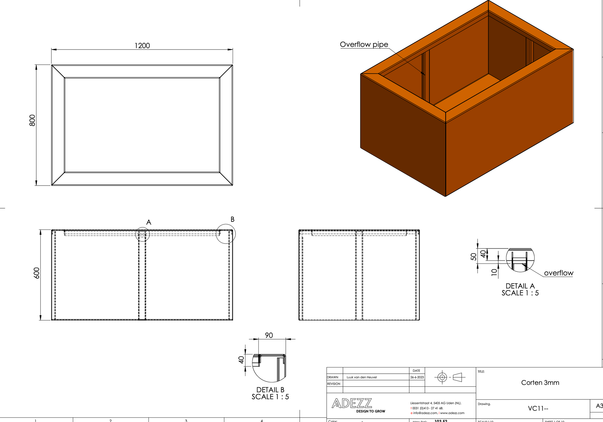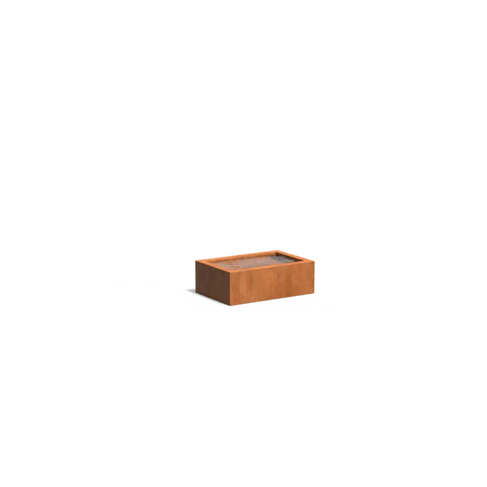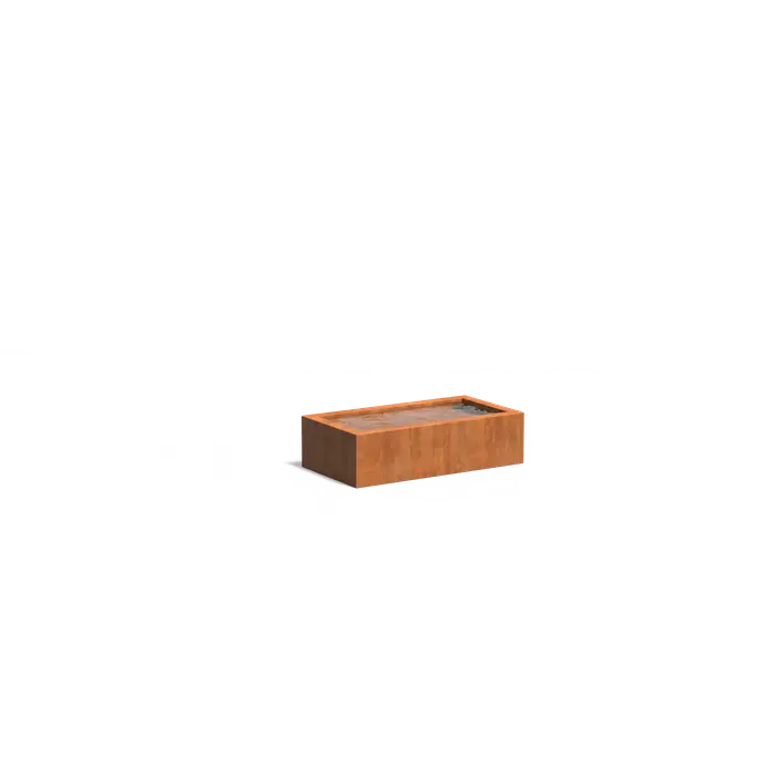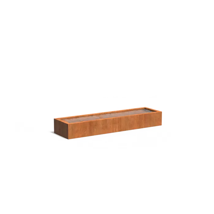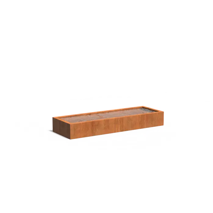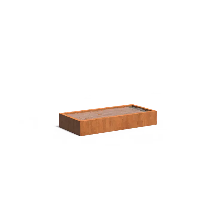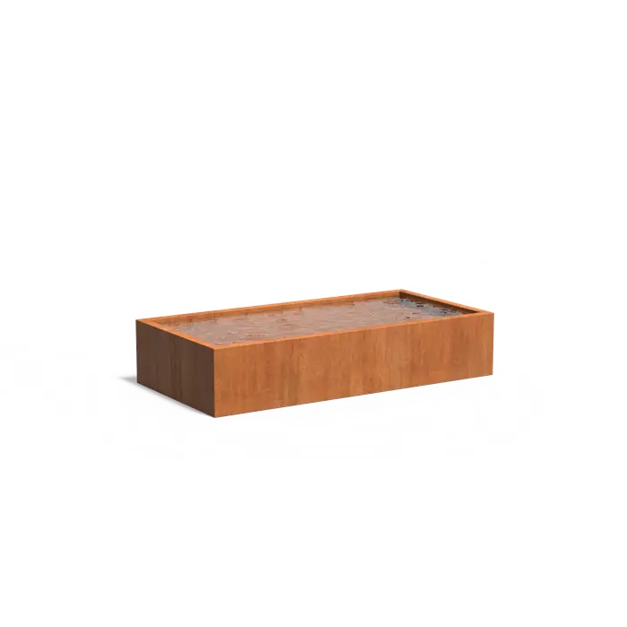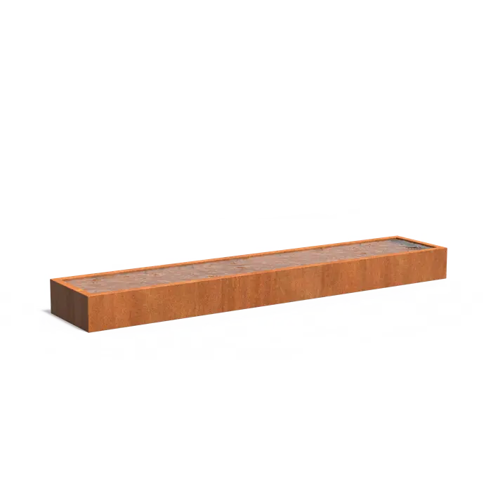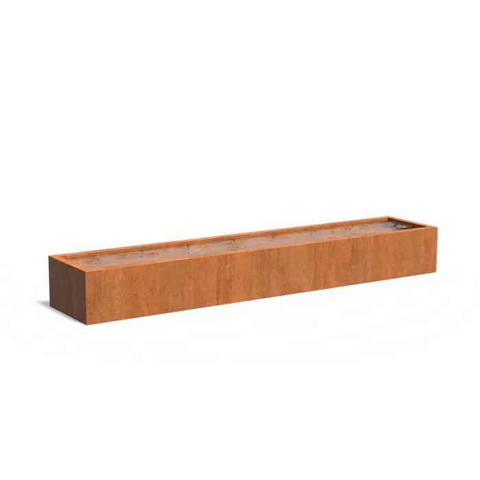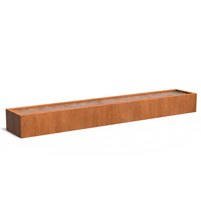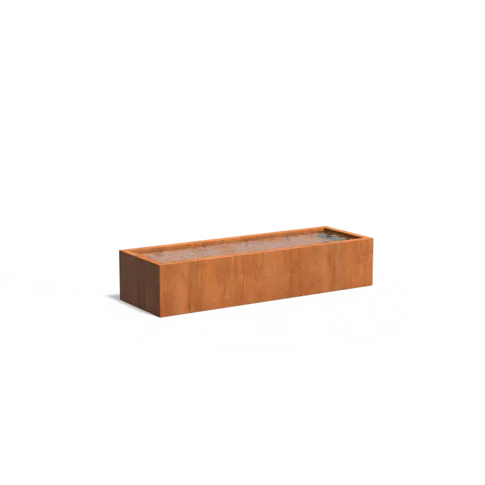 Material: Cortenstahl Breite: 1200-6000 mm Tiefe: 800-1000 cm Höhe: 400-600 mm Oberrand: 90x40 mm Material Dicke: 3 mm Überlaufrohr: ja