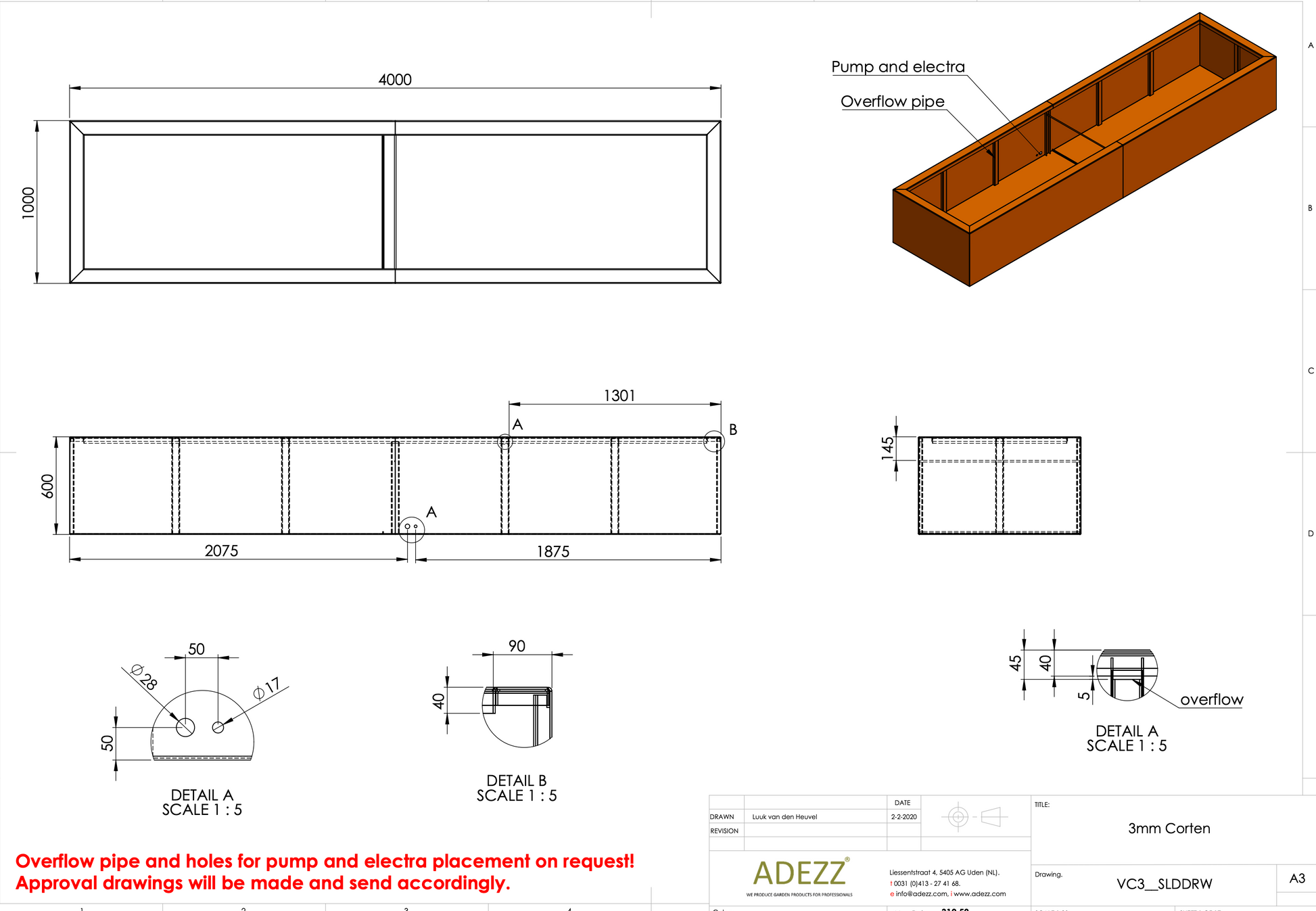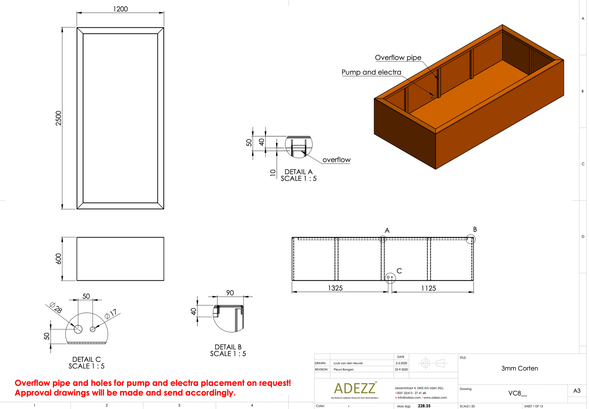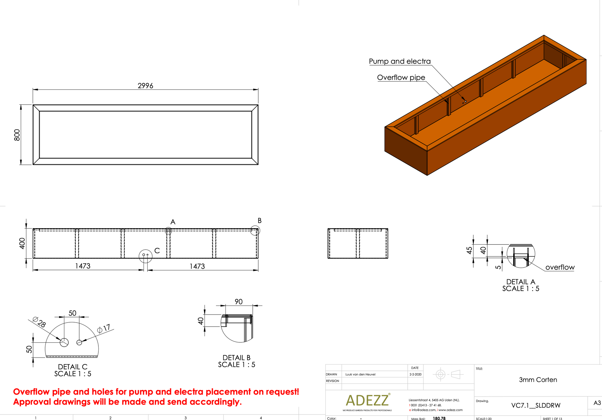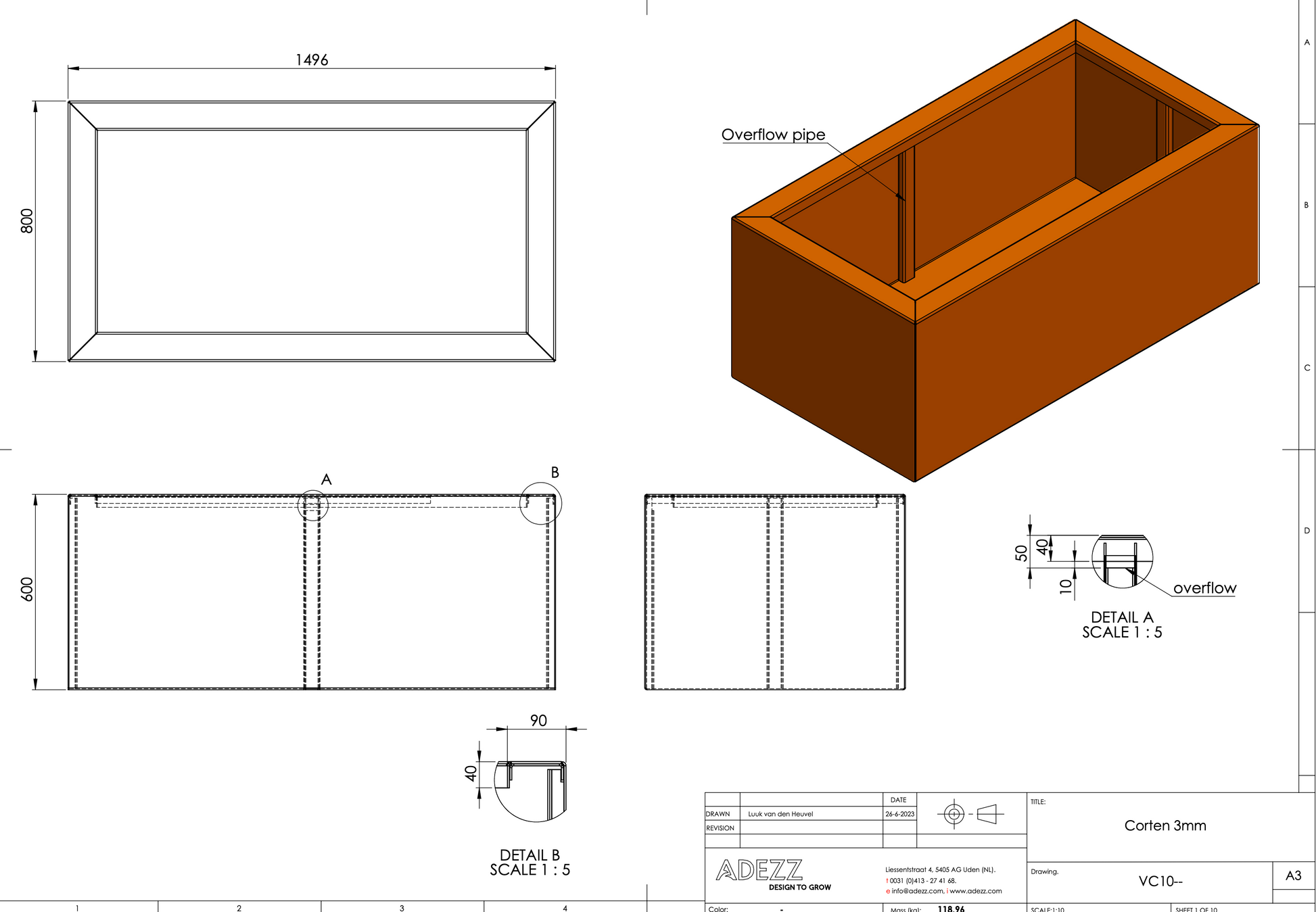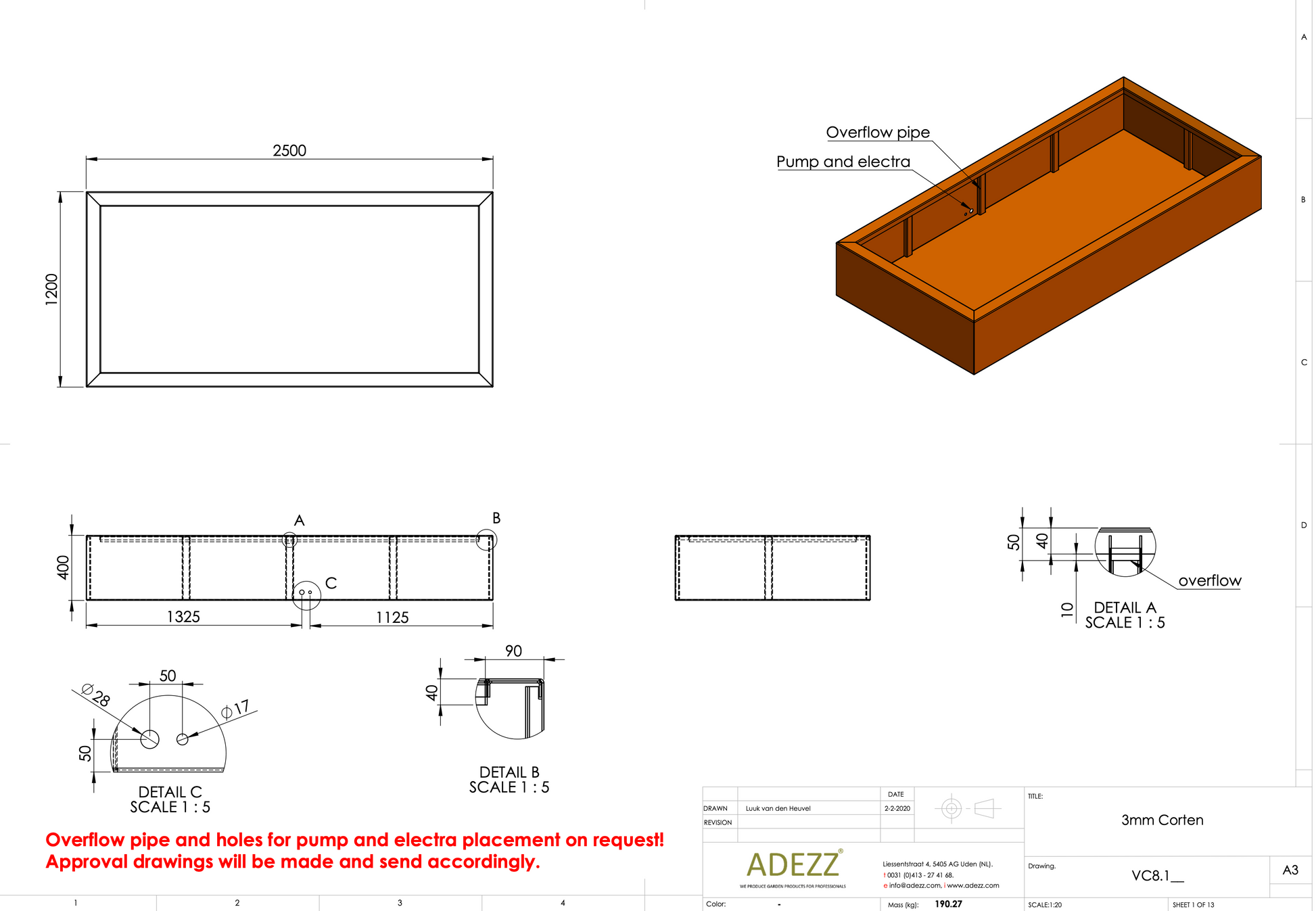 Material: Cortenstahl Breite: 1200-6000 mm Tiefe: 800-1000 cm Höhe: 400-600 mm Oberrand: 90x40 mm Material Dicke: 3 mm Überlaufrohr: ja