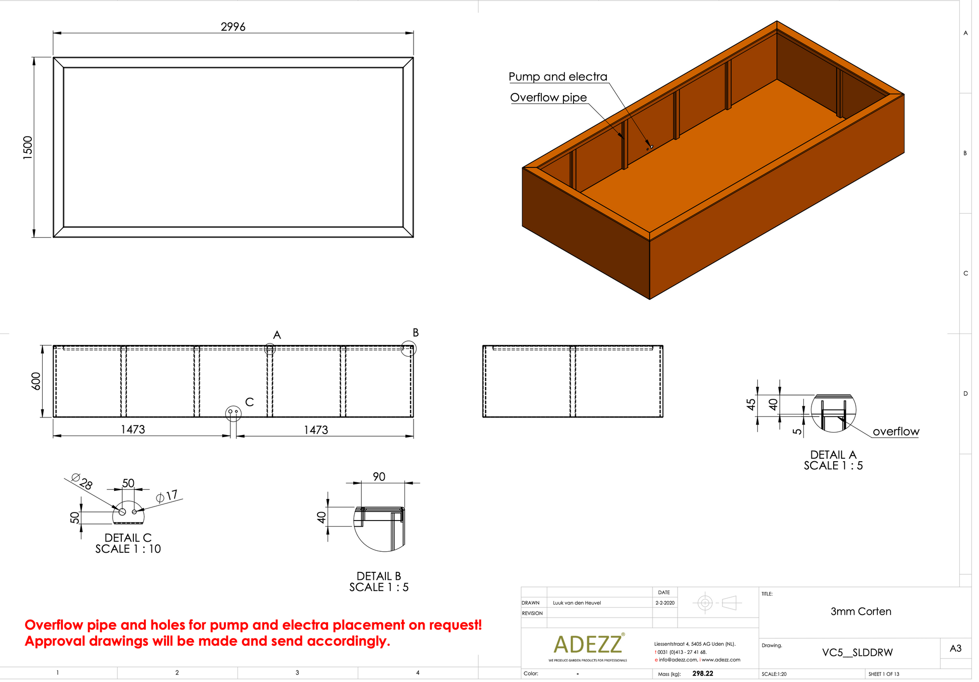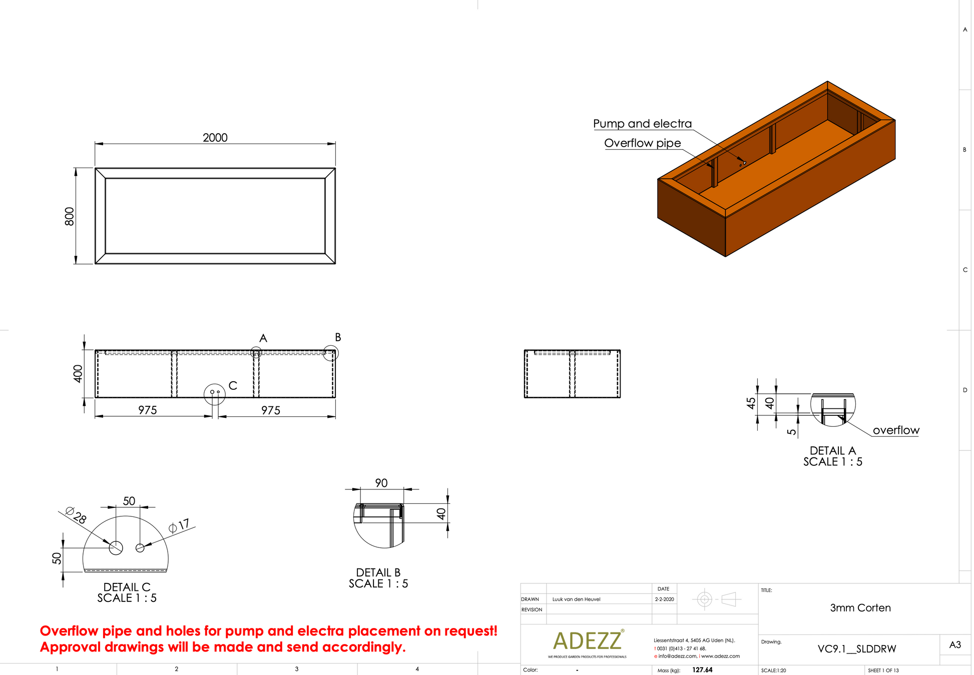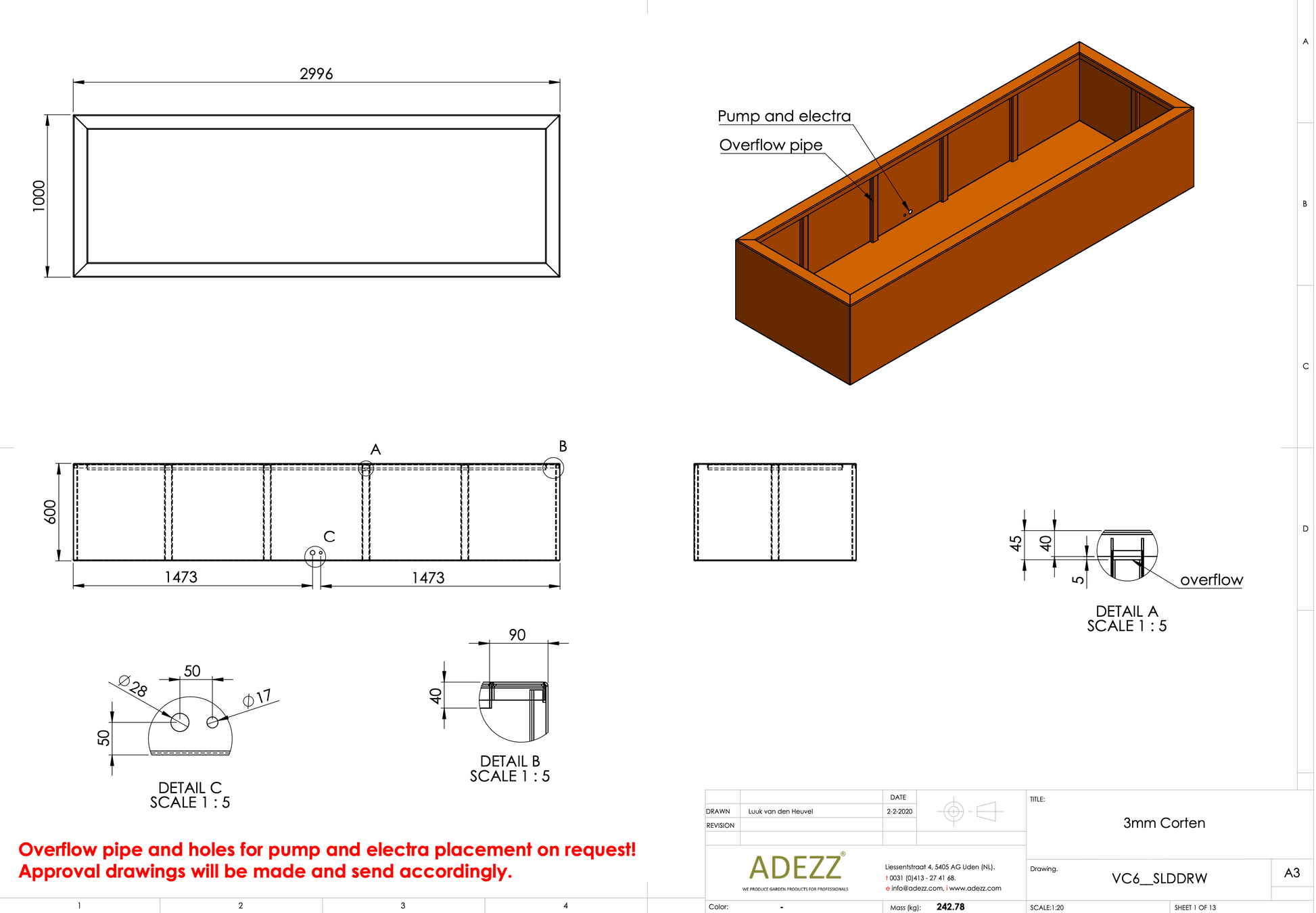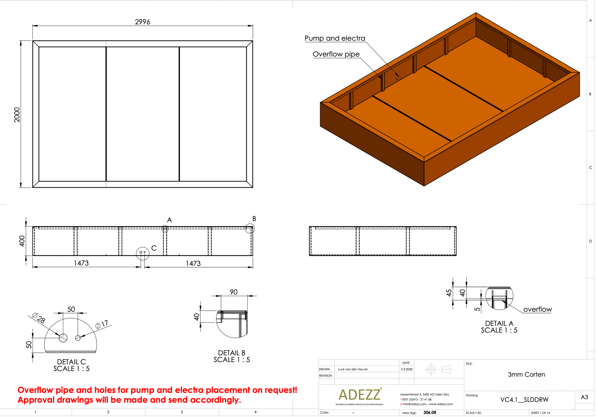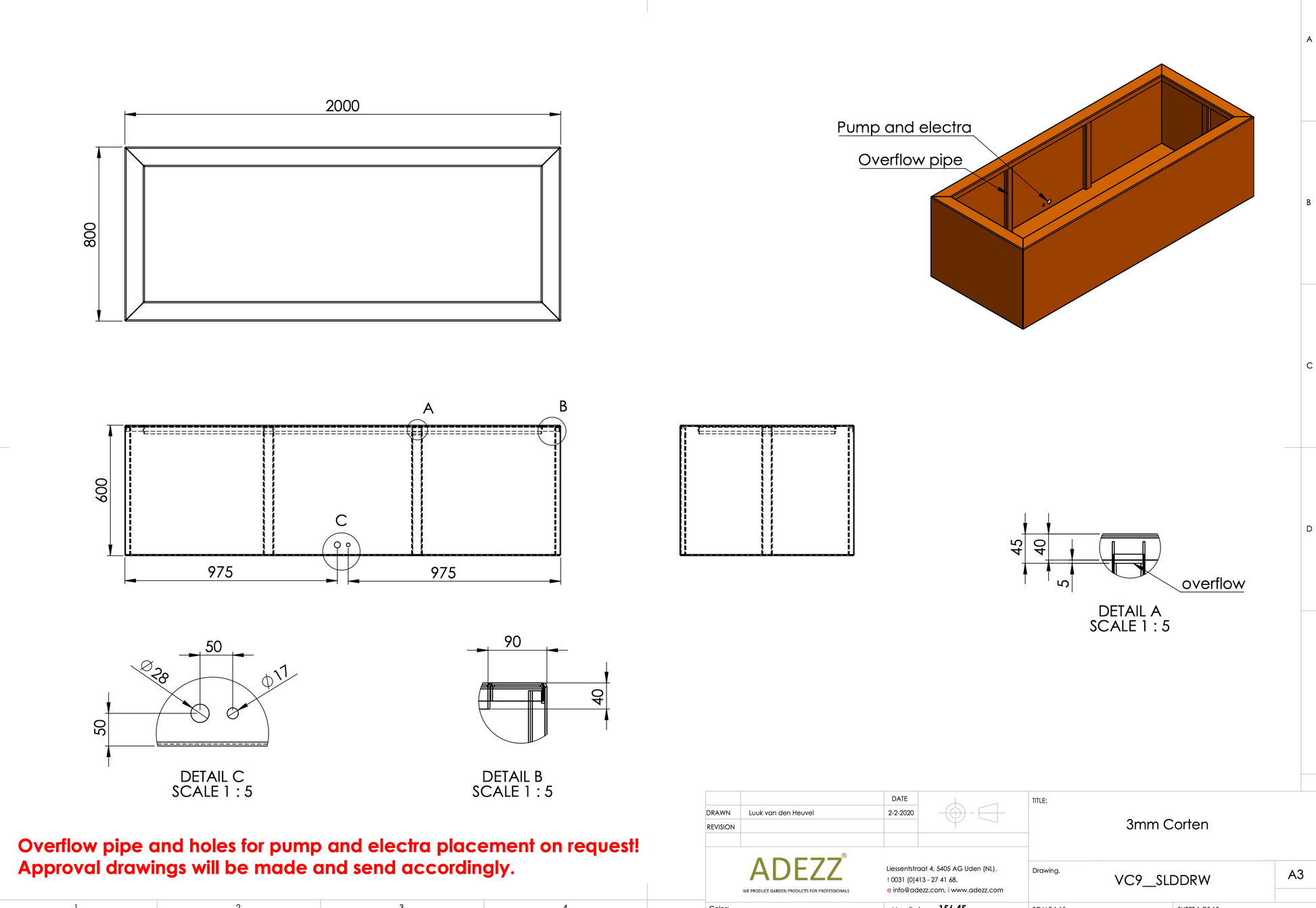 Material: Cortenstahl Breite: 1200-6000 mm Tiefe: 800-1000 cm Höhe: 400-600 mm Oberrand: 90x40 mm Material Dicke: 3 mm Überlaufrohr: ja