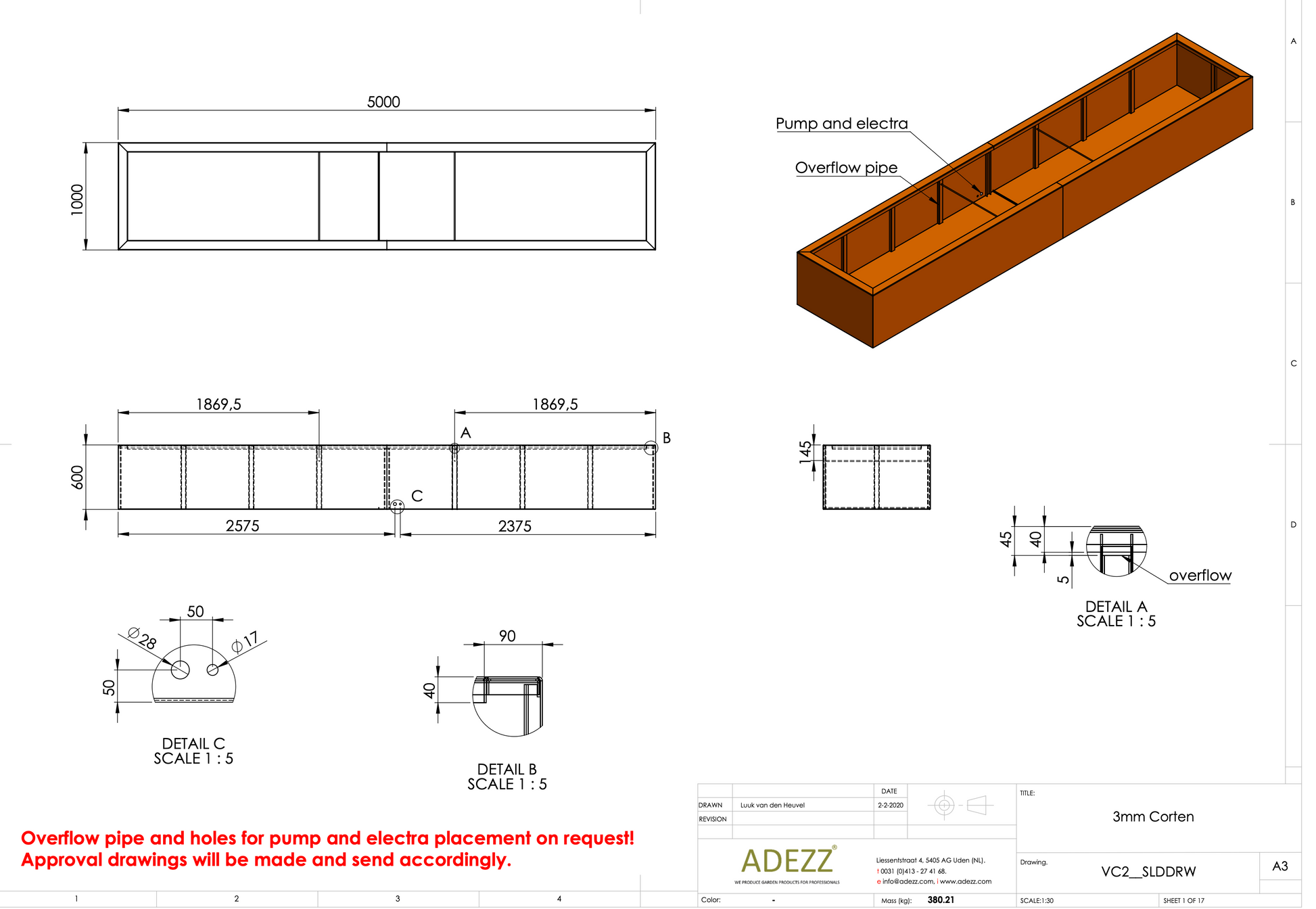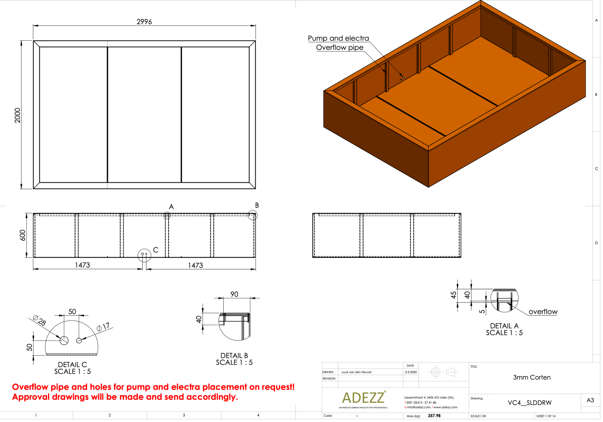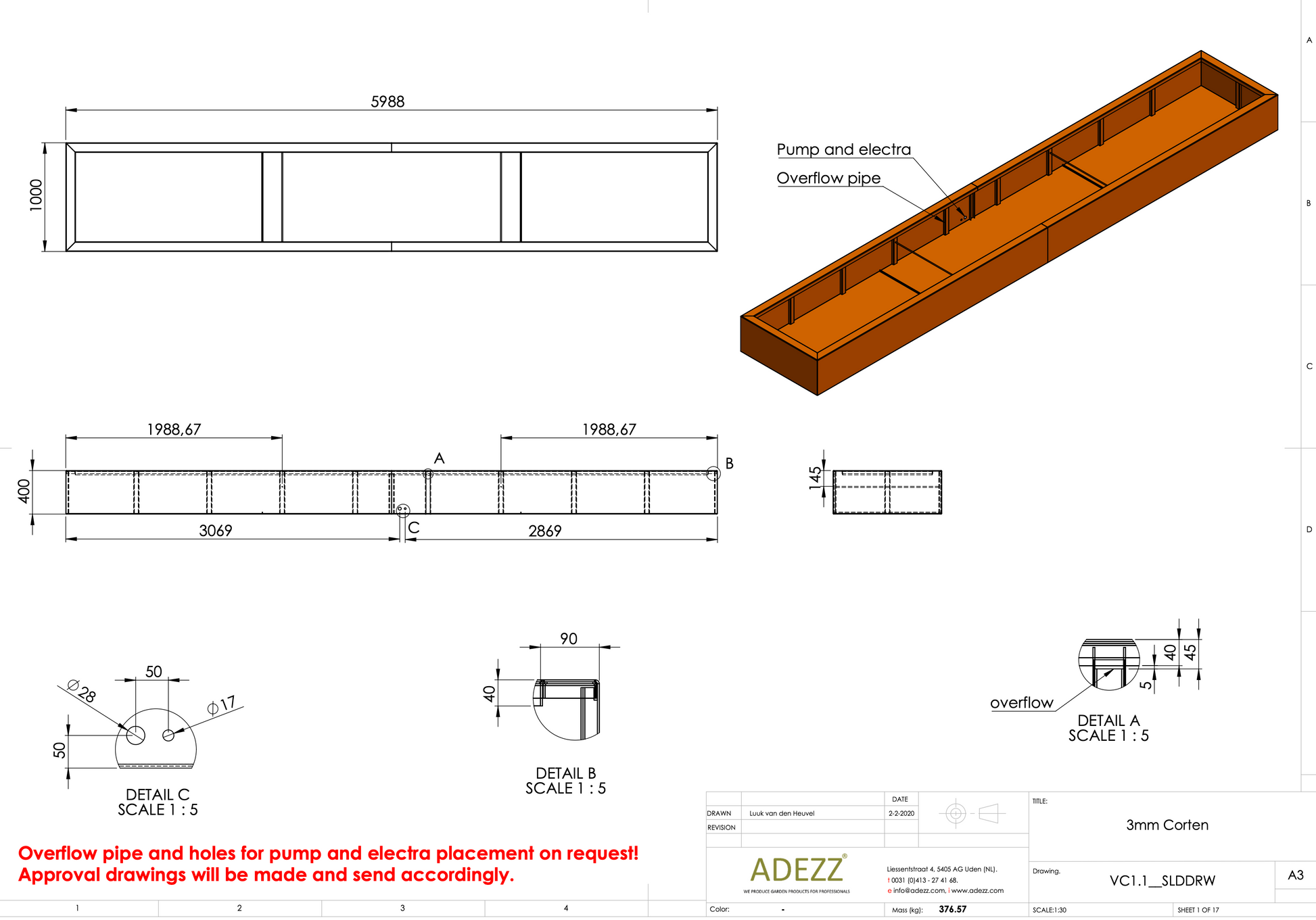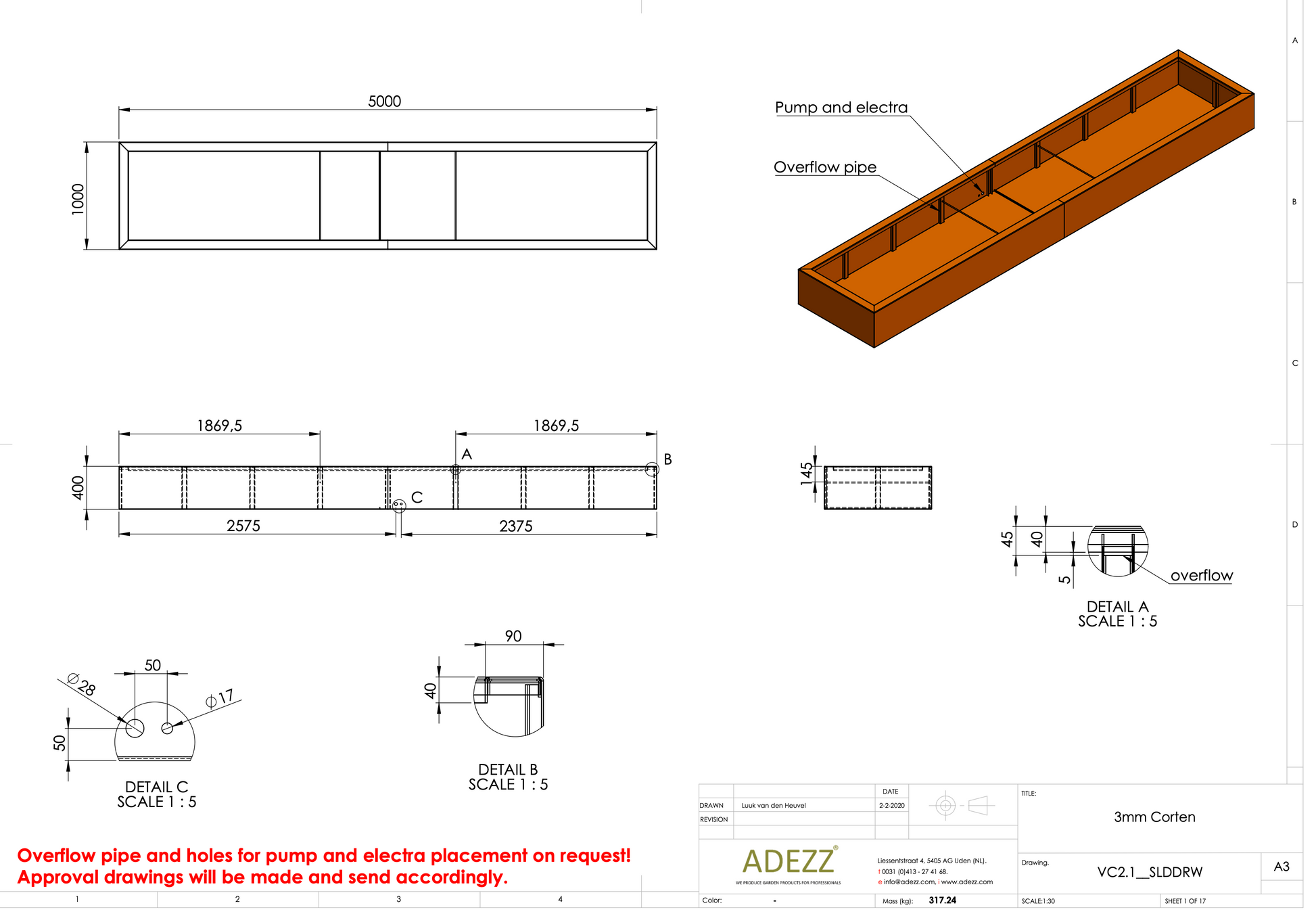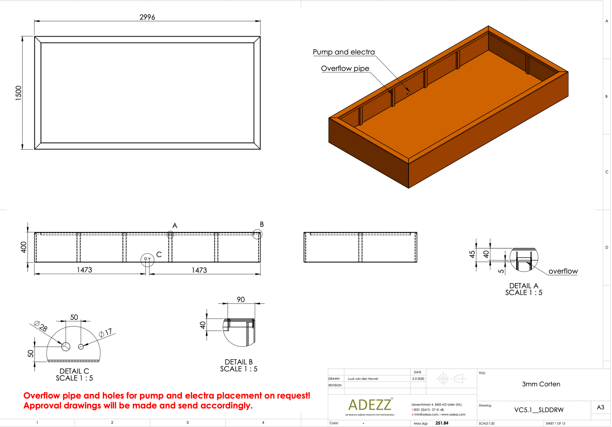 Material: Cortenstahl Breite: 1200-6000 mm Tiefe: 800-1000 cm Höhe: 400-600 mm Oberrand: 90x40 mm Material Dicke: 3 mm Überlaufrohr: ja