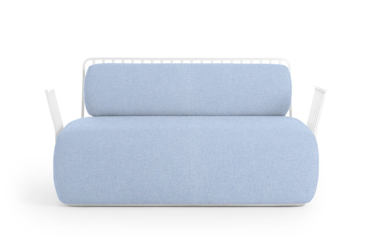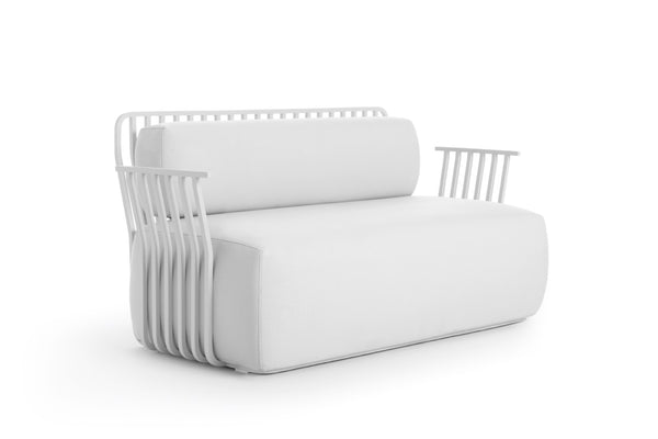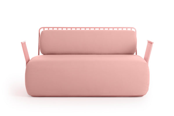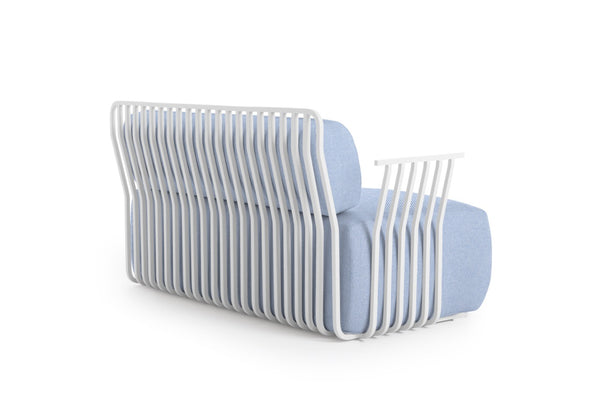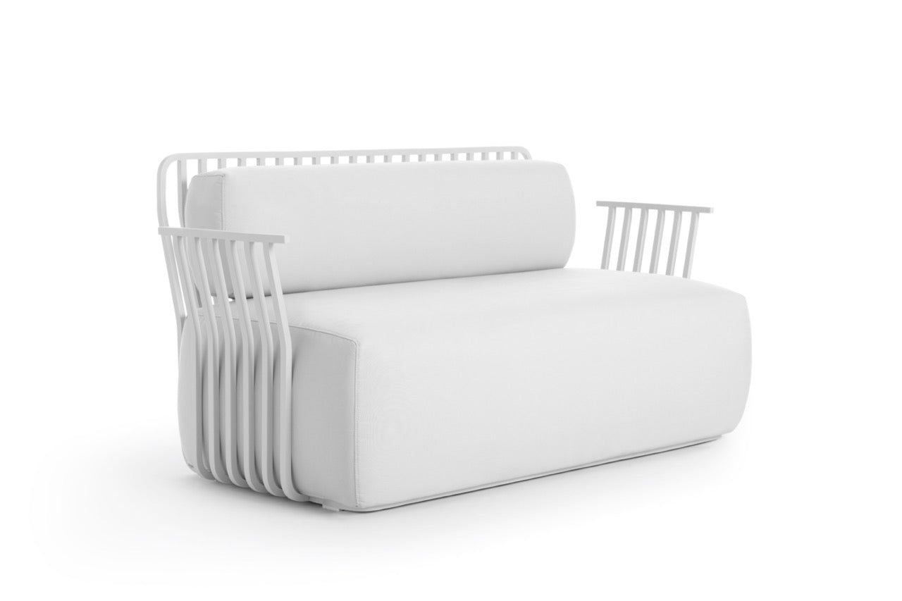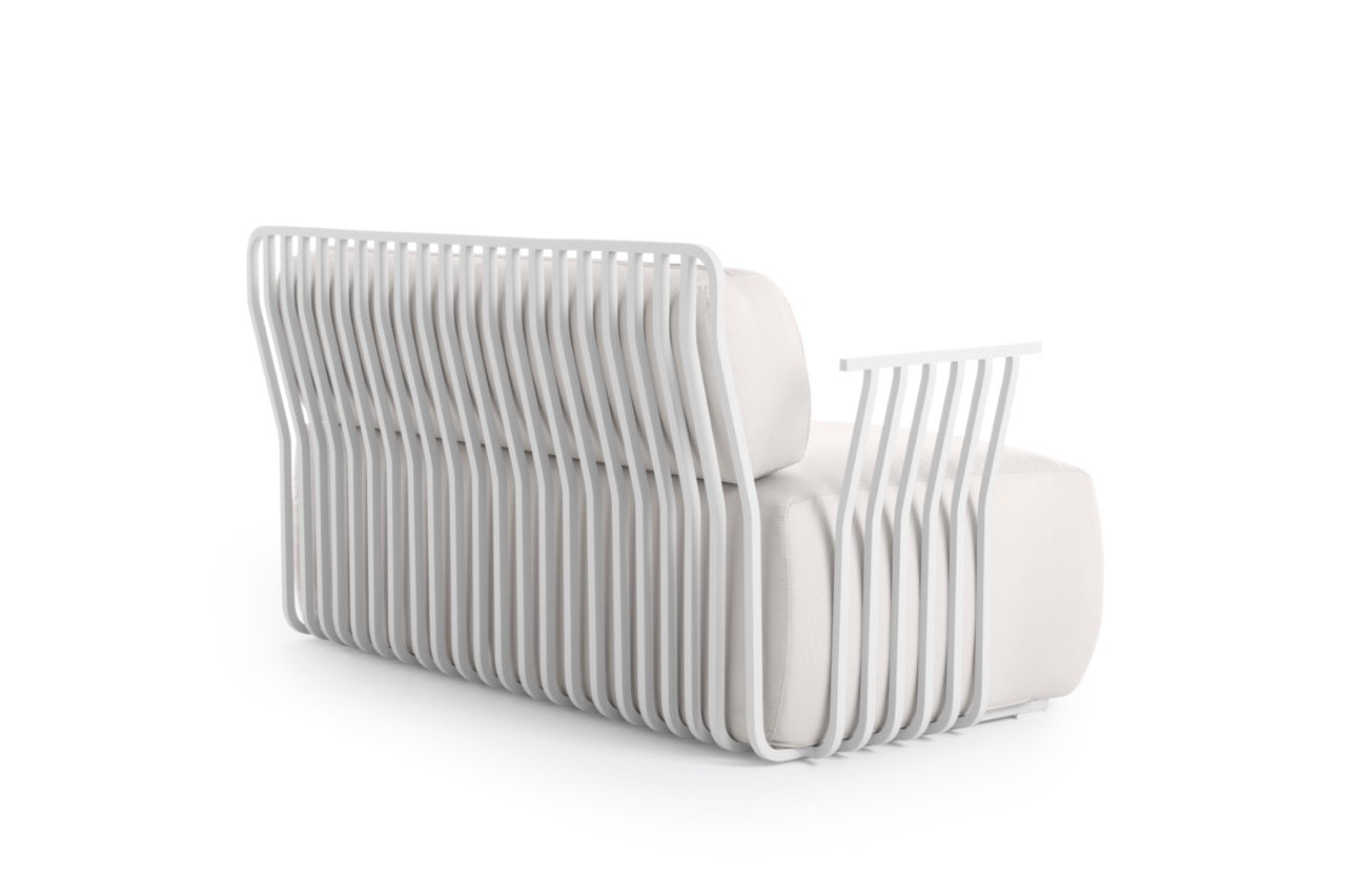 Das Sofa Grill mit Armlehnen hat ein charakteristisches gebogenes Aluminiumgestell mit quadratischem Querschnitt, thermolackiert und strukturiert, um Kratzer und Fingerabdrücke zu vermeiden. Die Leichtigkeit und Stärke des Aluminiums machen dieses Designersofa zu einem perfekten Outdoor-Möbel für jeden Außenbereich. Die fließenden Linien seiner Struktur umschließen großzügige Kissen aus Polyurethanschaum, die mit einem wasserabweisenden Stoff überzogen sind und einen hohen Komfort für die Sitzfläche und die Rückenlehne dieses exklusiven Diabla Outdoor-Designs bieten.