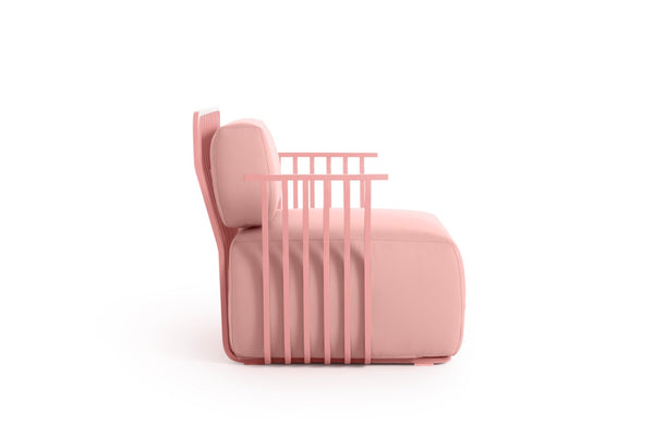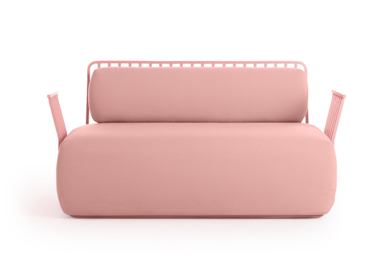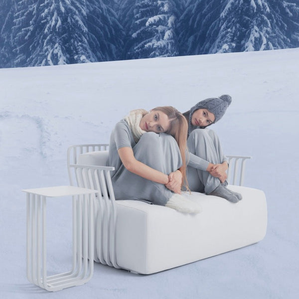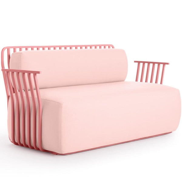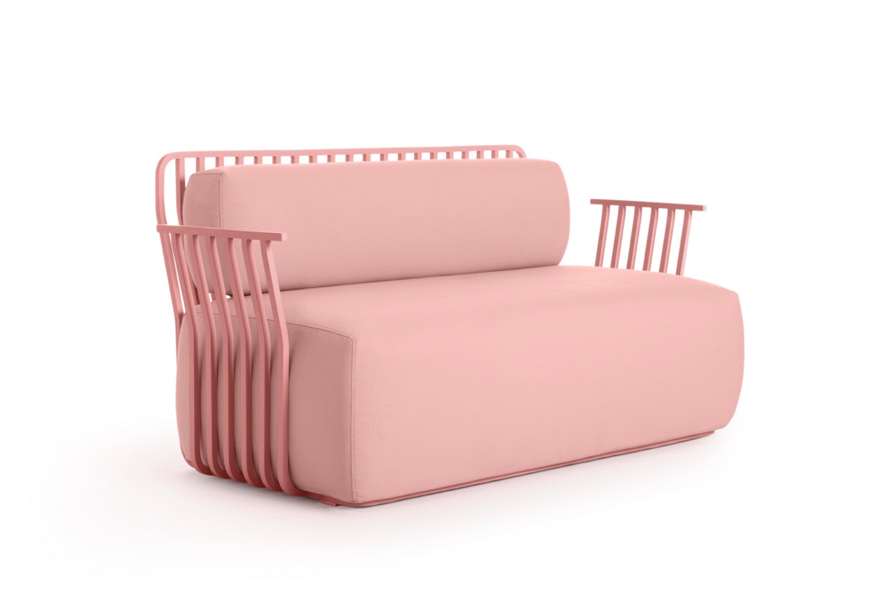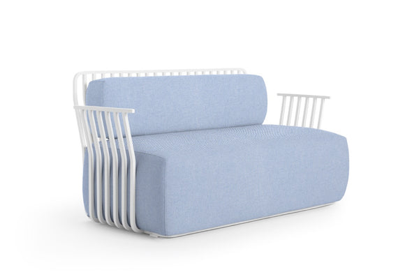 Das Sofa Grill mit Armlehnen hat ein charakteristisches gebogenes Aluminiumgestell mit quadratischem Querschnitt, thermolackiert und strukturiert, um Kratzer und Fingerabdrücke zu vermeiden. Die Leichtigkeit und Stärke des Aluminiums machen dieses Designersofa zu einem perfekten Outdoor-Möbel für jeden Außenbereich. Die fließenden Linien seiner Struktur umschließen großzügige Kissen aus Polyurethanschaum, die mit einem wasserabweisenden Stoff überzogen sind und einen hohen Komfort für die Sitzfläche und die Rückenlehne dieses exklusiven Diabla Outdoor-Designs bieten.