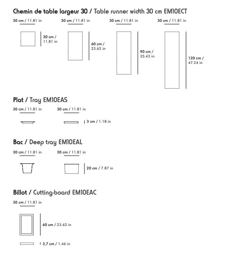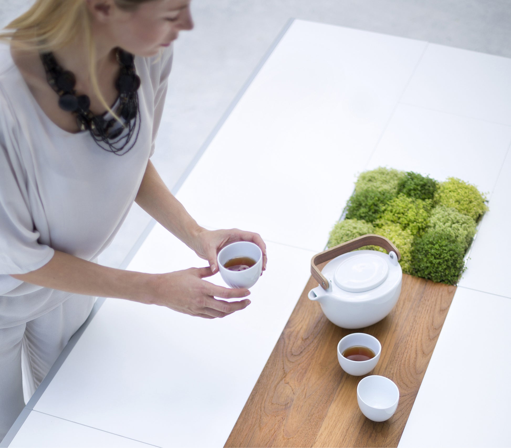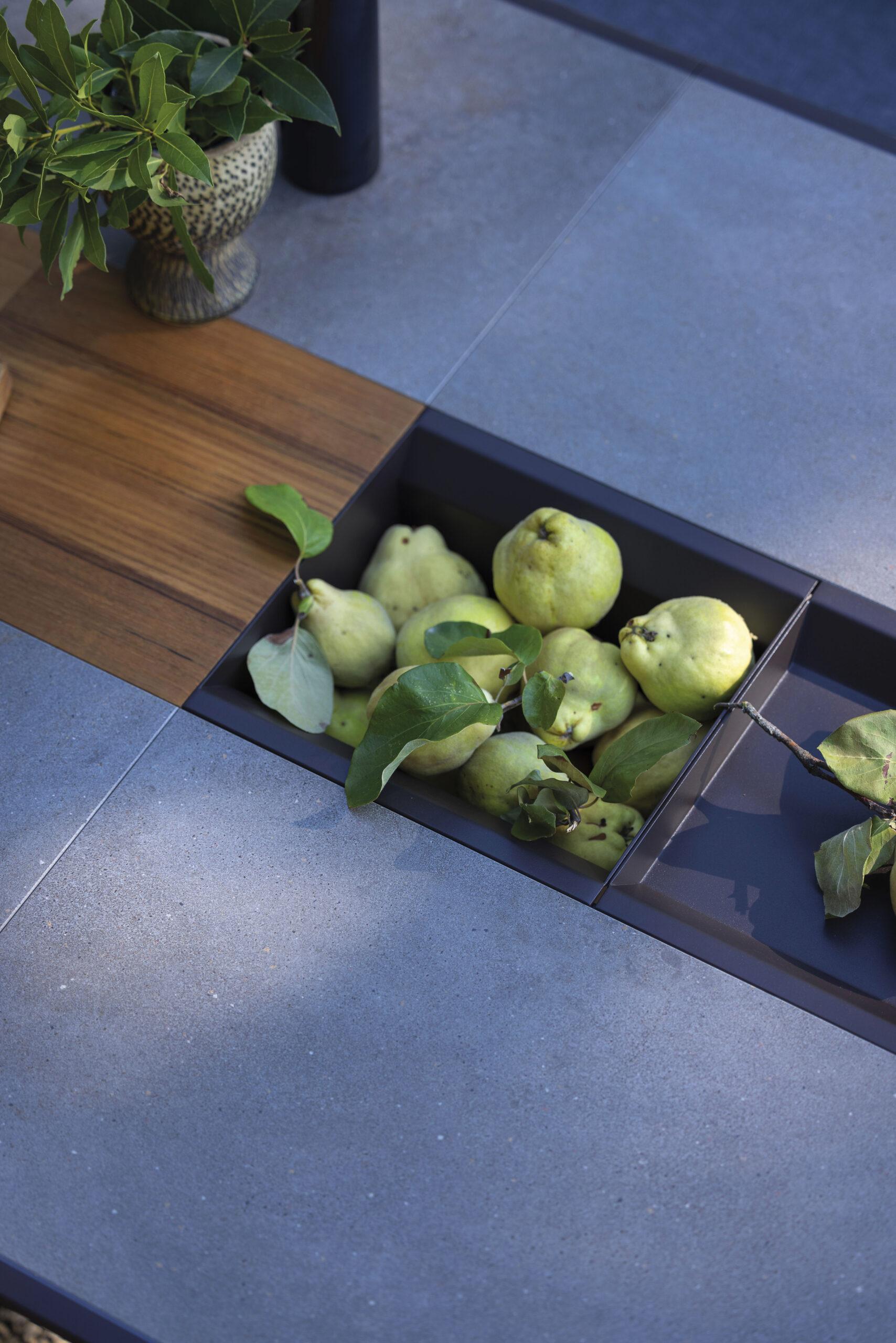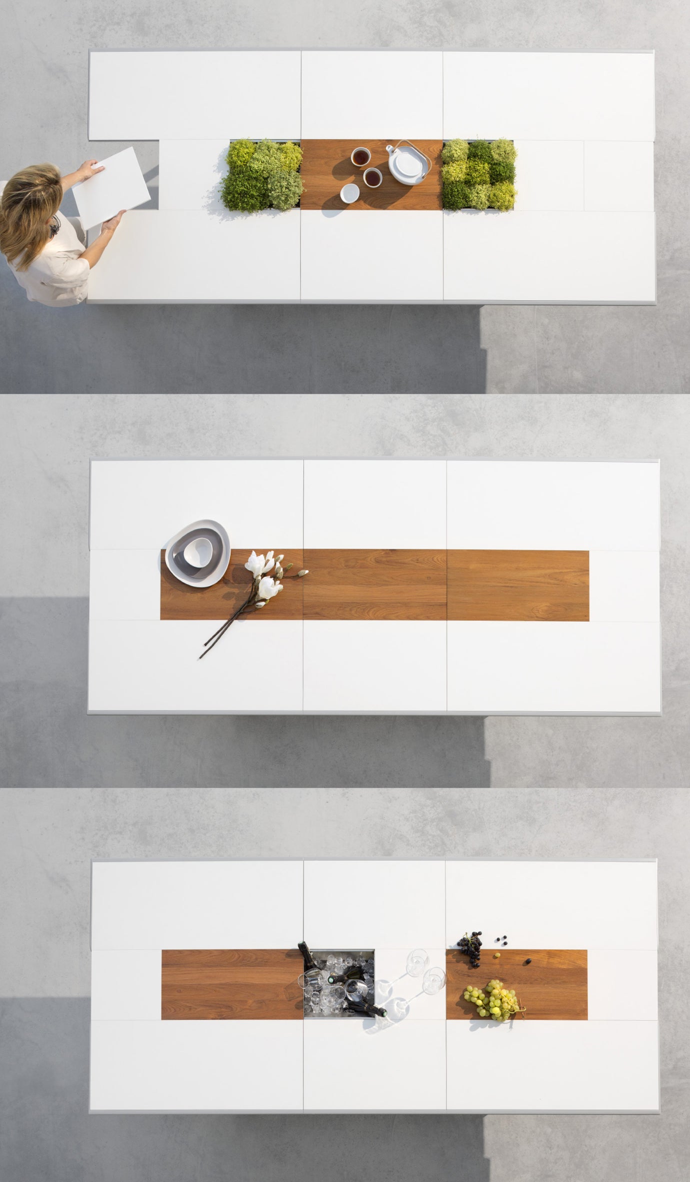 Die Tischmitte lässt sich nach Belieben gestalten: mit tiefen oder flachen farbigen Aluminium-Einsätzen, einem Schneidebrett mit Messerhalter oder einem Flaschenhalter aus Kork.