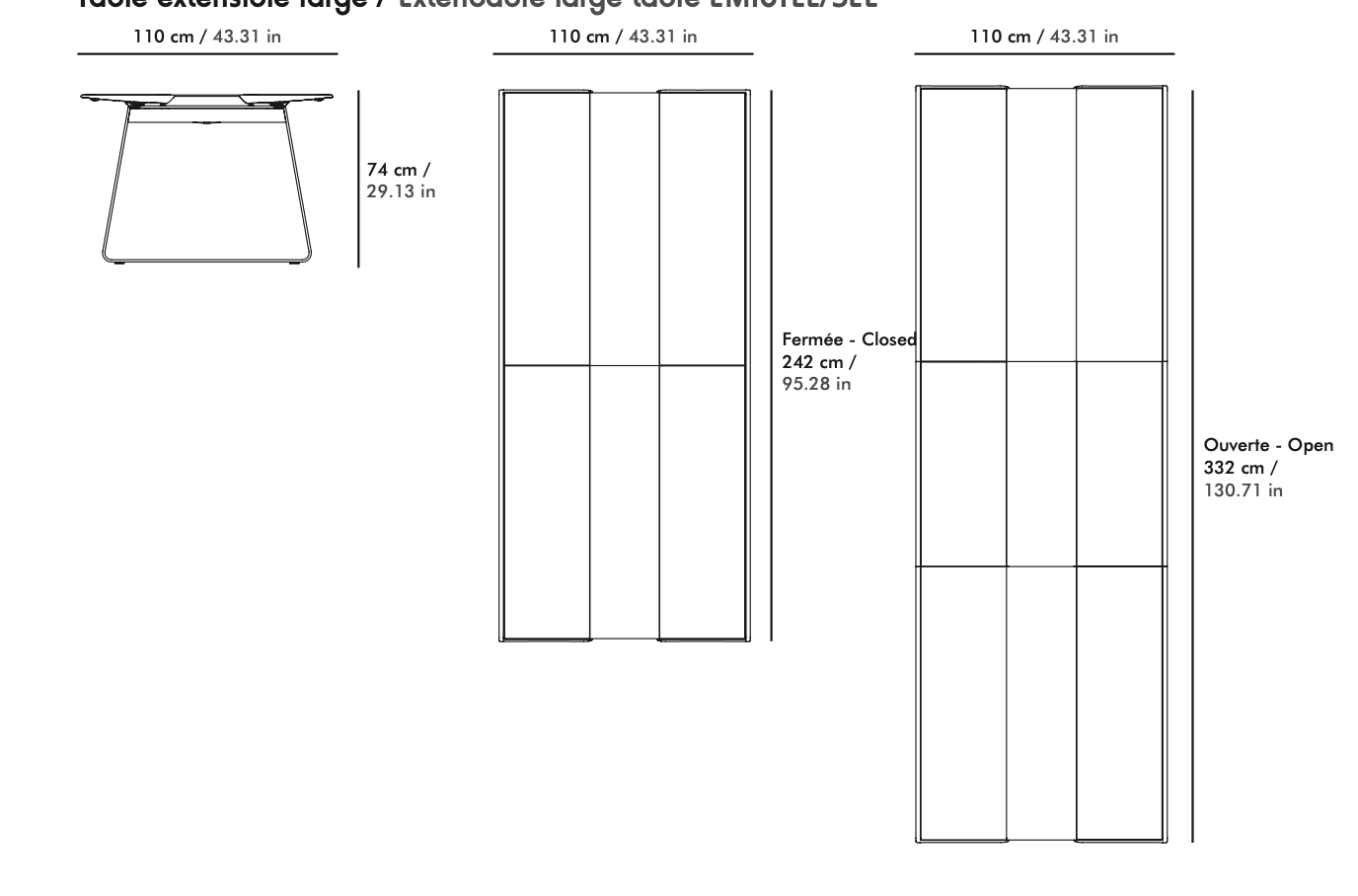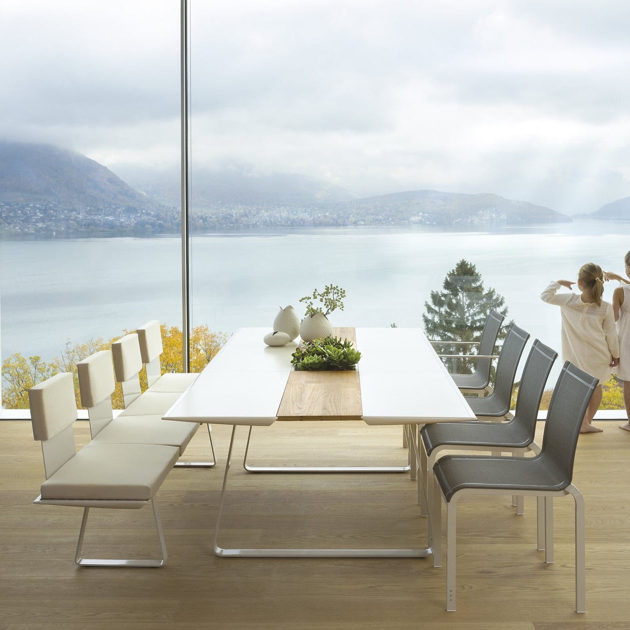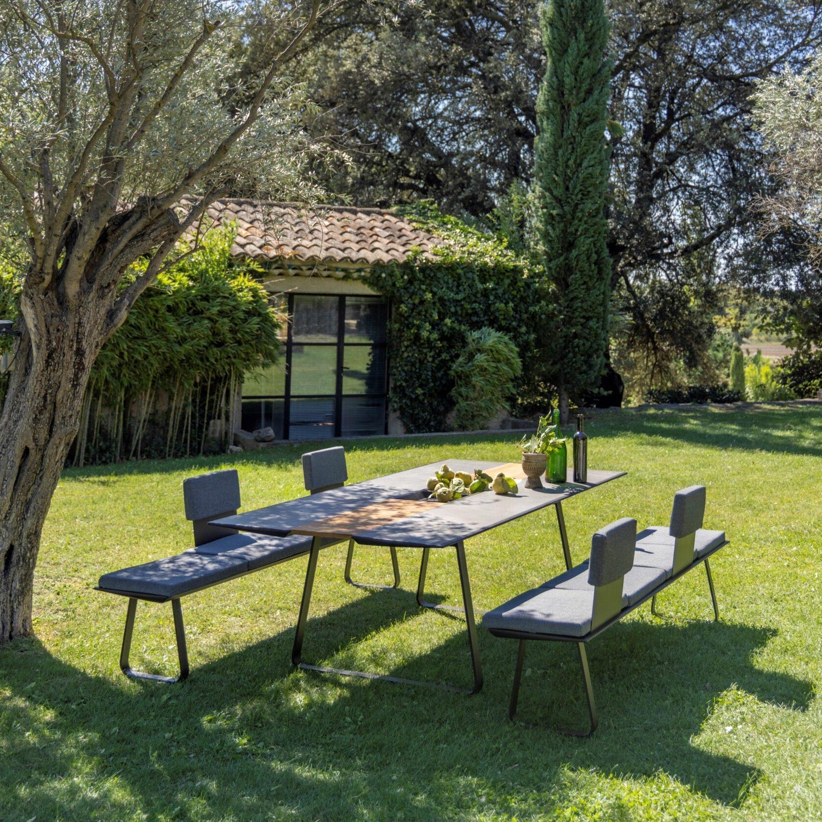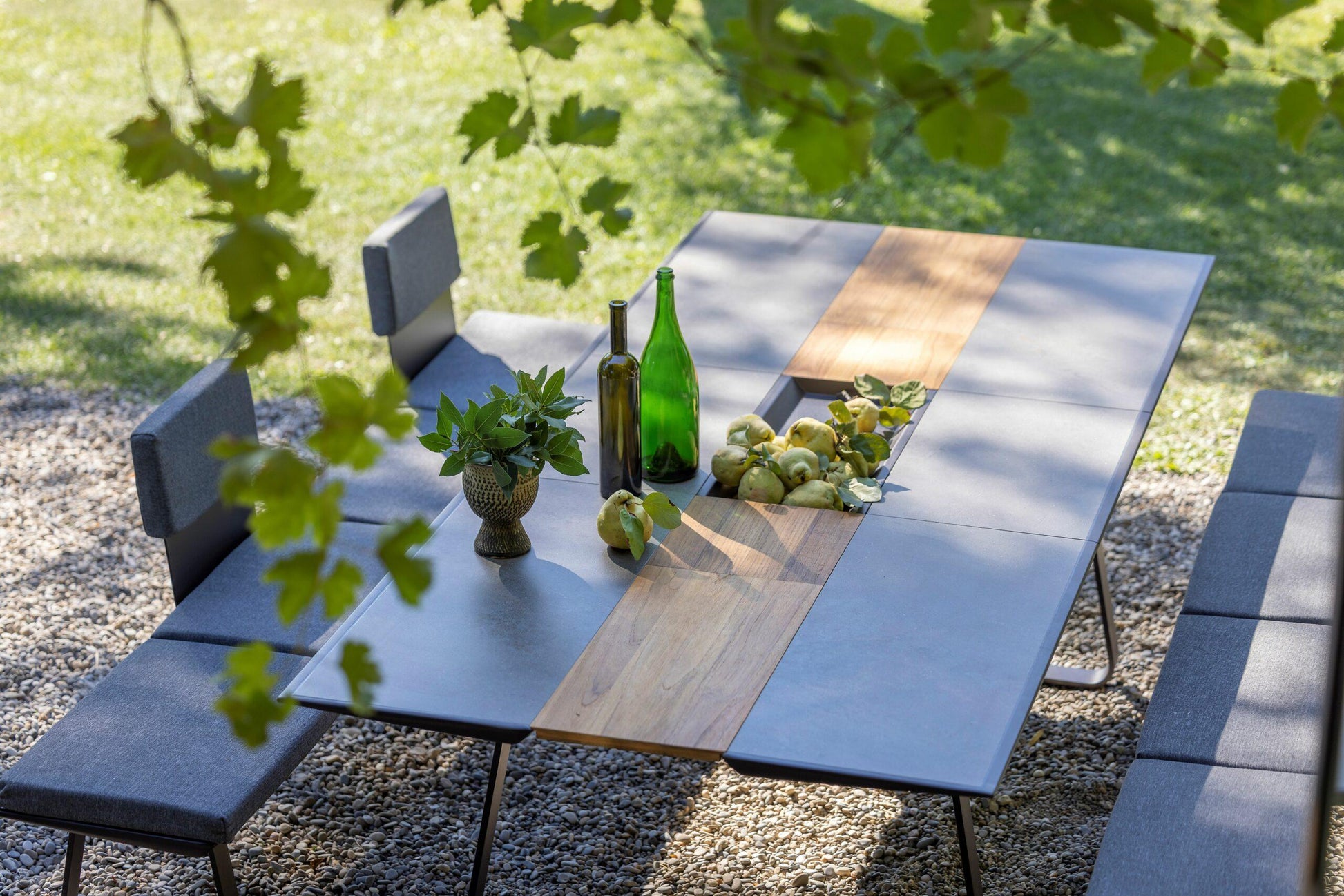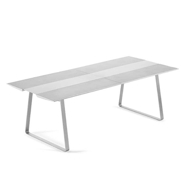 Die Esstische sind mit Tischläufer-Elementen aus pulverbeschichtetem Aluminium oder ohne Tischläufer-Elemente erhältlich.
