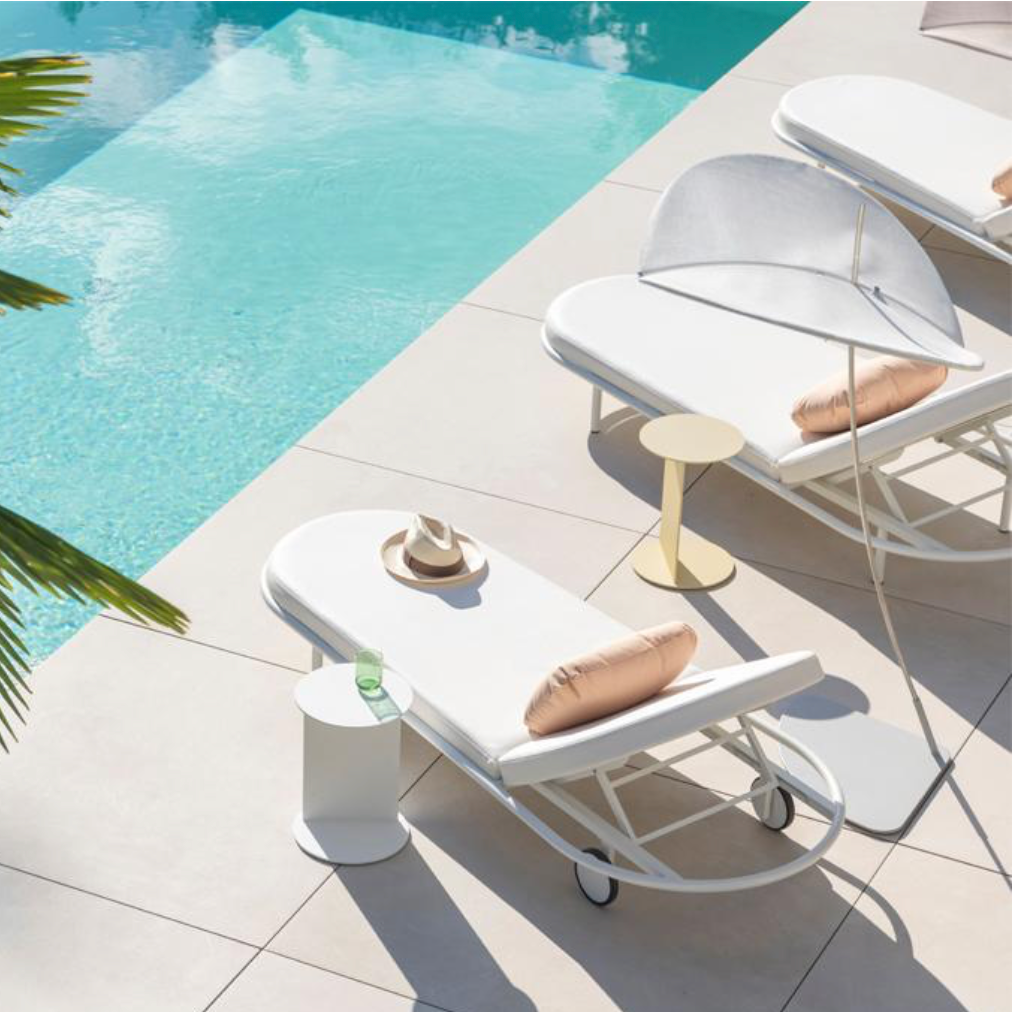Dieser kleine, minimalistische Beistelltisch macht sich gut auf einer Terrasse oder am Pool.