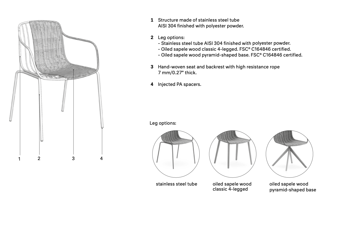 Stuhl gefertigt aus rostfreiem Stahl. Sitz und Rückengeflecht handgeflochten aus 7 mm starken Seil. Fussgestell gefertigt aus lackiertem und rostfreien Stahl, stapelbar.