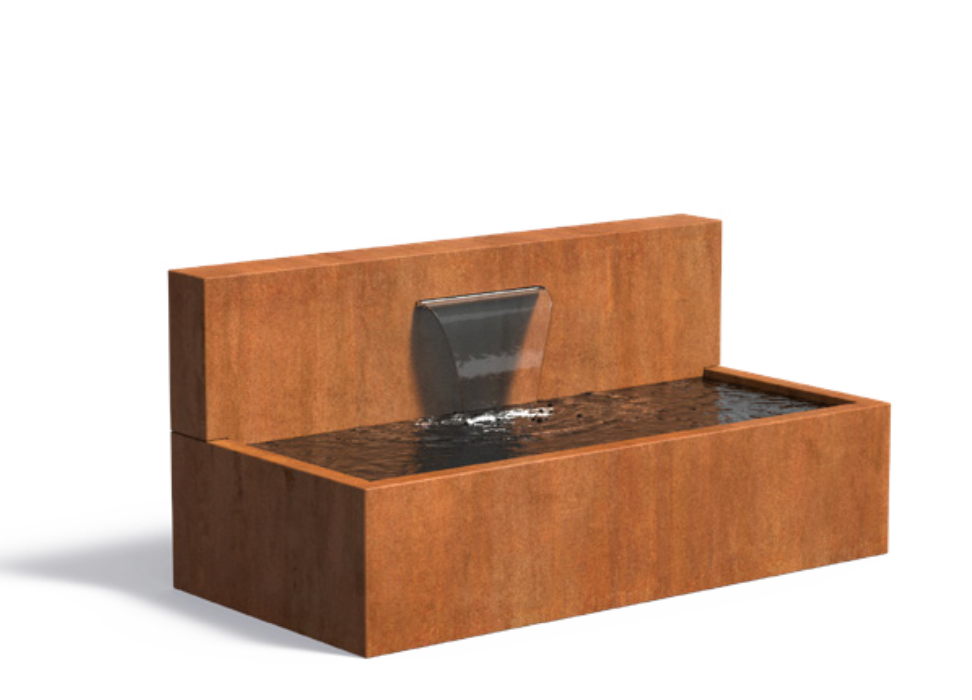 Der Wasserblock aus Cortenstahl bietet ein faszinierendes Wasserspiel, das durch LED-Licht auch bei Dunkelheit überzeugt.