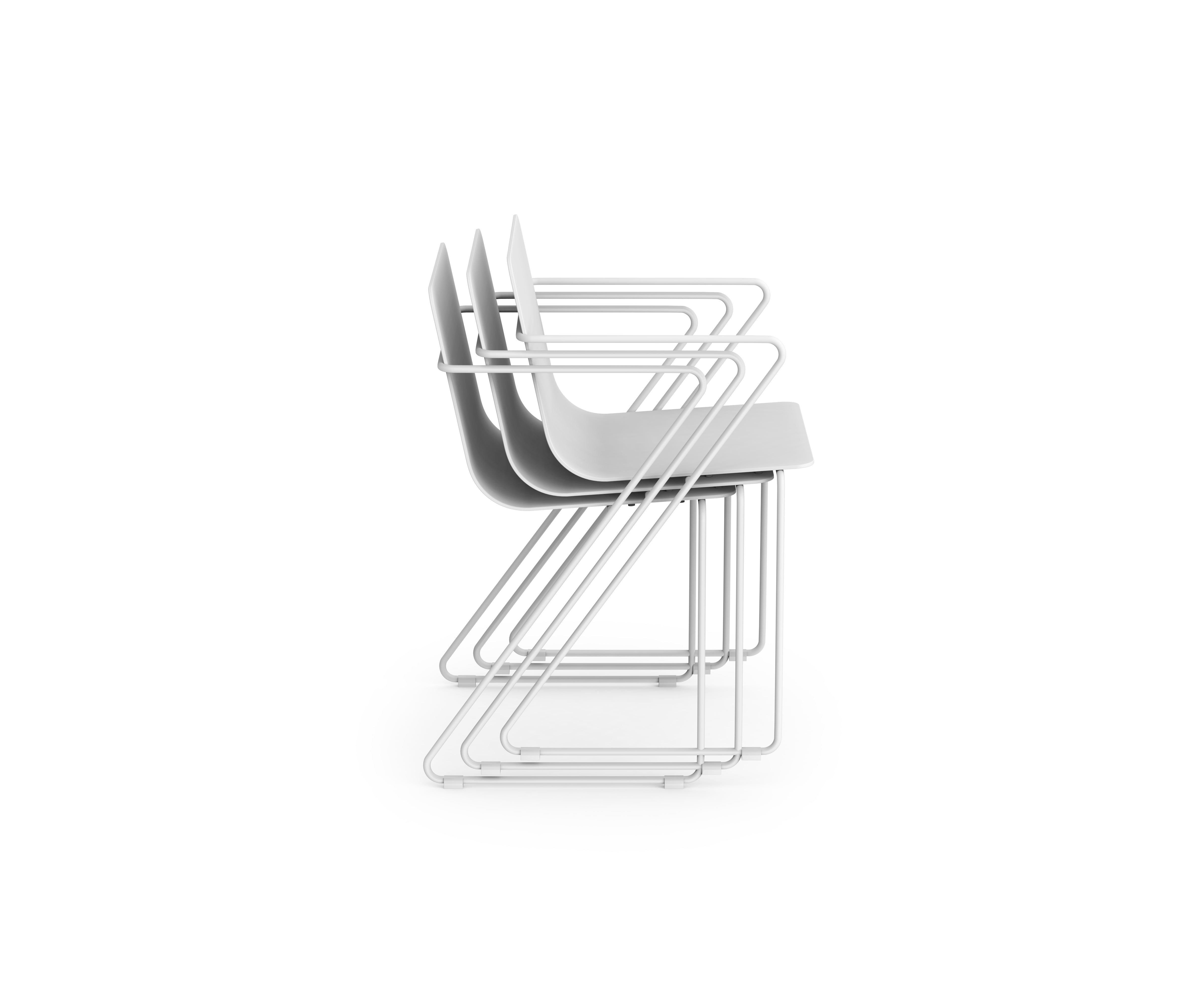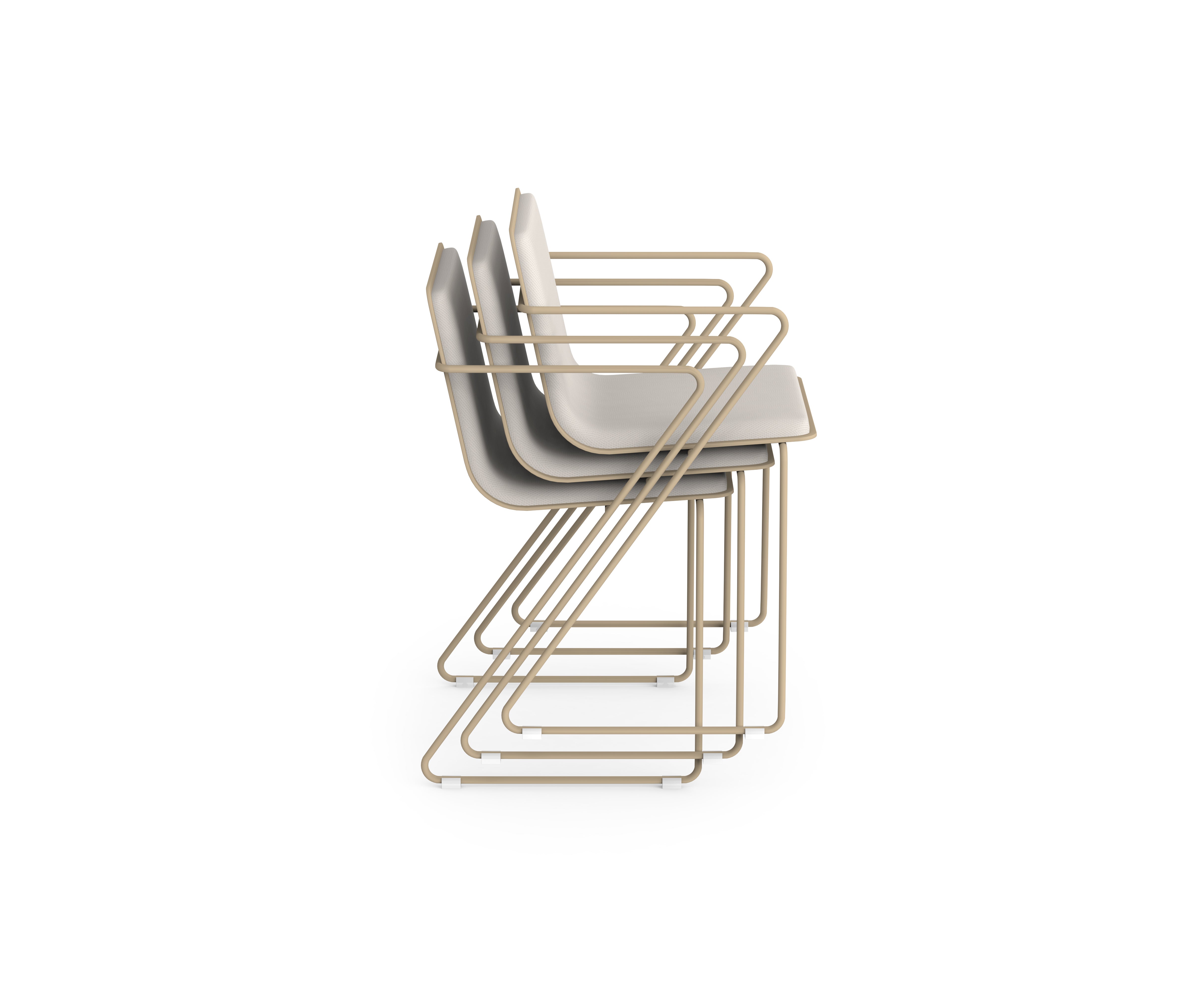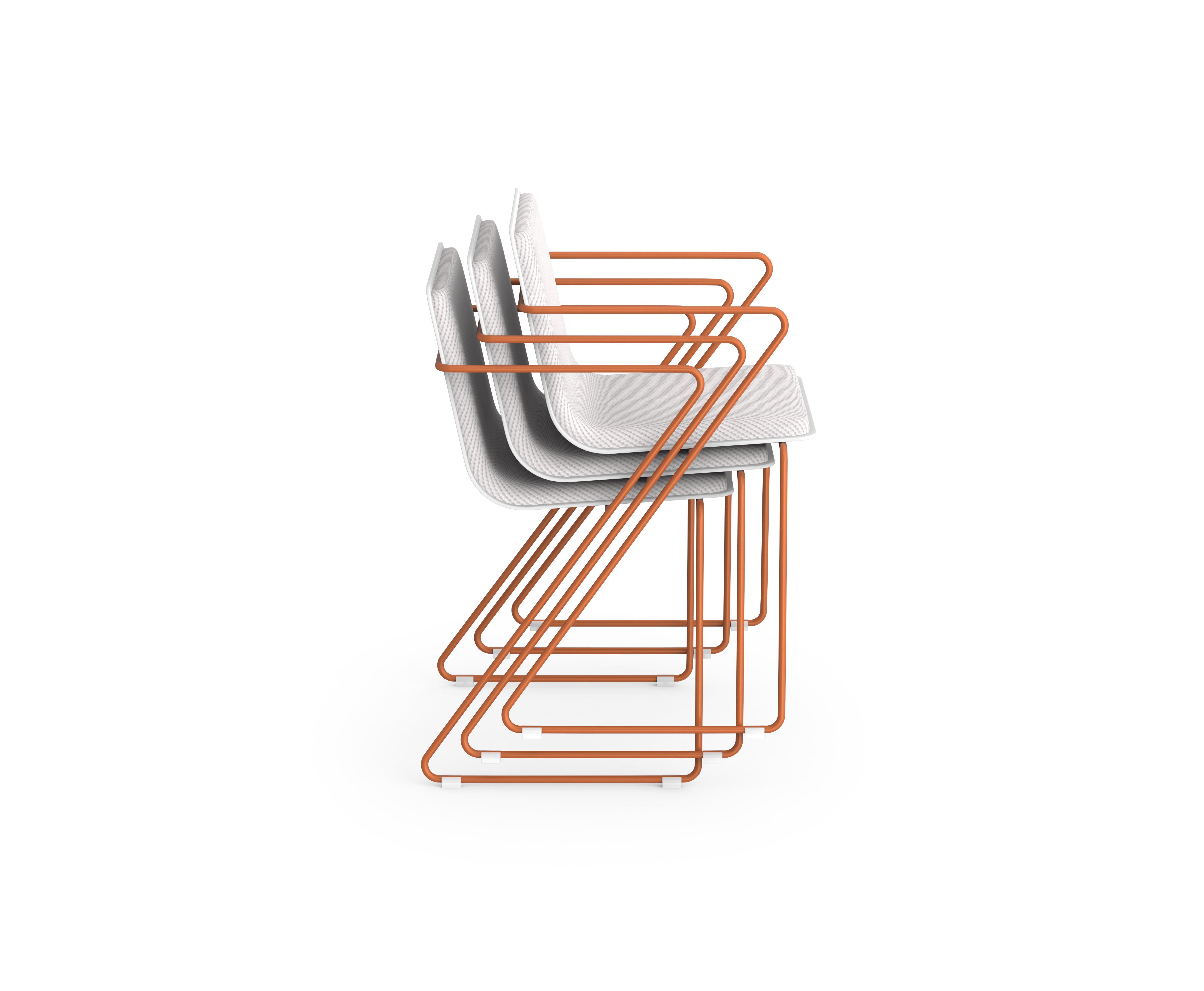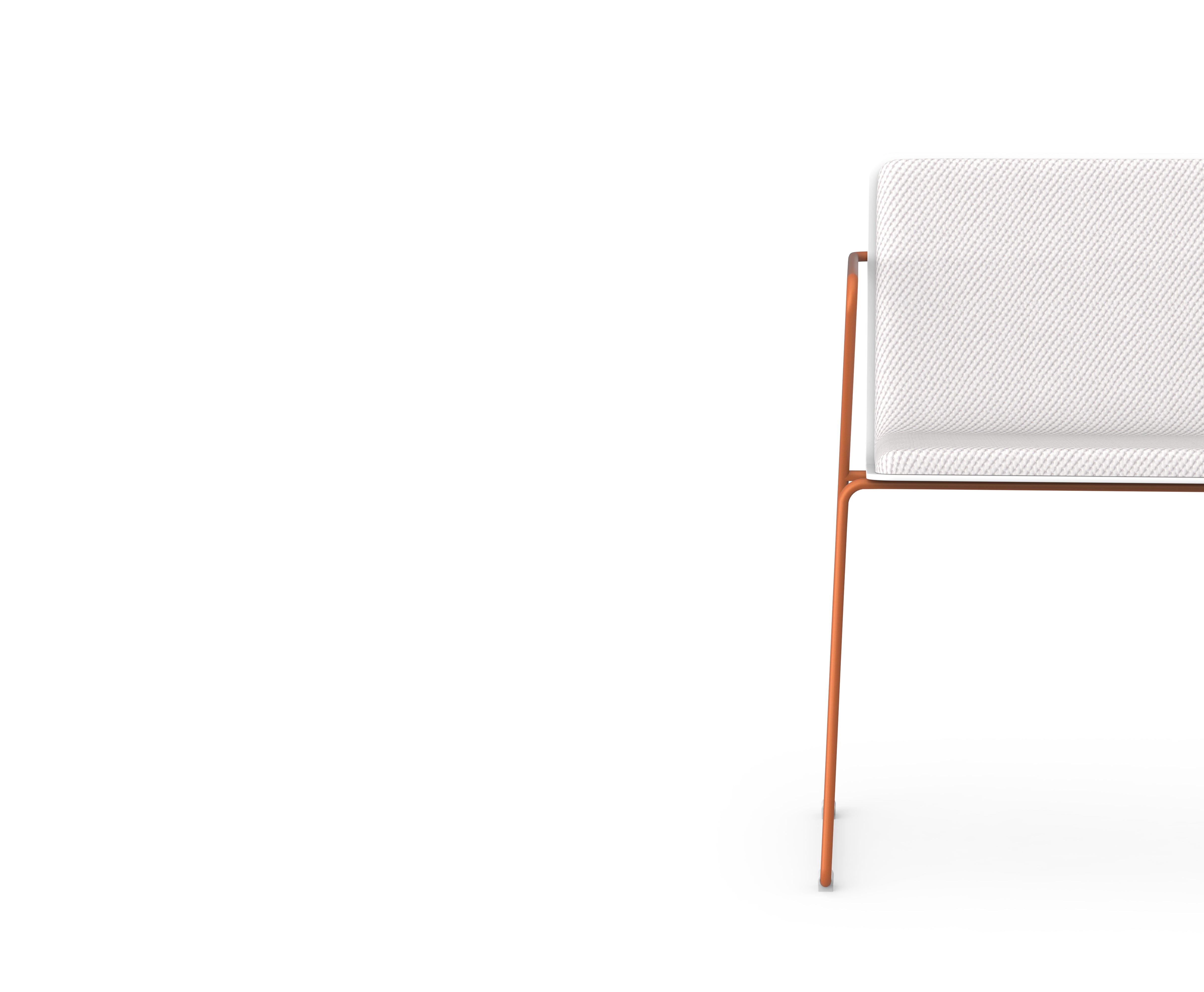 Das formale Konzept basiert auf der Herausforderung, seine Struktur als durchgehende Linie von Anfang bis Ende zu konzipieren. Um dieses leichte und elegante Erscheinungsbild zu erreichen, wurde das Rohrprofil der Struktur so fein wie möglich gestaltet, wodurch eine subtile, einfache Geometrie entstand. Dank seiner Widerstandsfähigkeit und Leichtigkeit eignet er sich ideal für Contract-Projekte (Restaurants, Hotels), den Einzelhandel und Büros, die zeitgemäße, architektonisch gestaltete Möbel suchen, die Vielseitigkeit im Raum garantieren.