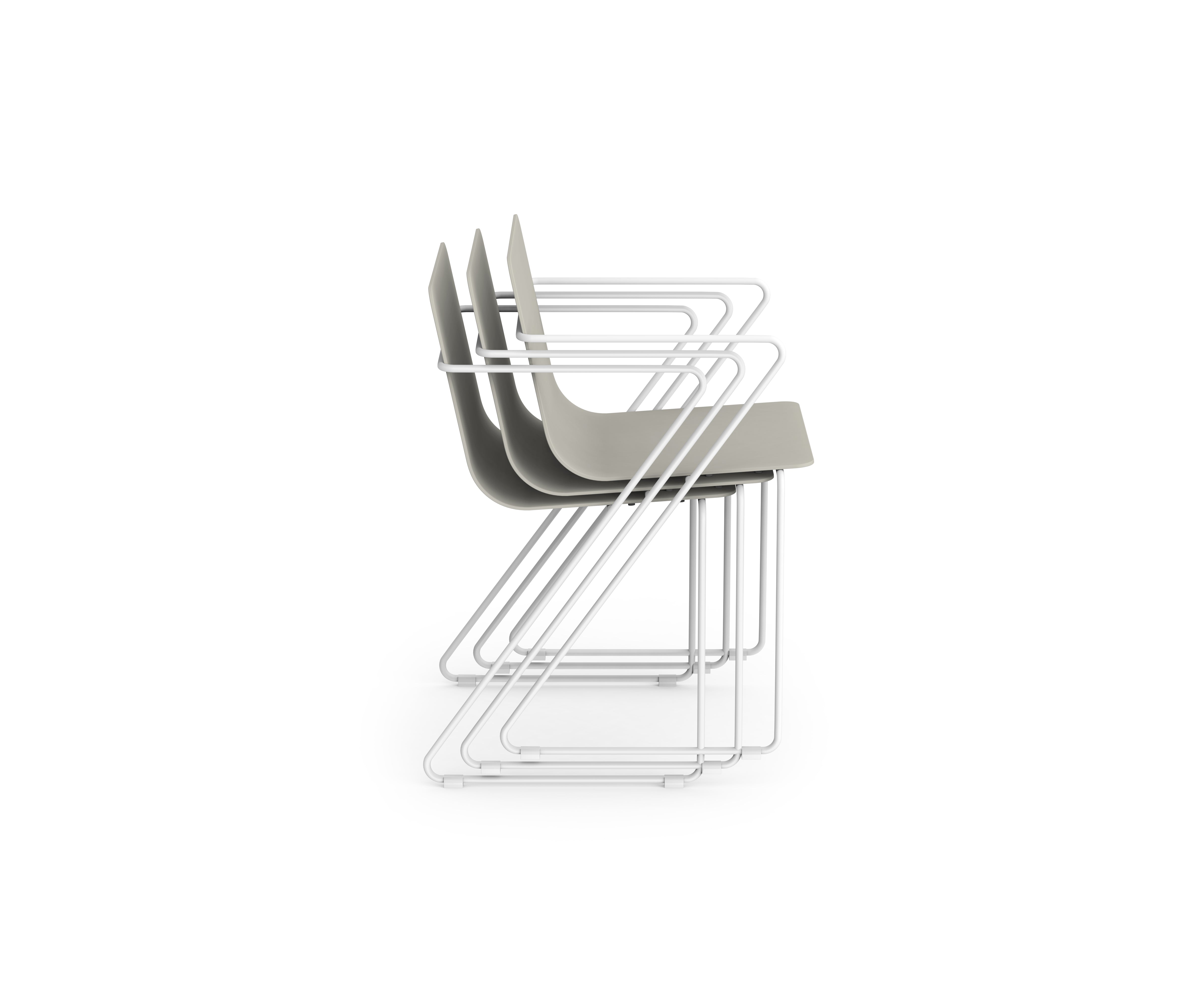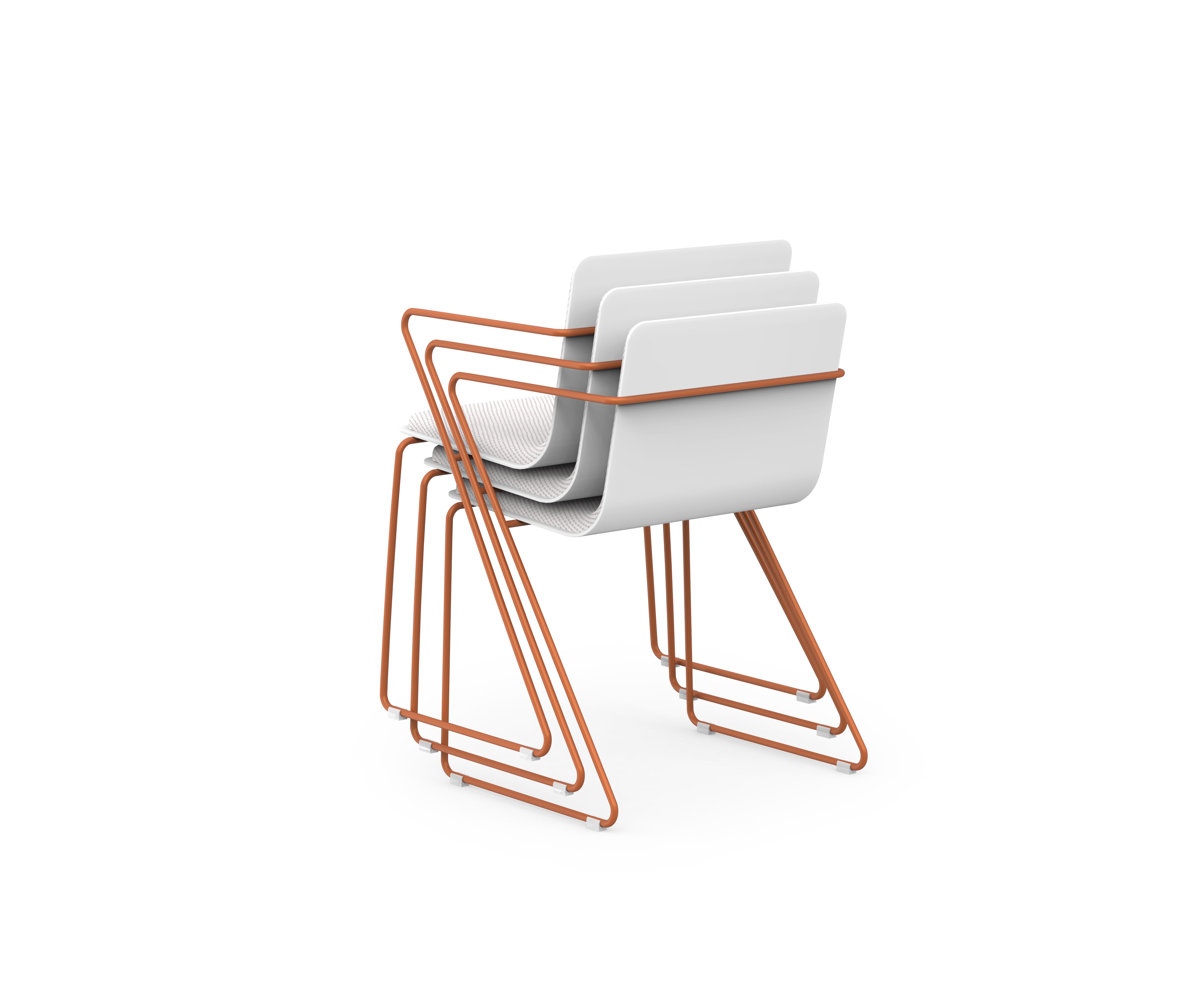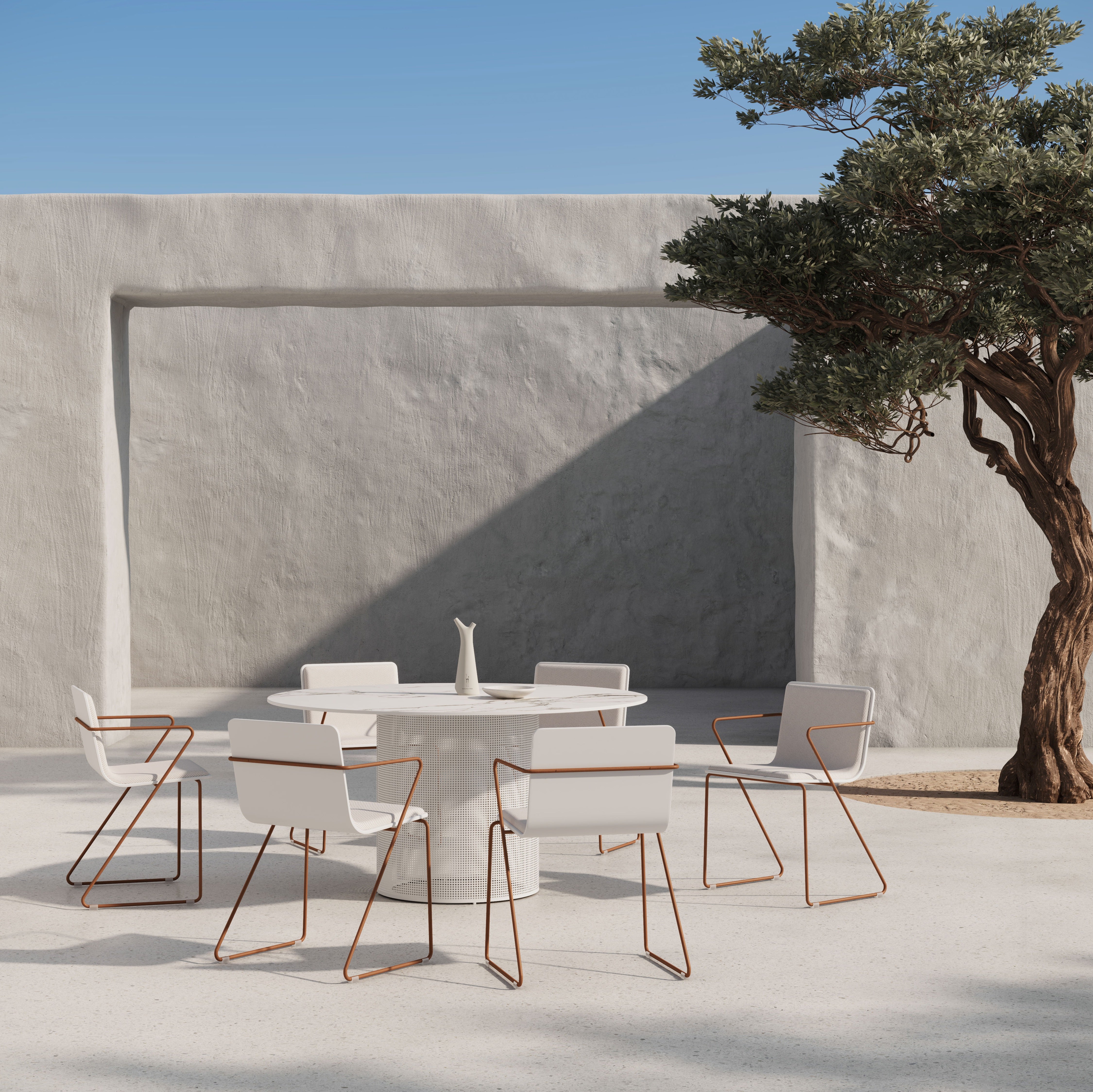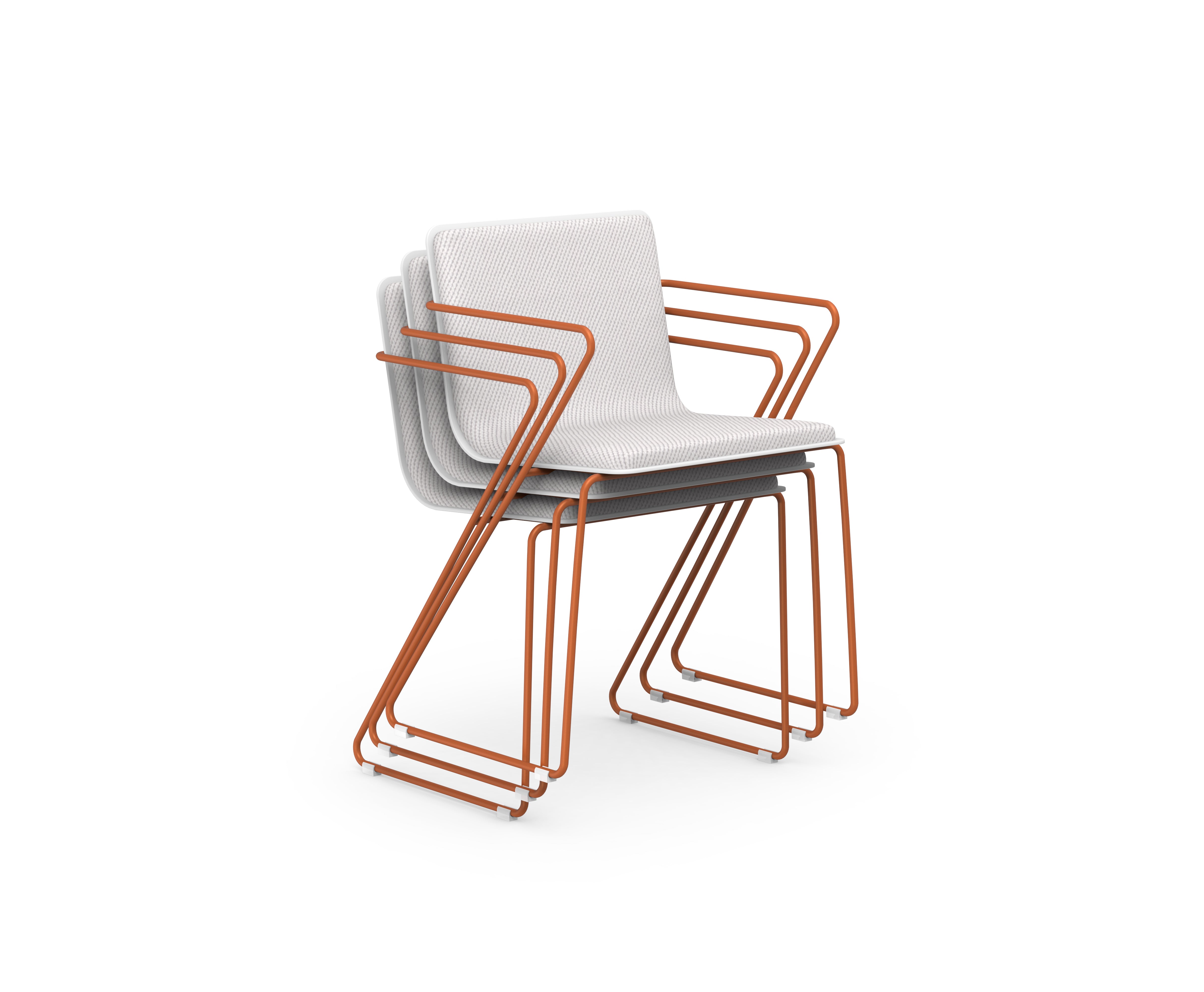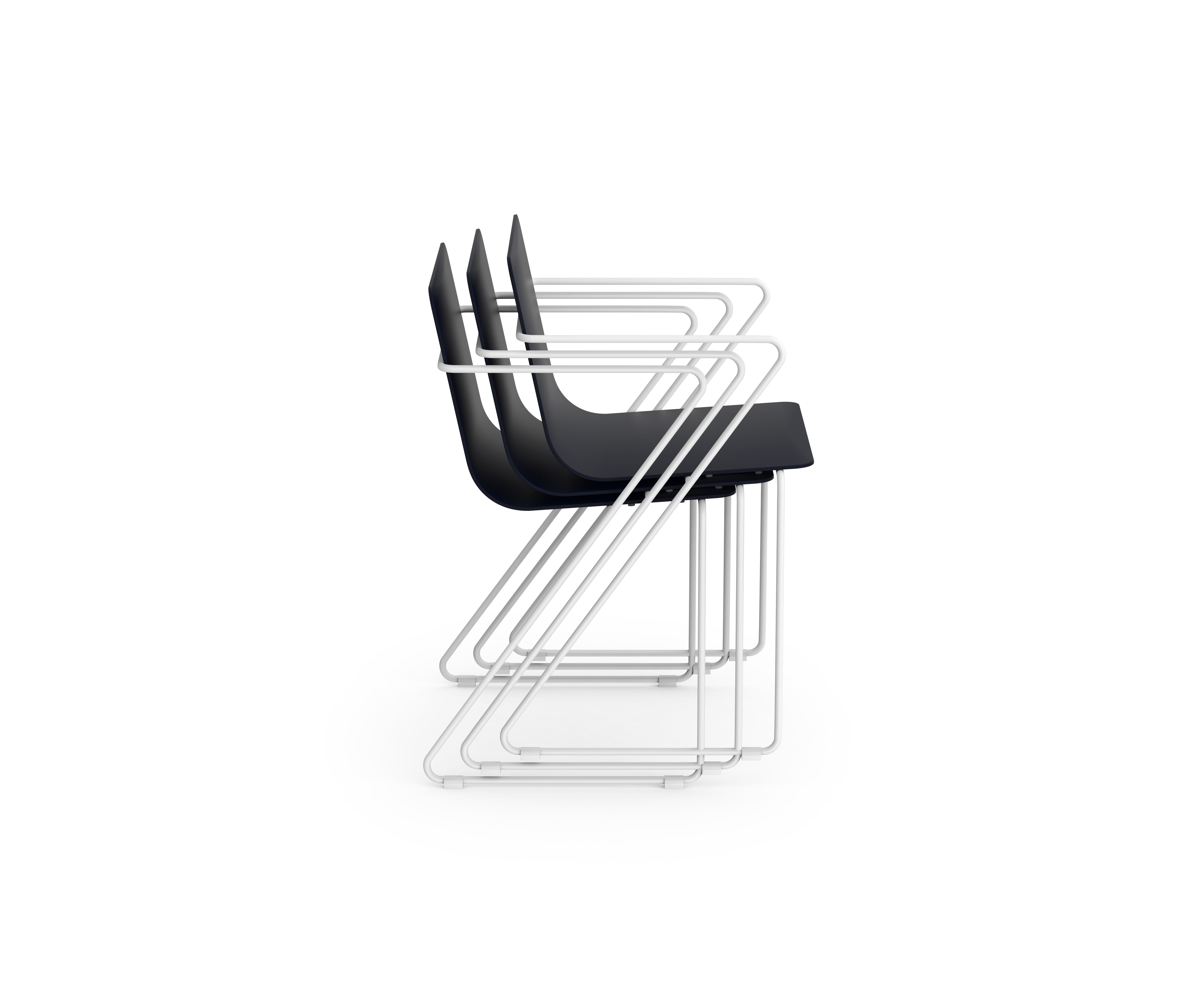 Das formale Konzept basiert auf der Herausforderung, seine Struktur als durchgehende Linie von Anfang bis Ende zu konzipieren. Um dieses leichte und elegante Erscheinungsbild zu erreichen, wurde das Rohrprofil der Struktur so fein wie möglich gestaltet, wodurch eine subtile, einfache Geometrie entstand. Dank seiner Widerstandsfähigkeit und Leichtigkeit eignet er sich ideal für Contract-Projekte (Restaurants, Hotels), den Einzelhandel und Büros, die zeitgemäße, architektonisch gestaltete Möbel suchen, die Vielseitigkeit im Raum garantieren.