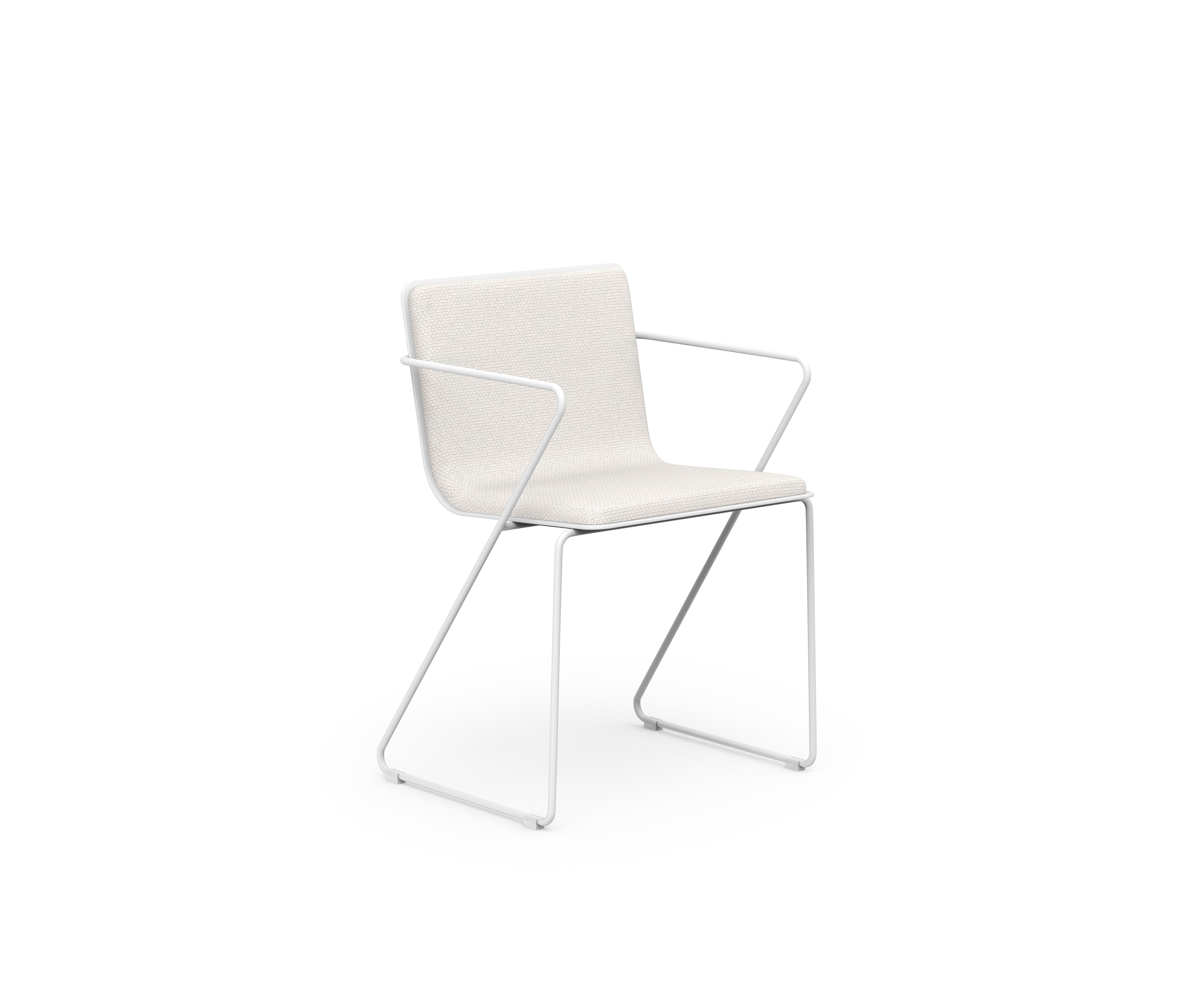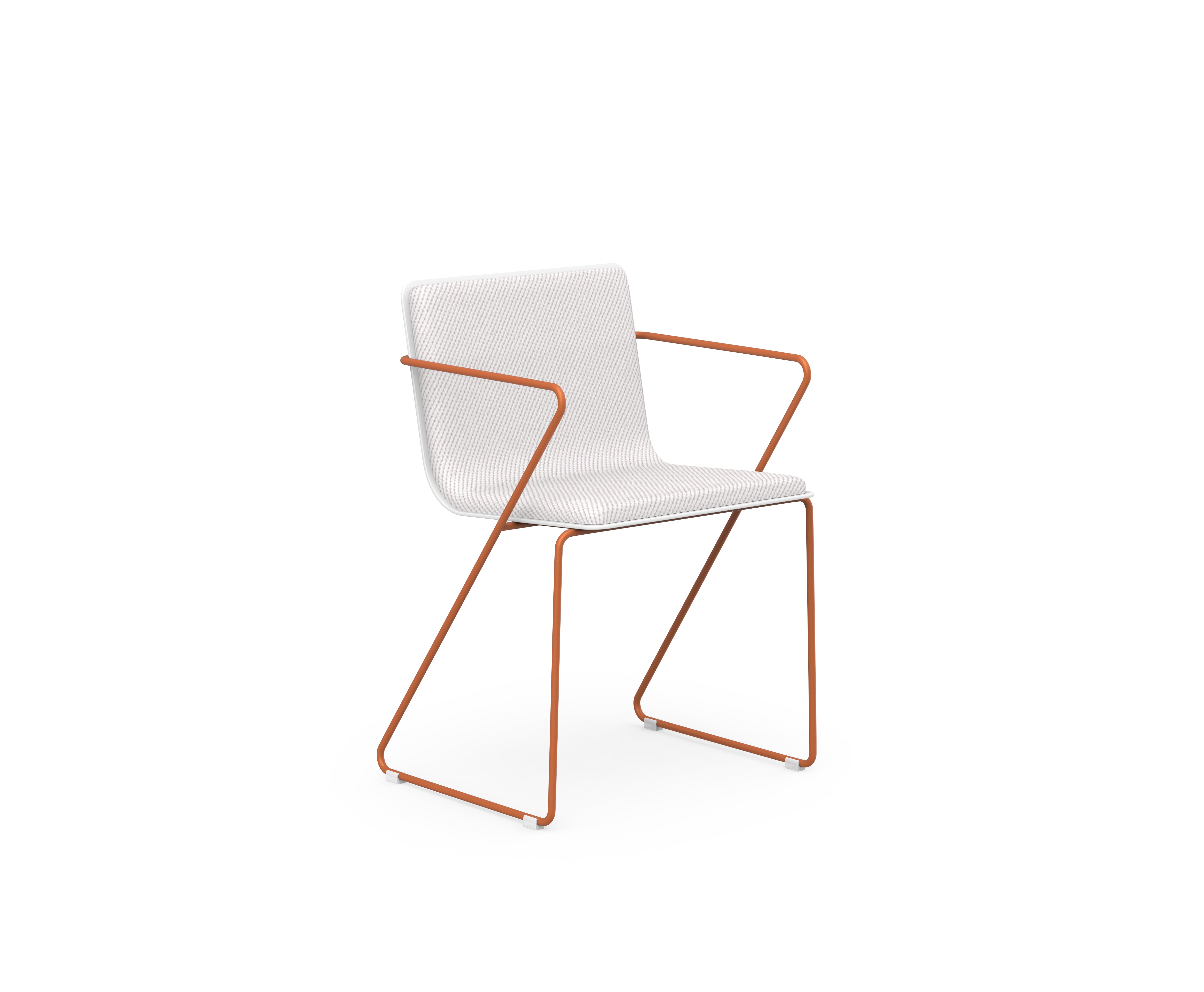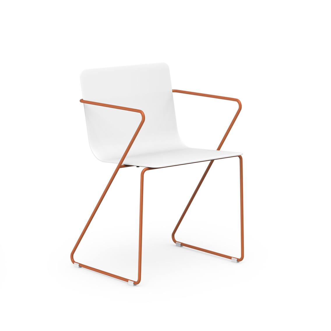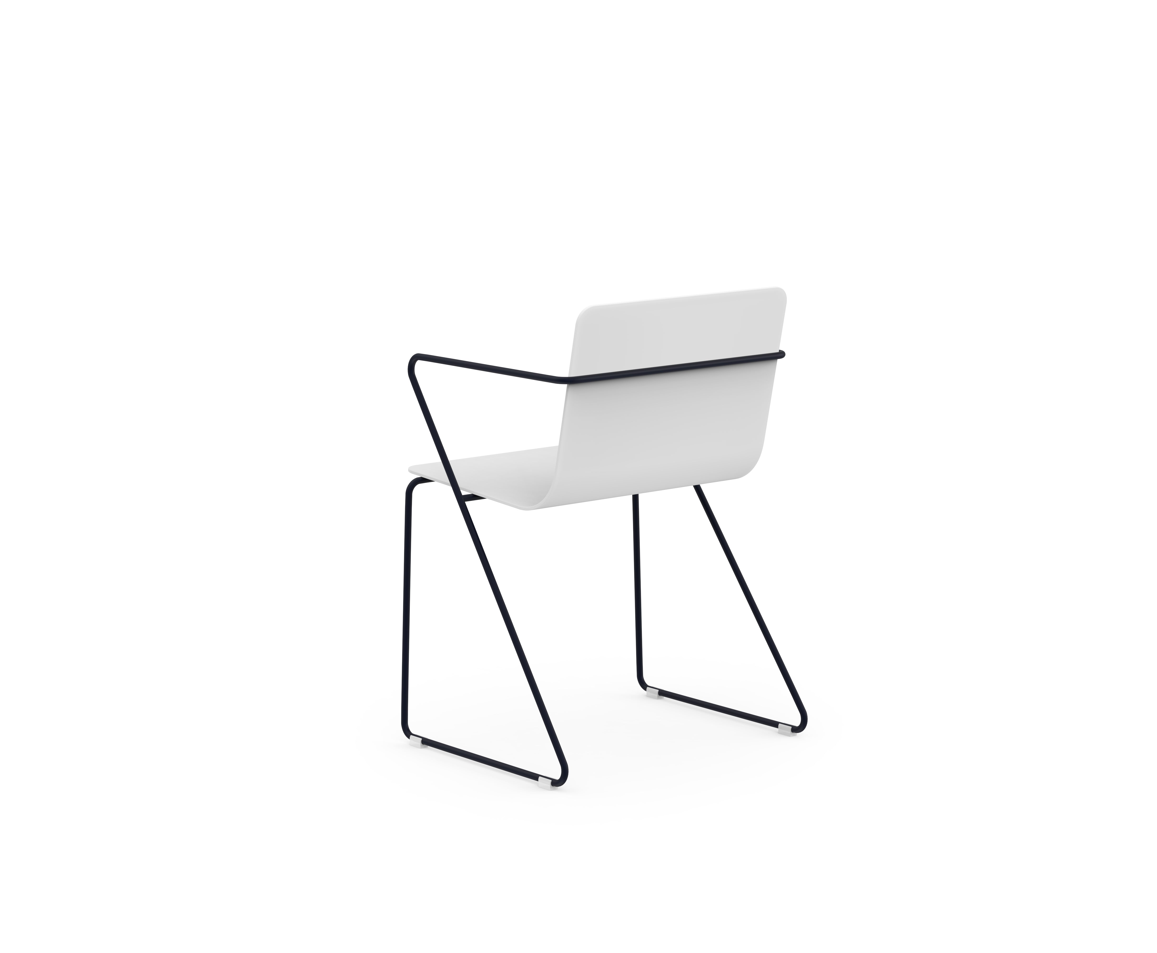 Das formale Konzept basiert auf der Herausforderung, seine Struktur als durchgehende Linie von Anfang bis Ende zu konzipieren. Um dieses leichte und elegante Erscheinungsbild zu erreichen, wurde das Rohrprofil der Struktur so fein wie möglich gestaltet, wodurch eine subtile, einfache Geometrie entstand. Dank seiner Widerstandsfähigkeit und Leichtigkeit eignet er sich ideal für Contract-Projekte (Restaurants, Hotels), den Einzelhandel und Büros, die zeitgemäße, architektonisch gestaltete Möbel suchen, die Vielseitigkeit im Raum garantieren.