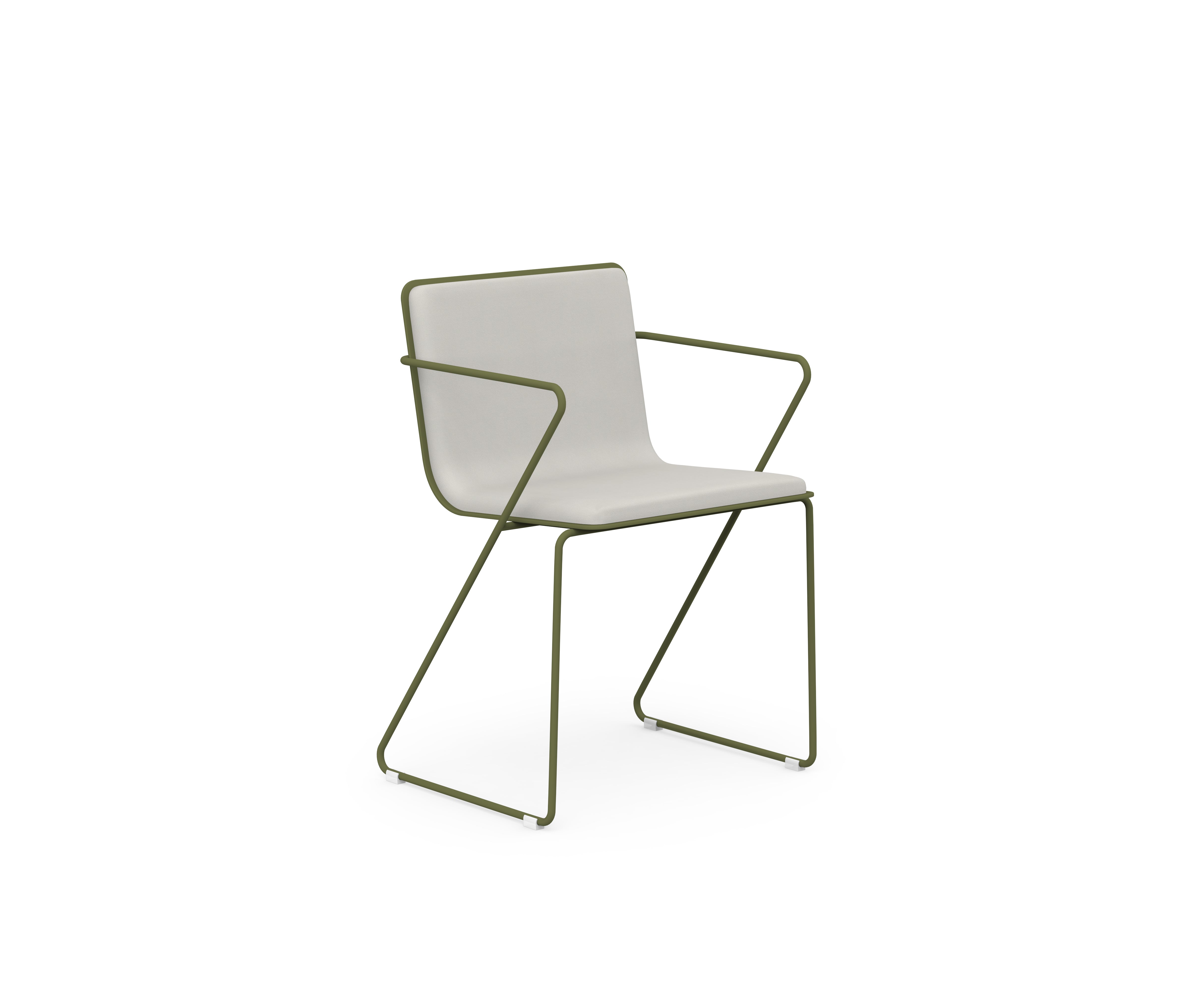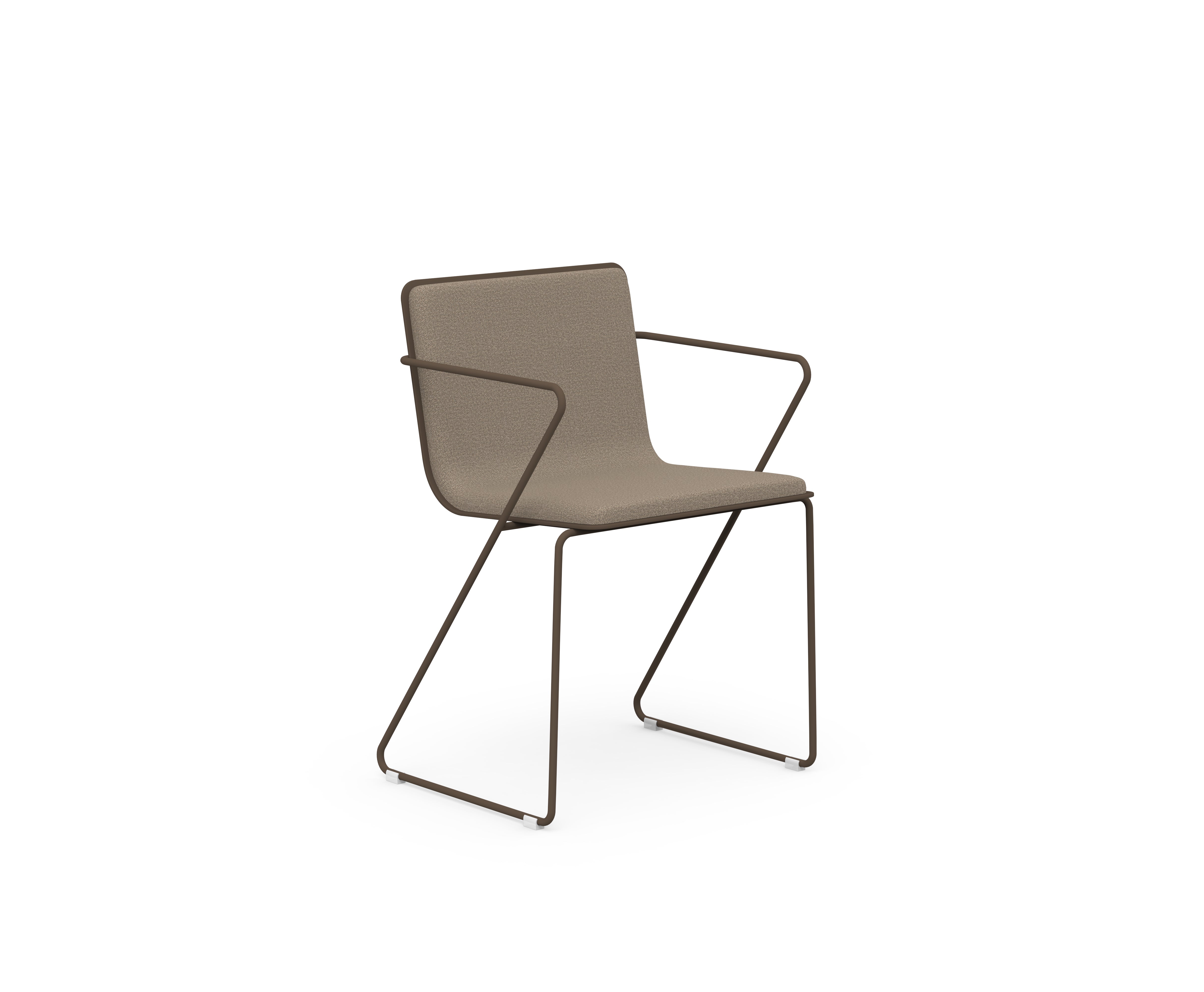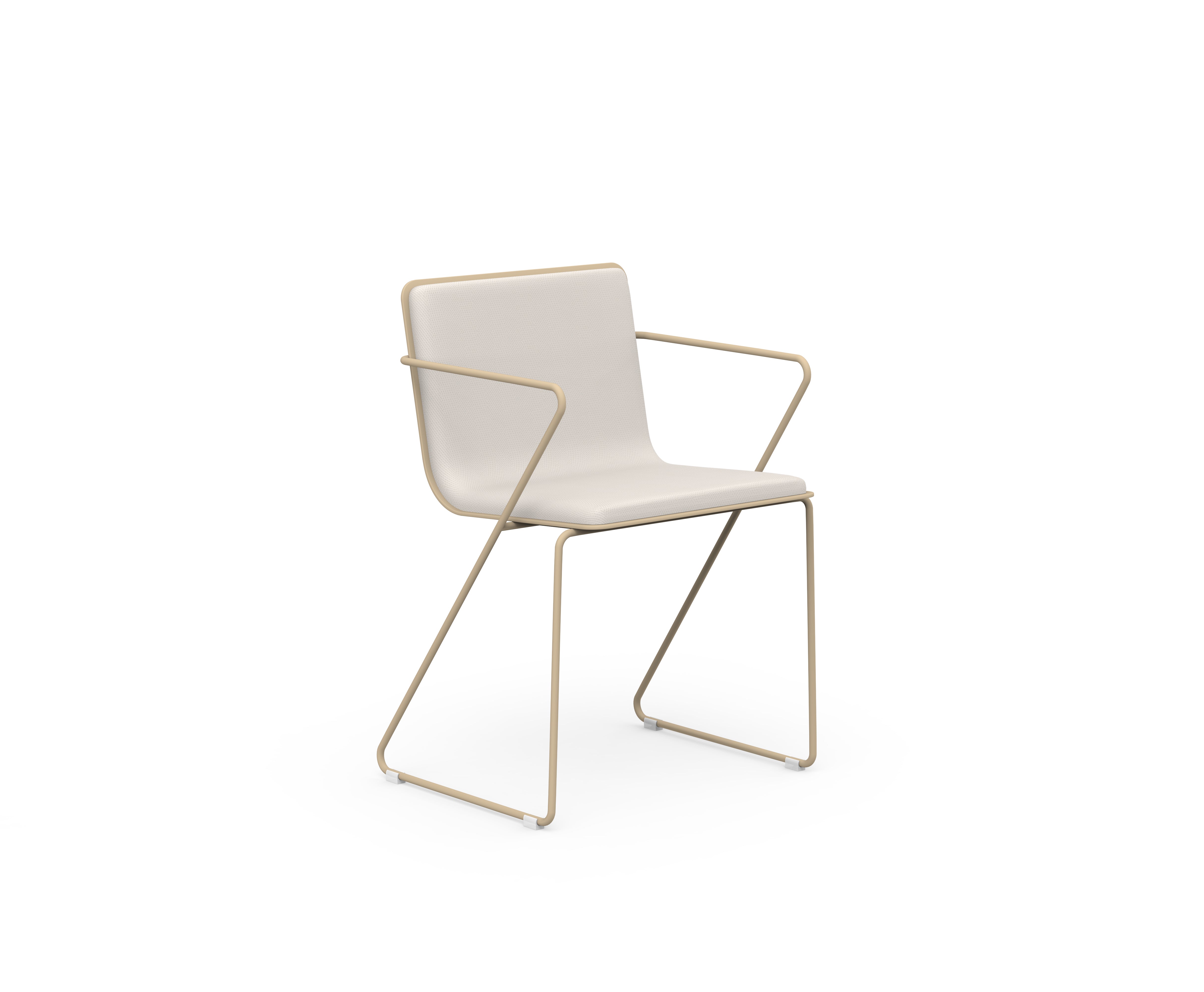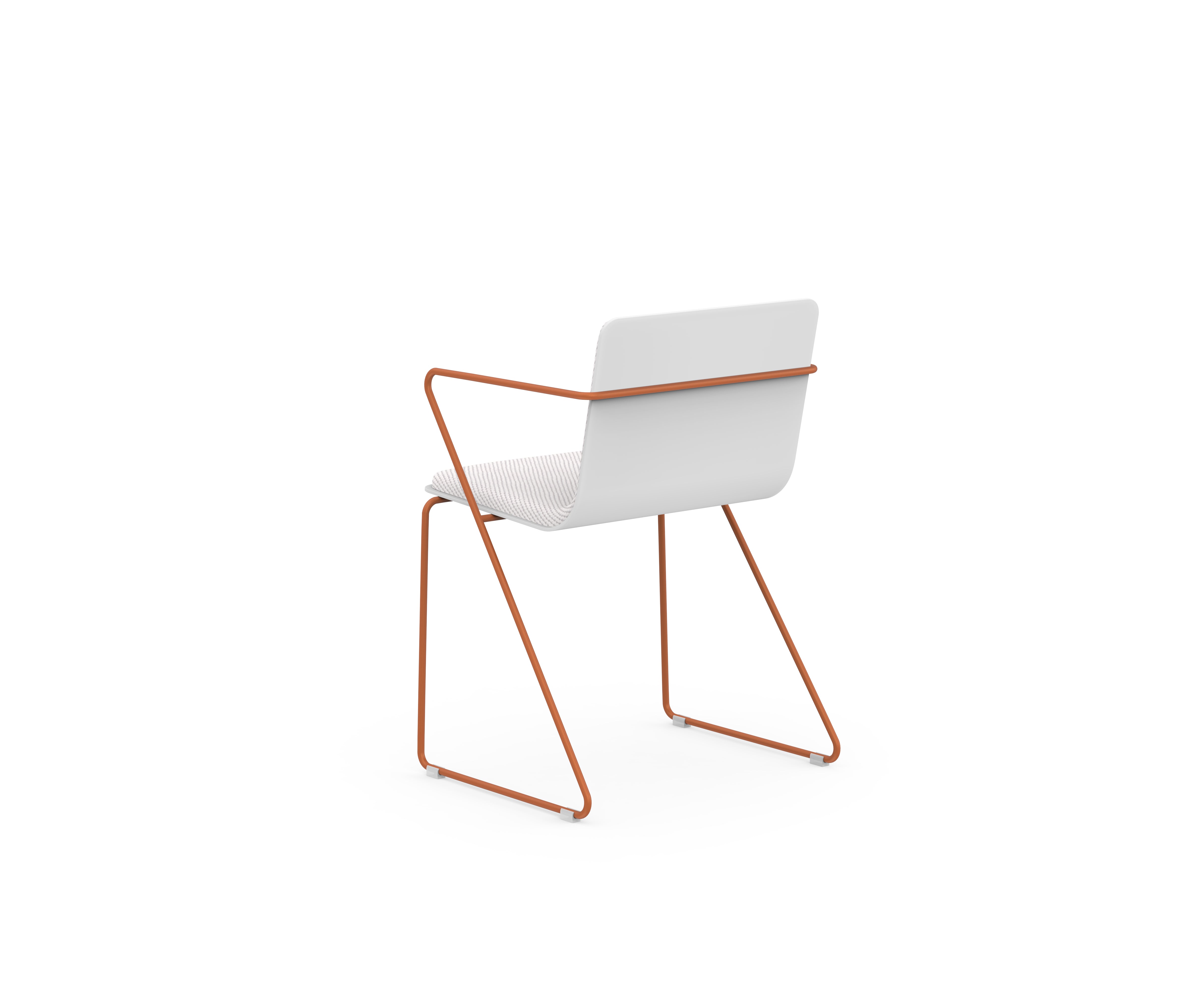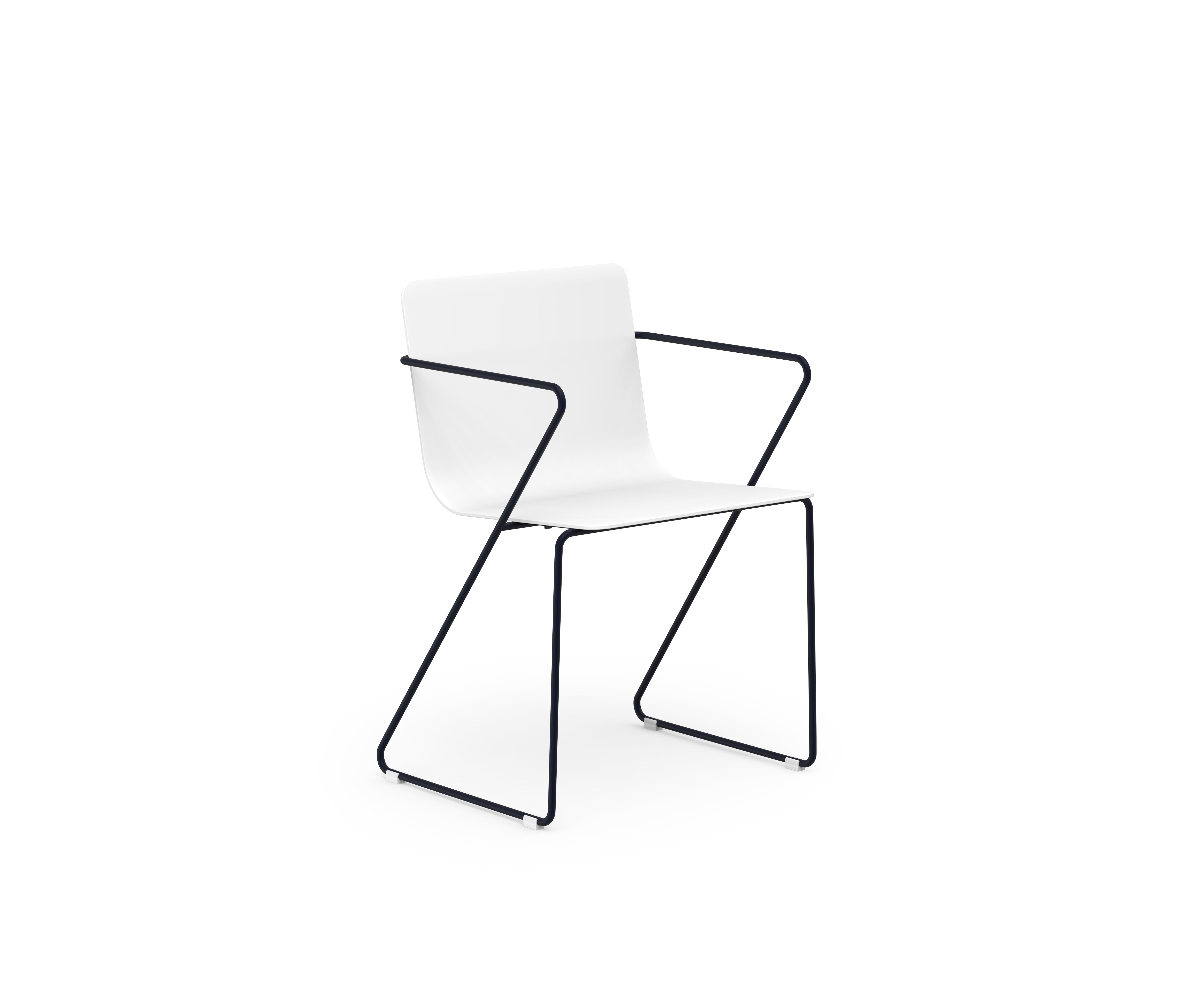 Das formale Konzept basiert auf der Herausforderung, seine Struktur als durchgehende Linie von Anfang bis Ende zu konzipieren. Um dieses leichte und elegante Erscheinungsbild zu erreichen, wurde das Rohrprofil der Struktur so fein wie möglich gestaltet, wodurch eine subtile, einfache Geometrie entstand. Dank seiner Widerstandsfähigkeit und Leichtigkeit eignet er sich ideal für Contract-Projekte (Restaurants, Hotels), den Einzelhandel und Büros, die zeitgemäße, architektonisch gestaltete Möbel suchen, die Vielseitigkeit im Raum garantieren.