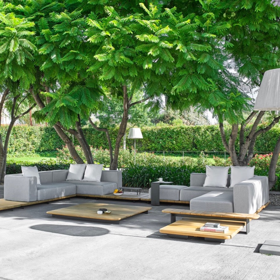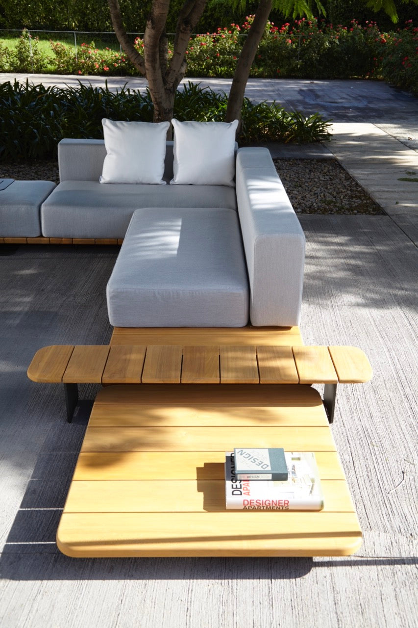 Beistelltisch 138x28 cm. Aluminiumstruktur in Metallic Grey 56 epoxilackiert Abdeckung aus Teakholz aus Burma