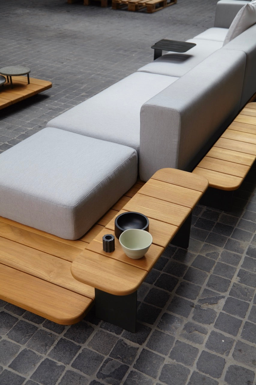 2 Sitzer Sofa Basis 184 x 92 aus Teakholz von Burma mit Beinen aus epoxylackiertem Aluminium Farbe Metallic Grey 56, Sitzkissen aus Schaumstoff von 35 kg. Mit undurchlässigem Innenbezug und Außenbezug mit Stoffen der Point Musterpalette. Sie können die Kissen auch ohne Stoff oder mit Ihrem eigenen Stoff kaufen.