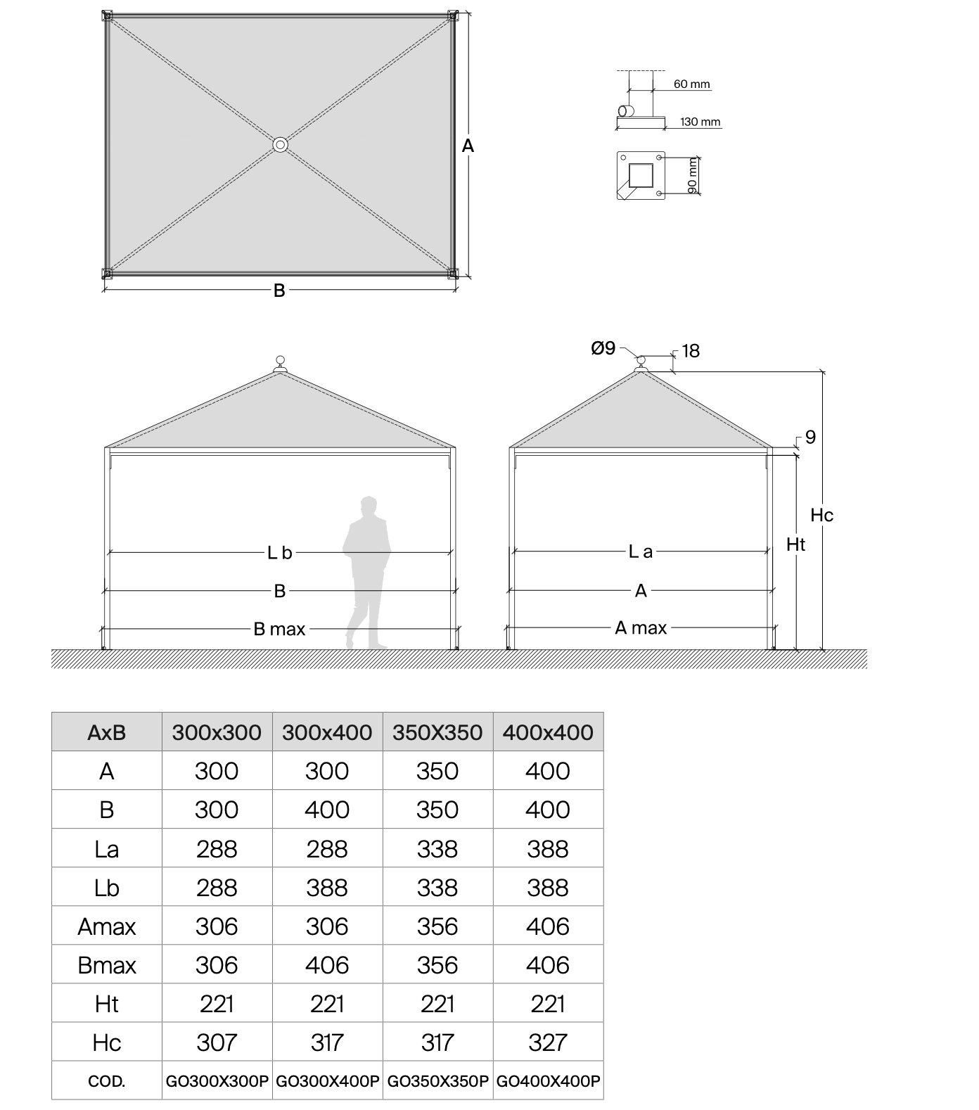 Ein Ottoemezzo Maxi hat klare Linien und ist so dimensioniert, dass er Flächen bis zu 6 x 6m abdeckt. Es eignet sich sowohl für die Unterbringung in Wohn- als auch in Geschäftsräumen. Das Regenwasser wird innerhalb des Begrenzungsbalkens gesammelt und fließt durch die Pfeiler.