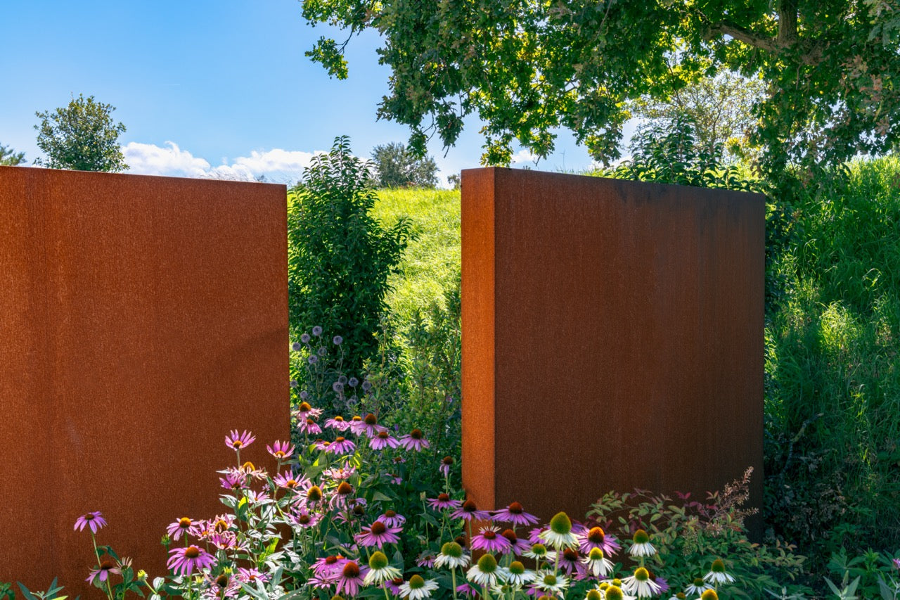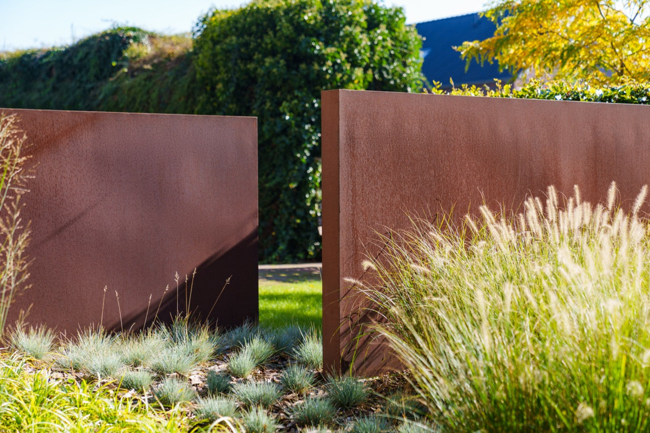 Cortenstahl ist eine Metalllegierung, die aus Eisen besteht, dem Kupfer, Phosphor, Silizium, Nickel und Chrom zugesetzt sind. Wenn das Material der Außenluft ausgesetzt wird, überzieht es sich im Laufe der Zeit mit einer schützenden Rostschicht. Diese natürliche Rostschicht bildet den Schutz vor weiterer Korrosion. Dadurch hat die Wand eine lange Lebensdauer.