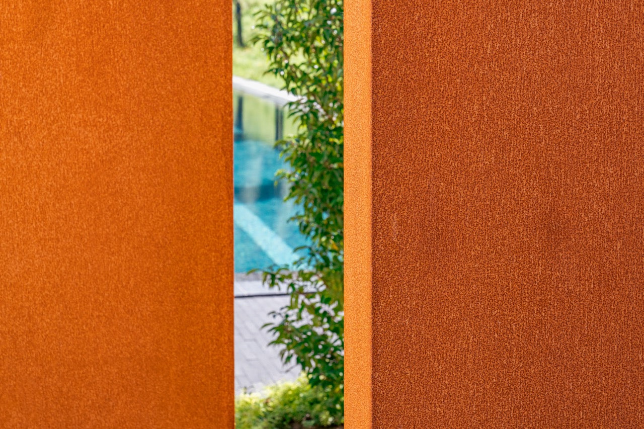 Die Farbe des Materials ist orange-braun und verleiht der Wand ein warmes und kraftvolles Aussehen. Diese Farbe entsteht durch eine natürliche Rostschicht. Ein anderer Name für Cortenstahl ist wetterfester Stahl: Witterungsbedingungen haben nämlich einen positiven Einfluss auf diese Wand.