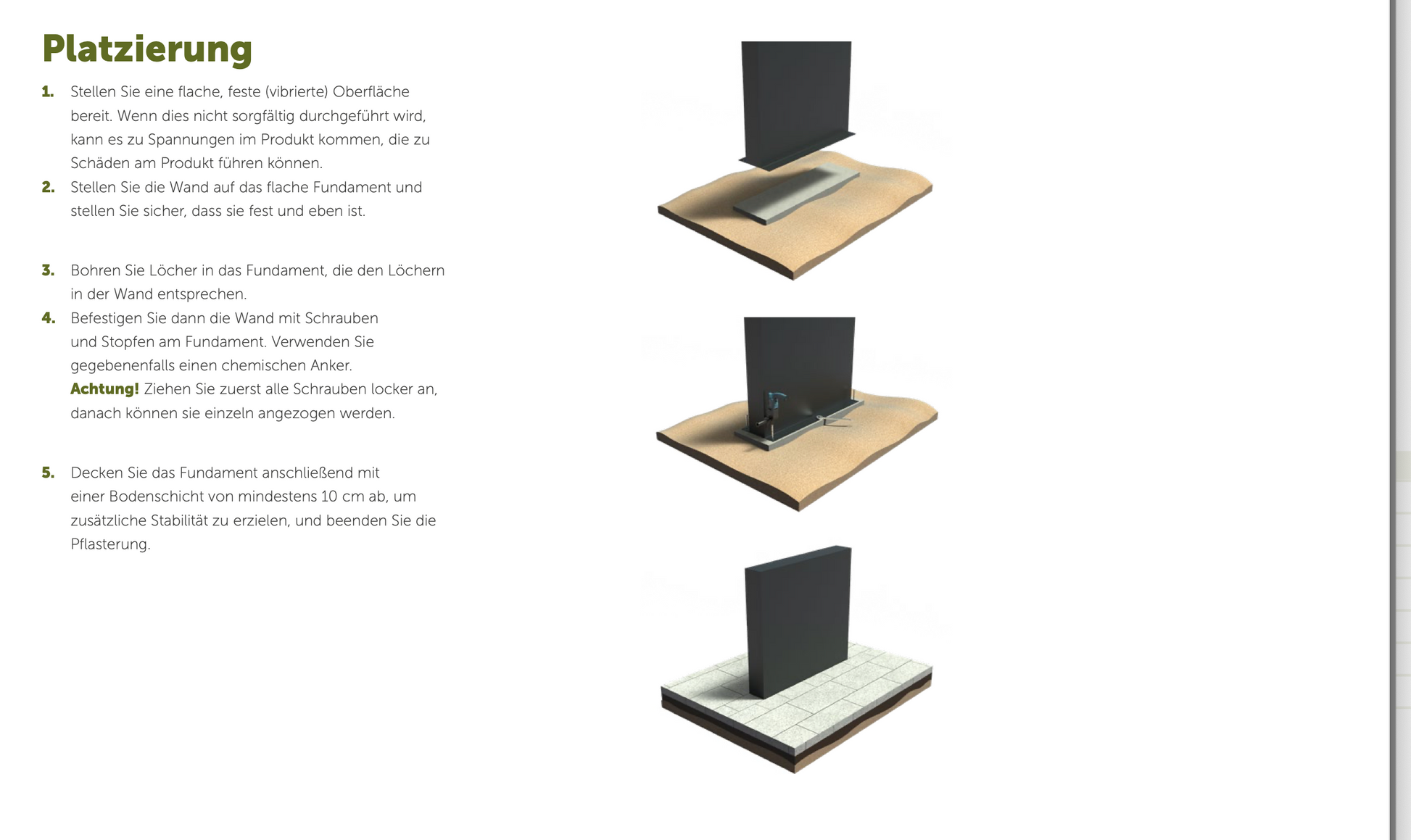 - Vergewissern Sie sich, dass die Wand gut im oder auf dem Untergrund befestigt ist. Die Wände haben an der Unterseite auf beiden Seiten einen umlaufenden Rand von ca. 5 cm zur Befestigung auf einem festen Untergrund.