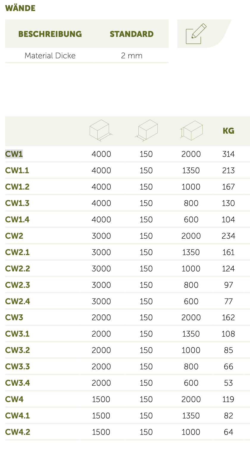 CW1 (4000x150x2000 mm),CW1.1 (4000x150x1350 mm),CW1.2 (4000x150x1000 mm),CW1.3 (4000x150x800 mm),CW1.4 (4000x150x600 mm),CW2 (3000x150x2000 mm),CW2.1 (3000x150x1350 mm),CW2.2 (3000x150x1000 mm),CW2.3 (3000x150x800 mm),CW2.4 (3000x150x600 mm),CW3 (2000x150x2000 mm),CW3.1 (2000x150x1350 mm),CW3.2 (2000x150x1000 mm),CW3.3 (2000x150x800 mm),CW3.4 (2000x150x600 mm),CW4 (1500x150x2000 mm),CW4.1 (1500x150x1350 mm),CW4.2 (1500x150x1000 mm),CW4.3 (1500x150x800 mm),CW4.4 (1500x150x600 mm),CW5 (1000x150x2000 mm),CW5.1 (1000x150x1350 mm),CW5.2 (1000x150x1000 mm),CW5.3 (1000x150x800 mm),CW5.4 (1000x150x600 mm)