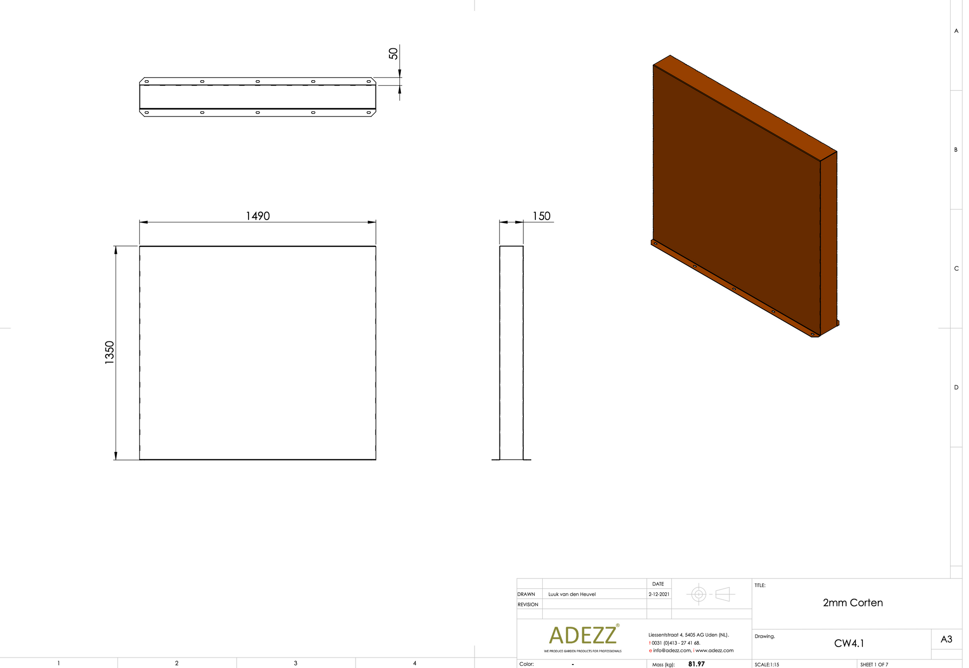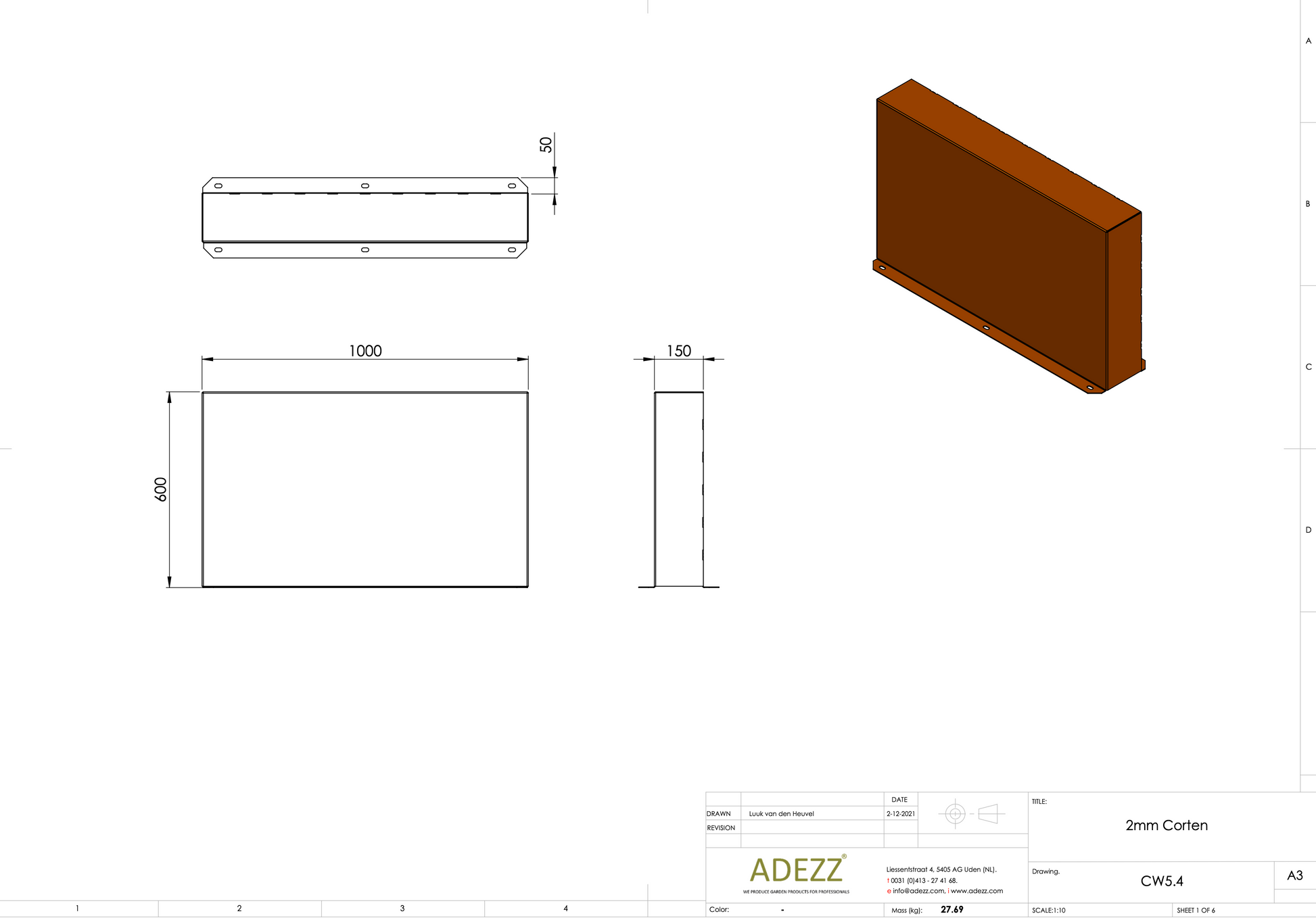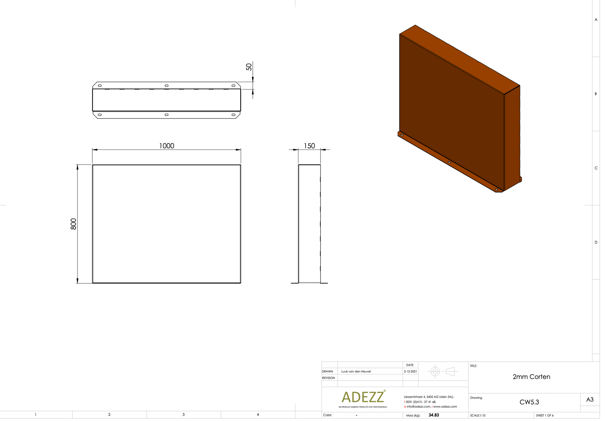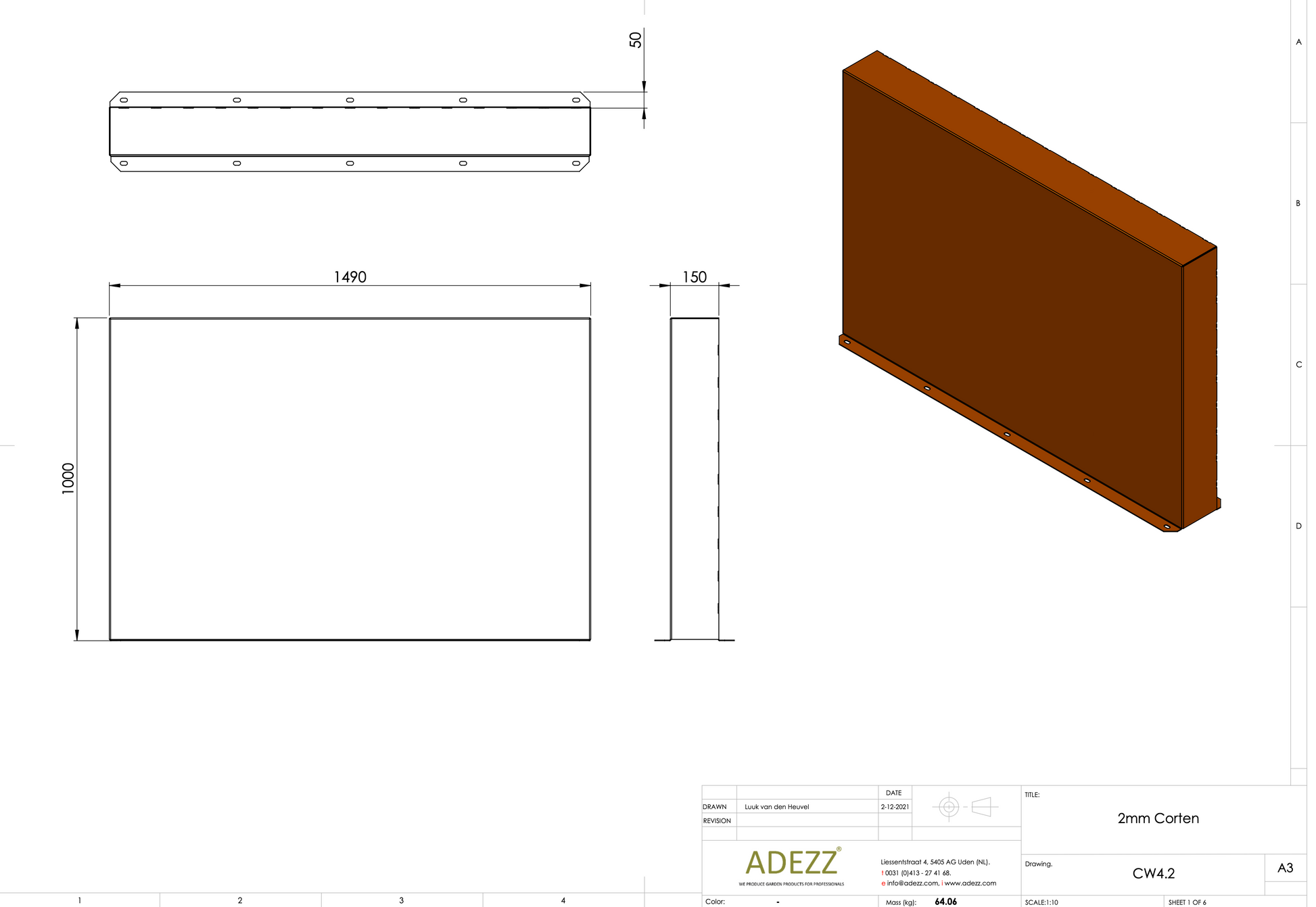 Material: Cortenstahl Breite: 1000-4000 mm Tiefe: 150 mm Höhe: 600-2000 mm Material Dicke: 2 mm
