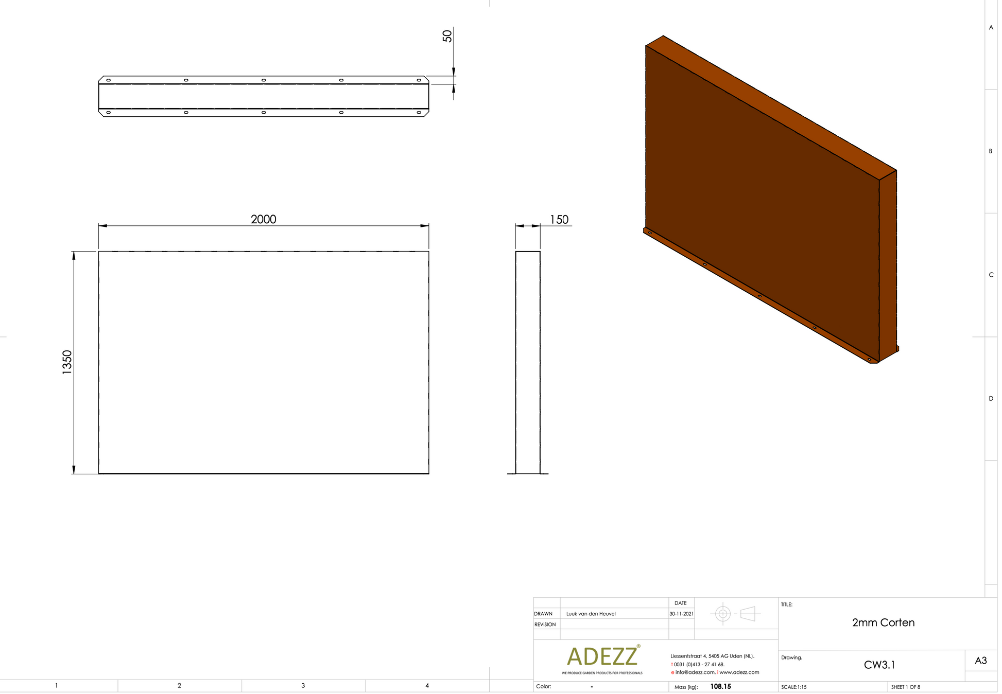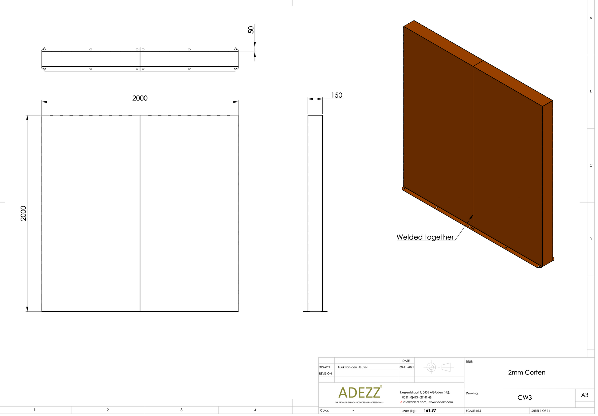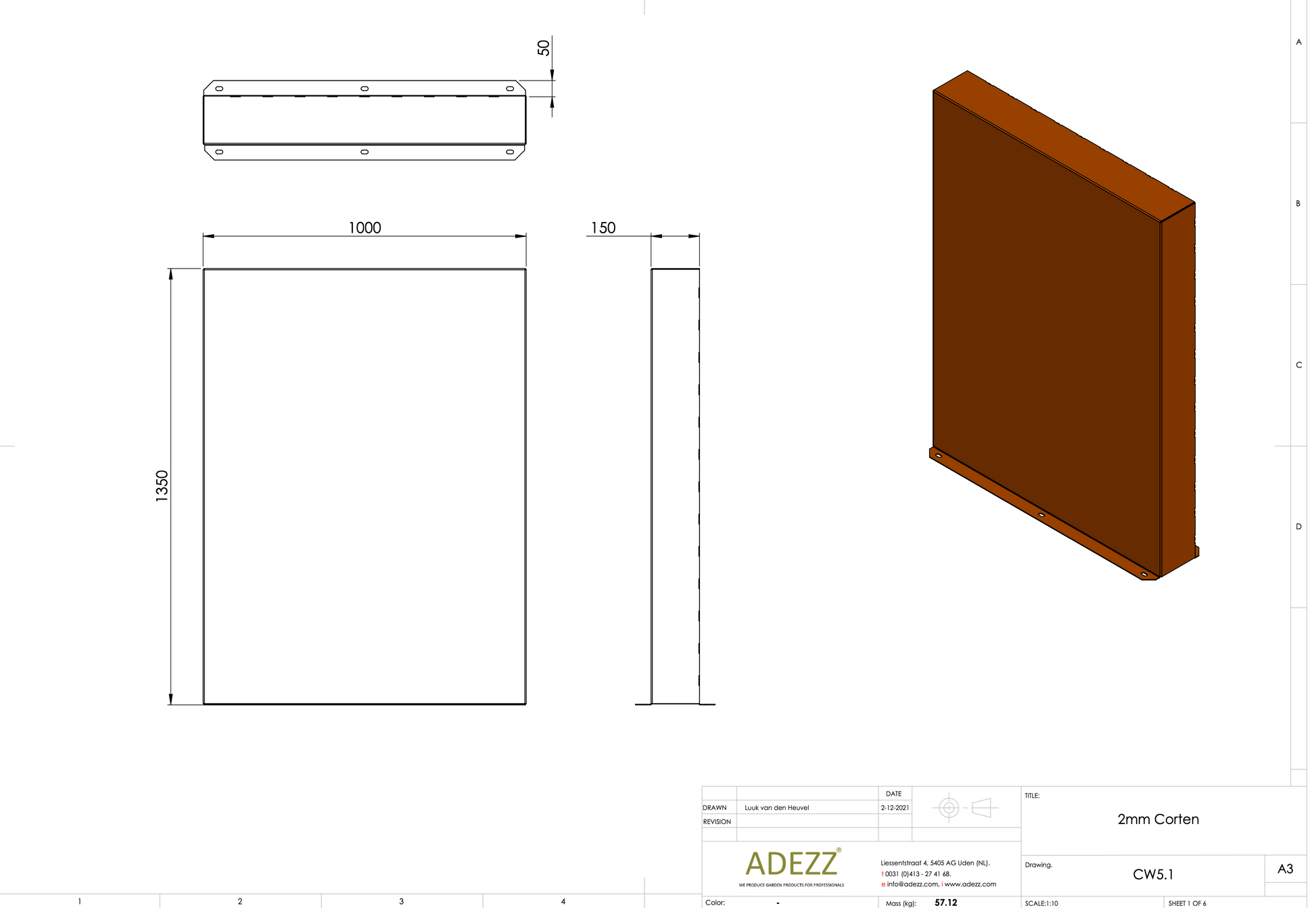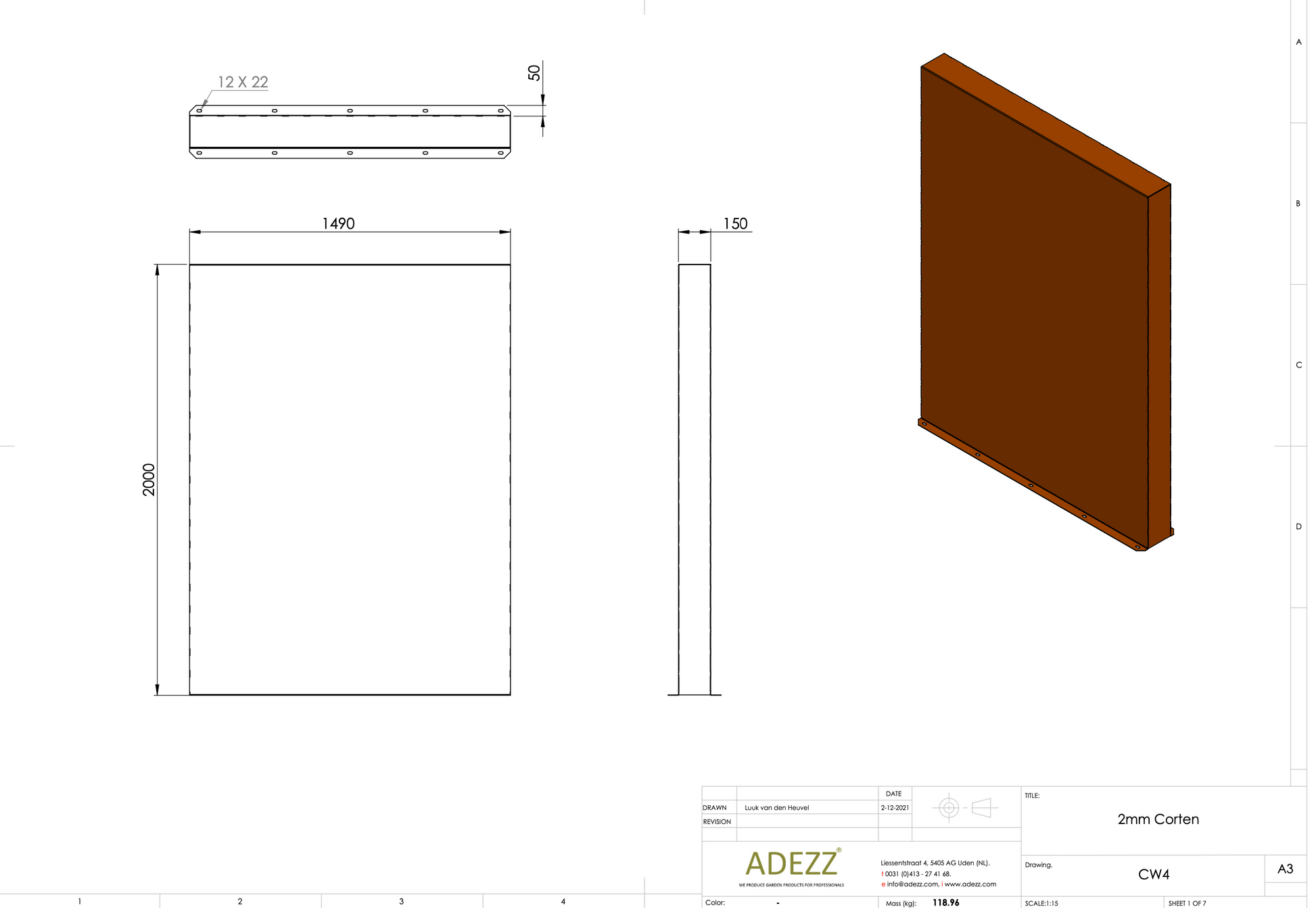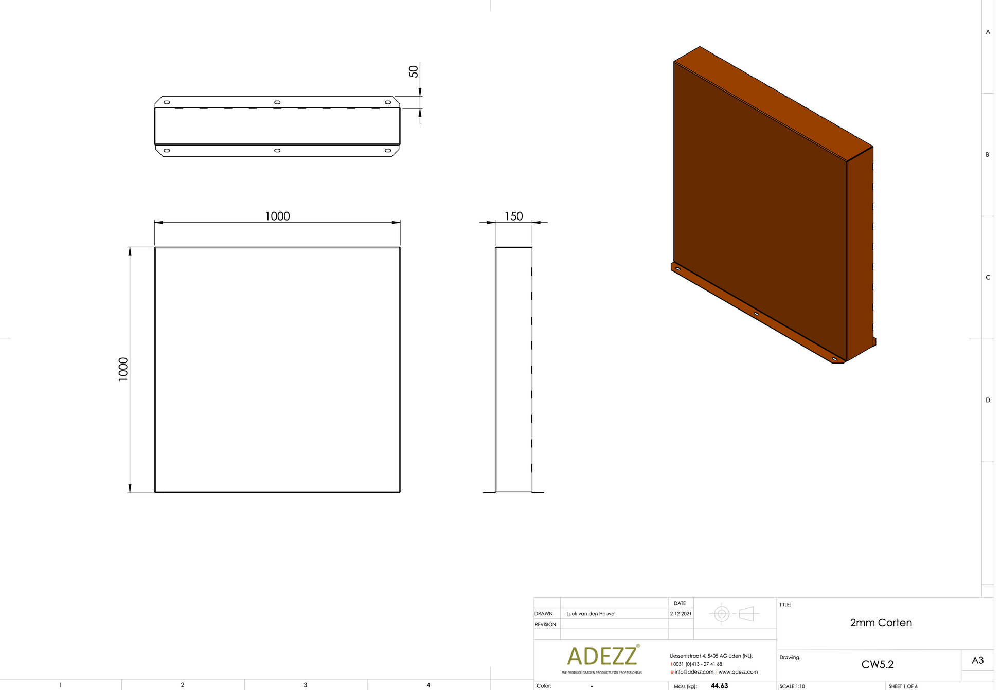 Material: Cortenstahl Breite: 1000-4000 mm Tiefe: 150 mm Höhe: 600-2000 mm Material Dicke: 2 mm