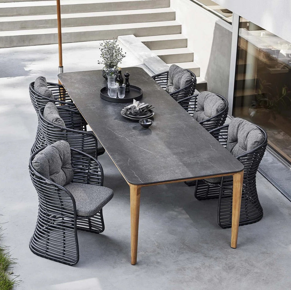 Aspect 210x100 cm ist ein Tisch in strapazierfähigen und eleganten Materialien in absoluter Sonderklasse. Aspect kombiniert die Wärme von Teakholz mit stilvoller und solider Keramik. Entworfen wurde Aspect vom Cane-line Design, mit dem Ziel eine einzigartige Tisch-Serie zu entwerfen, die zur wachsenden Kollektion der High-End Stühle für den Außenbereich passen. Aspect ist mit einem Rahmen aus Cane-line Teakholz, einem soliden Aluminiumkern und einer stilvollen, keramischen Tischplatte hergestellt. Cane-line teak ist genehmigt und bewaldet gemäß dem SVLK Zertifizierungssystem.