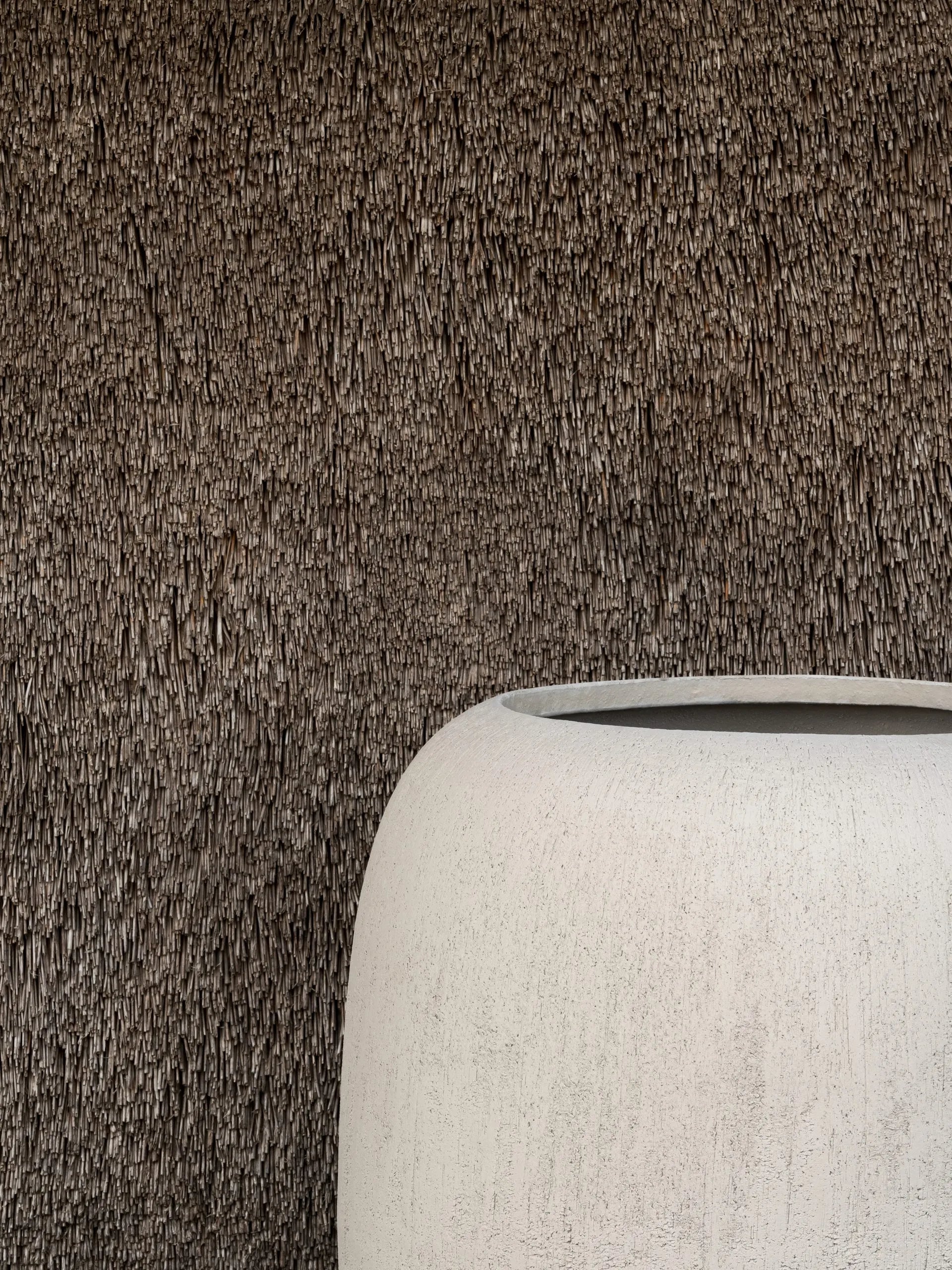 Domani Melides Topf Ø100cm in Travertine auf Terrasse bei Sonnenlicht