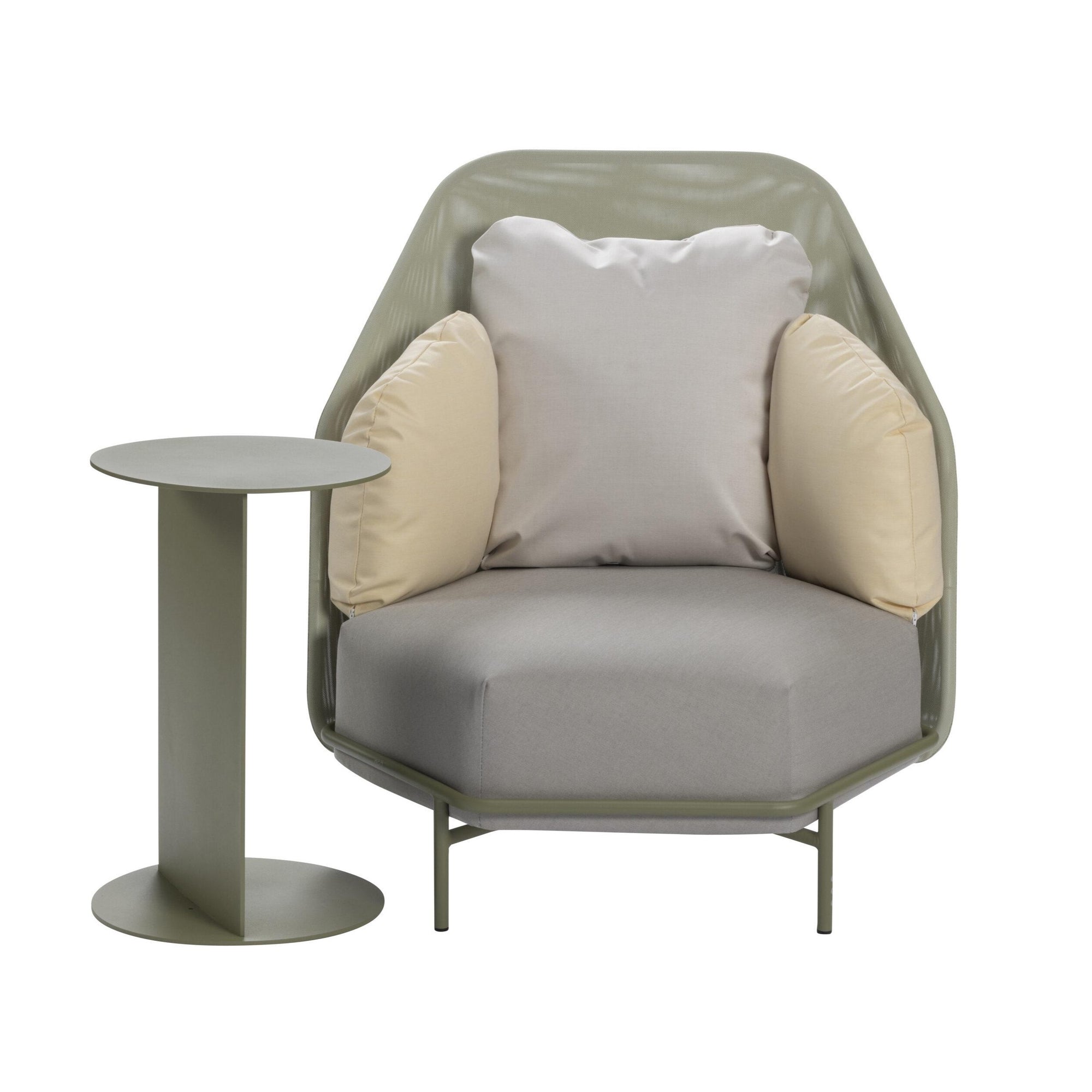 Der Beistelltisch besteht aus pulverbeschichtetem Aluminiumblech.