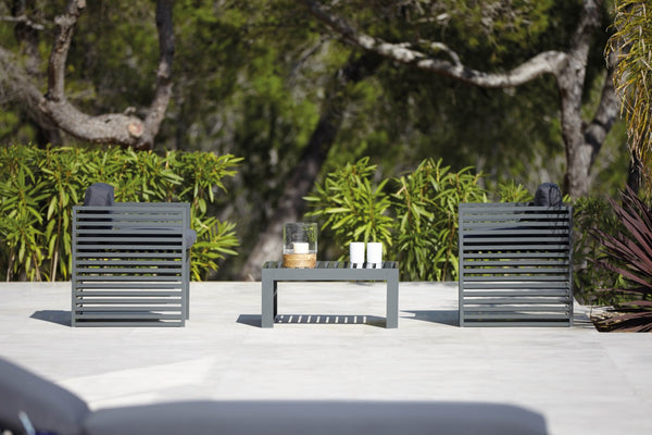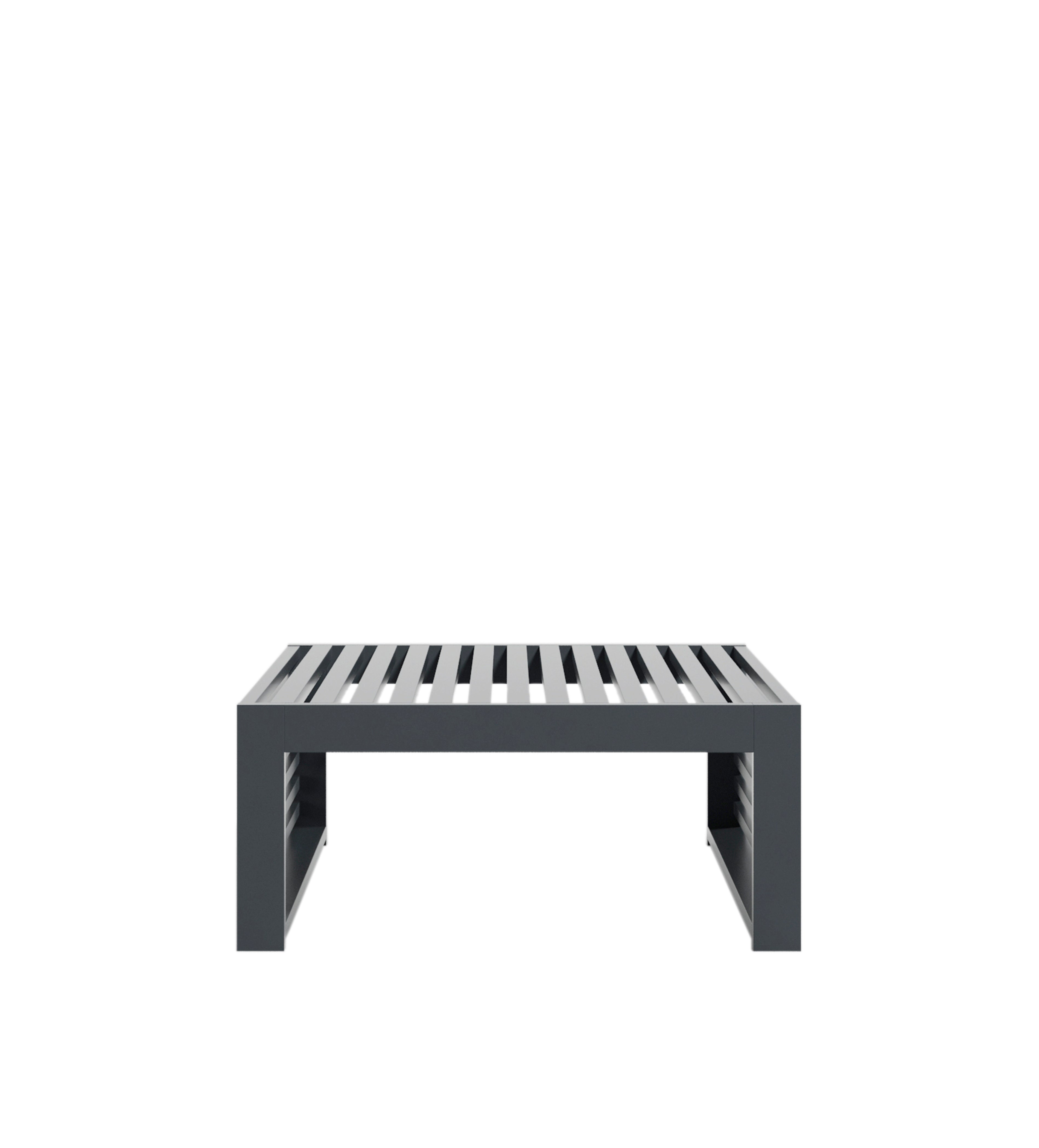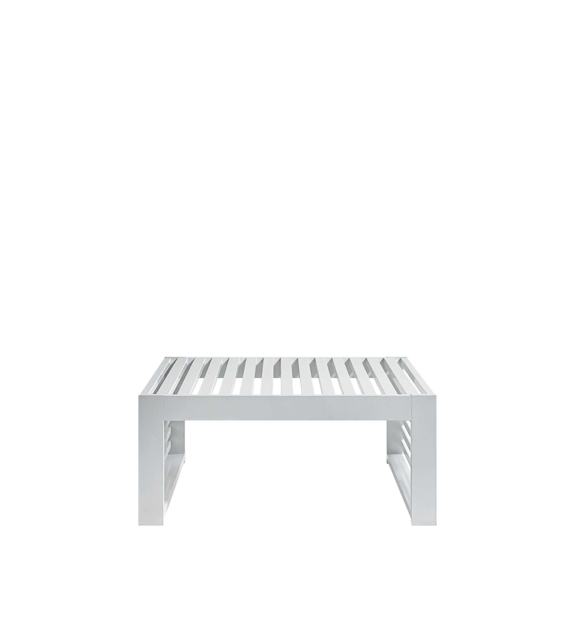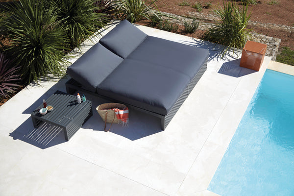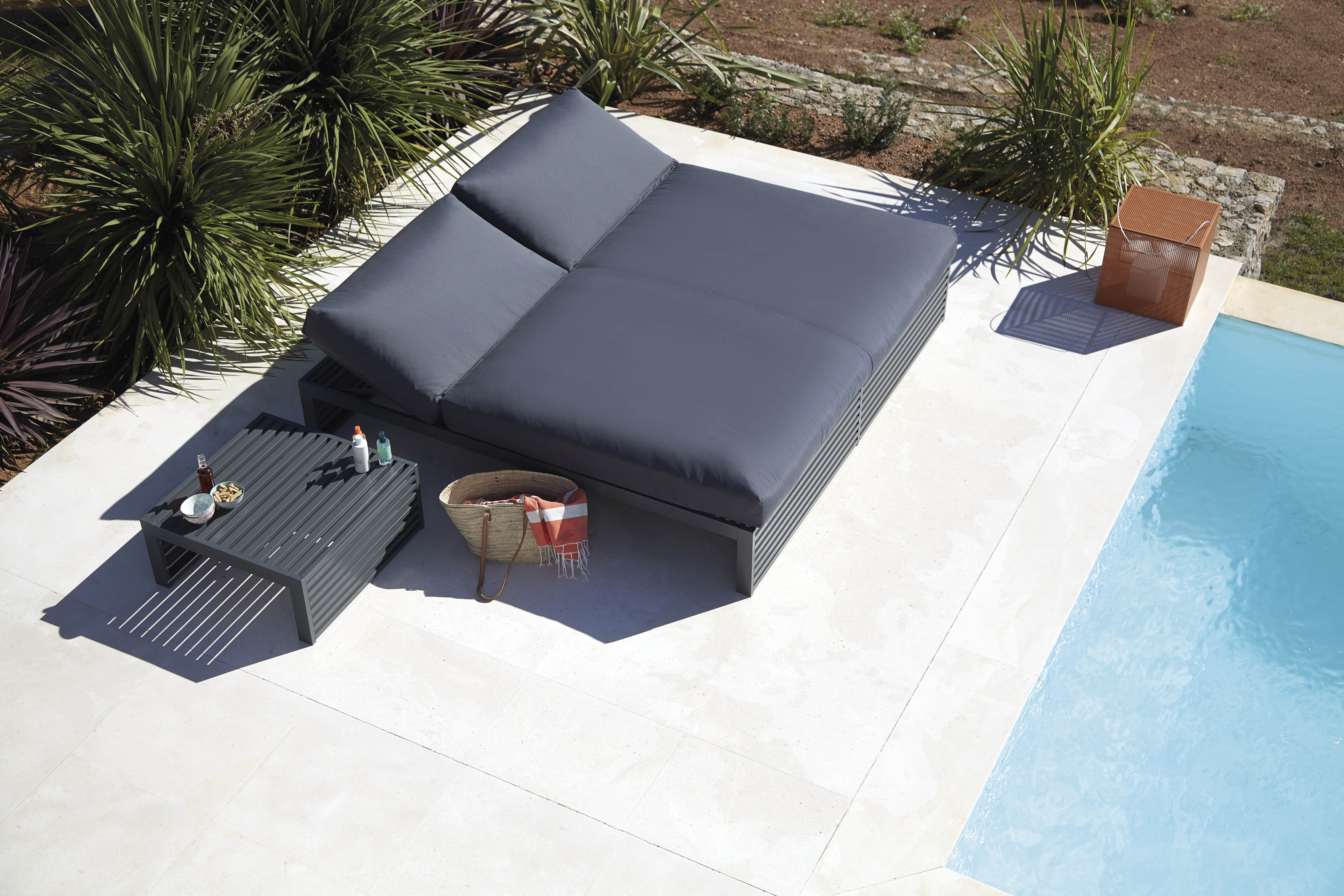 Der Chaiselongue-Tisch DNA vervollständigt die Kollektion. Es handelt sich um einen eleganten Designertisch mit rein architektonischem Charakter, der mit einem Konstruktionssystem aus gefrästem Aluminium hergestellt wird. Sowohl die Struktur als auch die Kissen und Sitzauflagen sind in verschiedenen Farben und Ausführungen erhältlich, von dezenten Optionen bis hin zu leuchtenden Tönen, die Sie ganz nach Ihren Wünschen gestalten können.