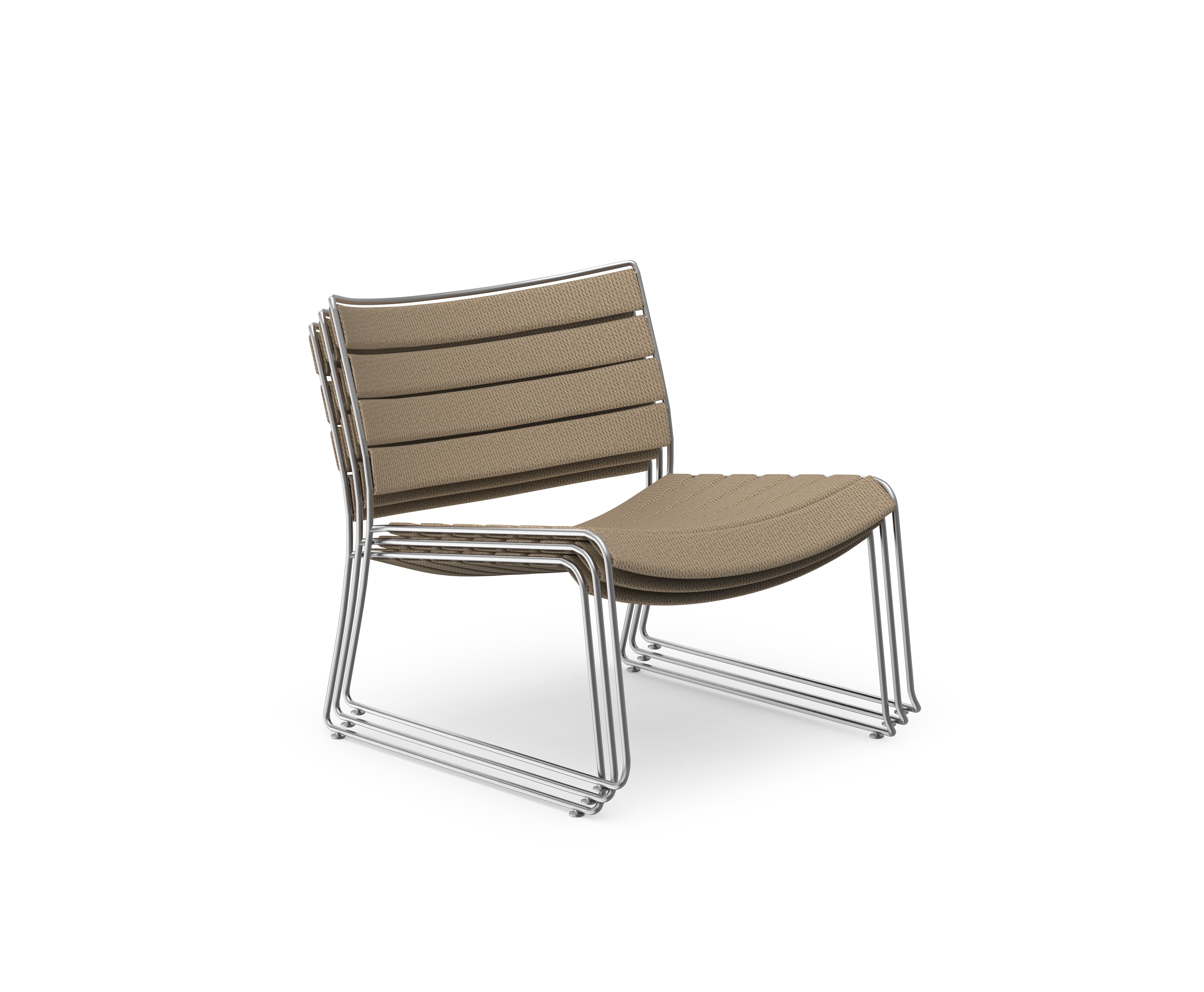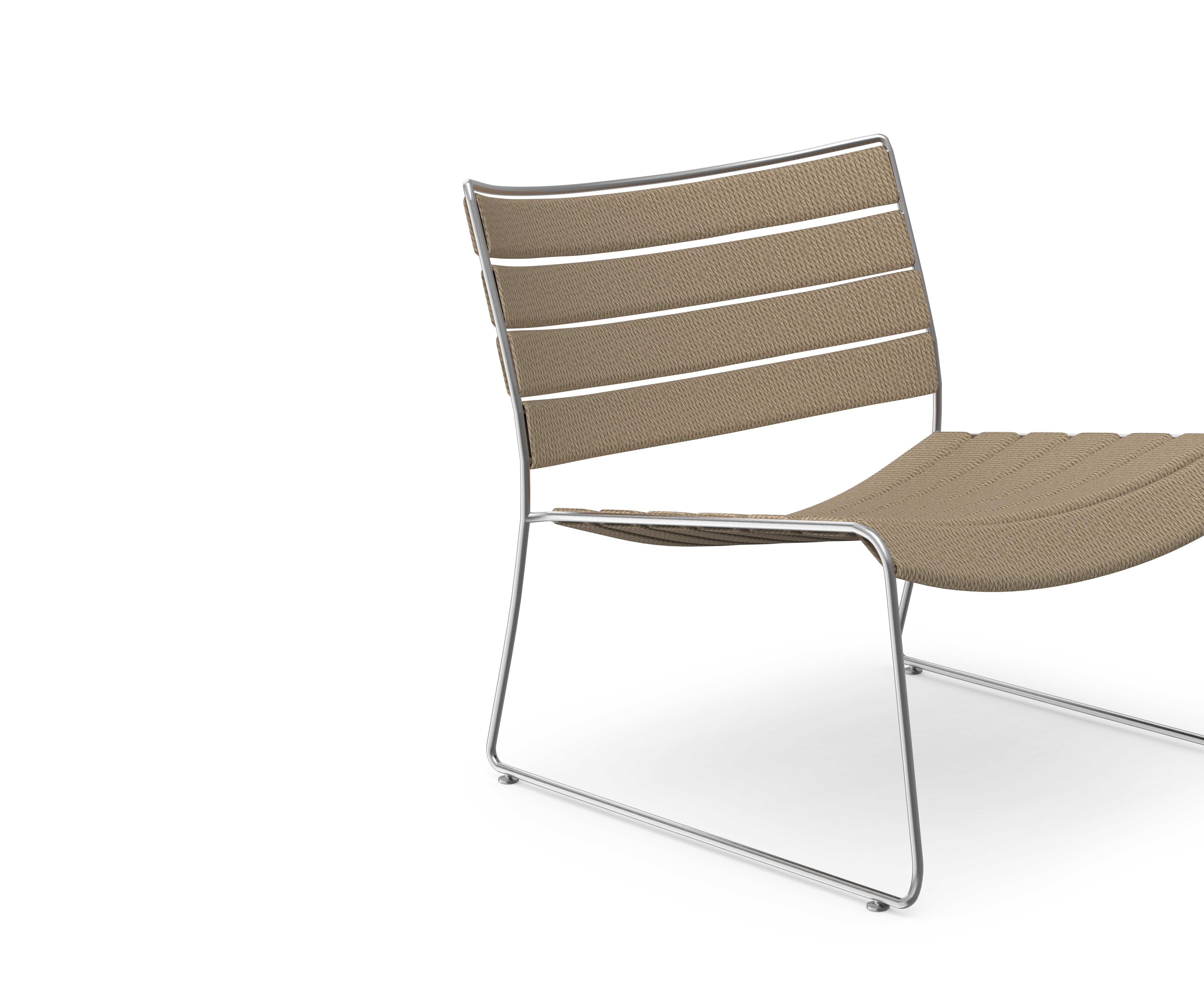 Sein Design basiert auf einer minimalistischen Konstruktion mit einem dünnen Rahmen aus satiniertem Edelstahl AISI 316L. Die Sitzfläche und die Rückenlehne bestehen aus 100 % Polyester-Seil mit einem natürlichen Aussehen, ähnlich wie dänische Schnur. Dieses Material ist für den Außenbereich geeignet und sorgt für geschwungene Stützflächen. Der Lounge-Sessel ist stapelbar, bis zu maximal 4 Einheiten.