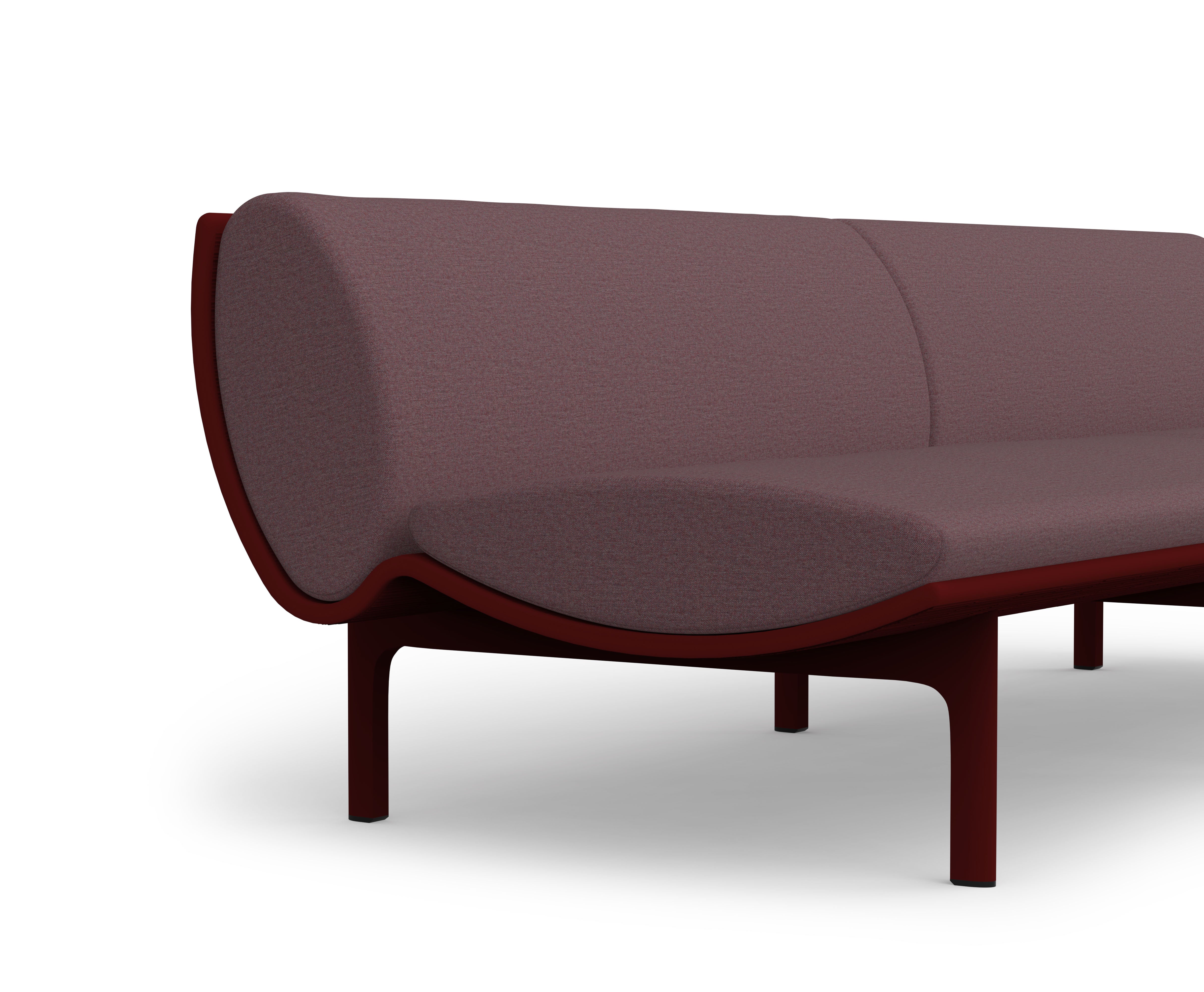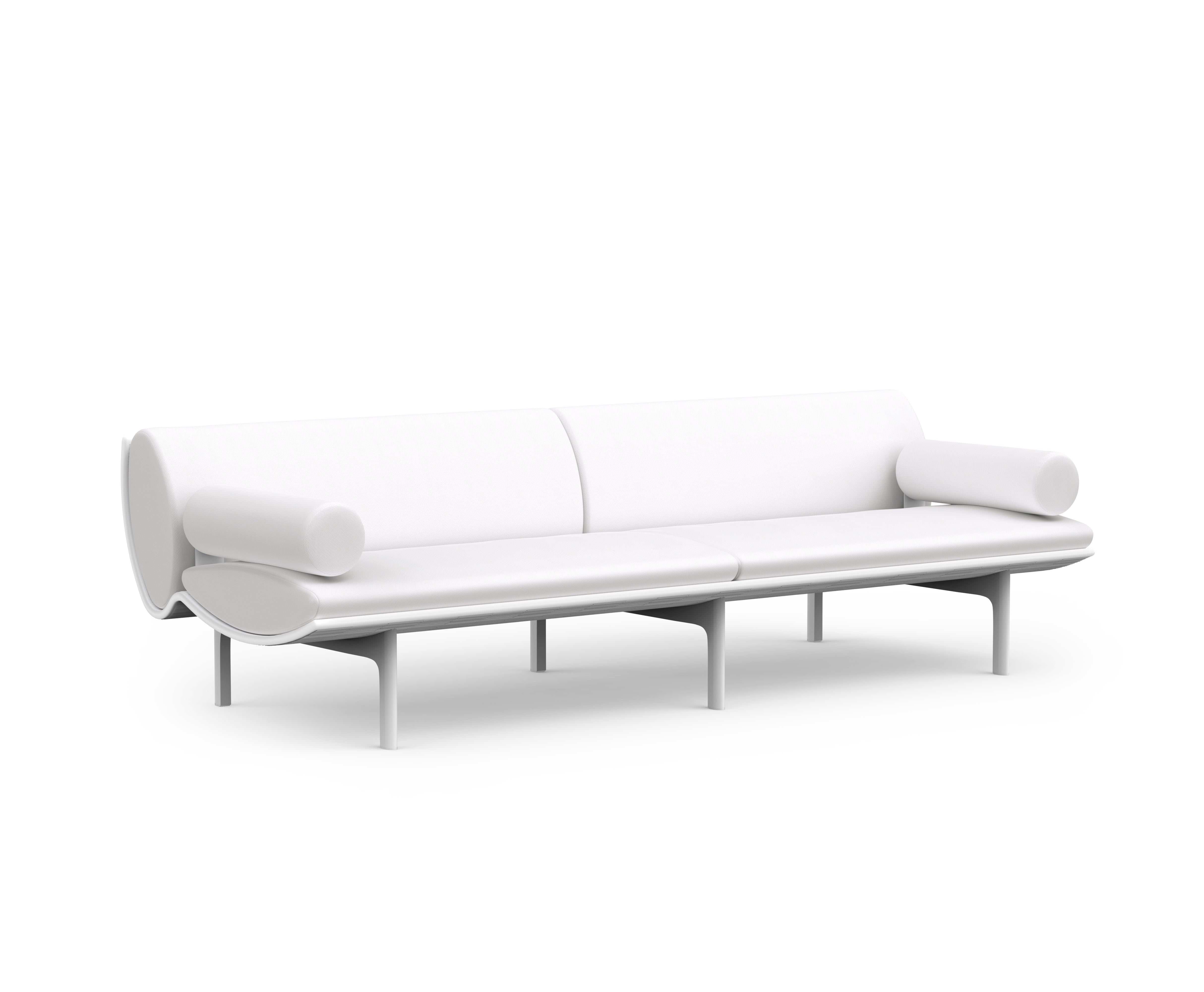 Seine geschwungene Struktur besteht aus 100 % recycelbarem, pulverbeschichtetem, mikrogewelltem Aluminium, das von Hand zusammengesetzt und verschweißt wird, um seine charakteristische Form zu erhalten. Der Komfort ist hervorragend, dank integrierter Matratzen aus Polyurethanschaumgummi und Polyesterfasern mit wasserabweisendem Bezug.
