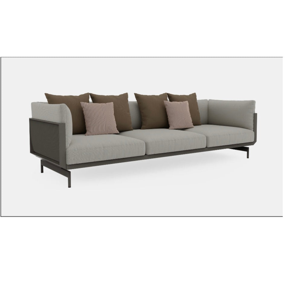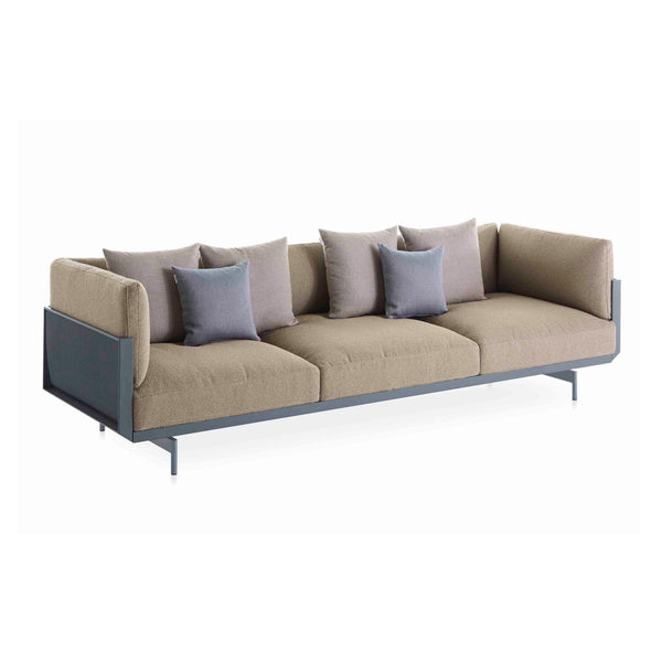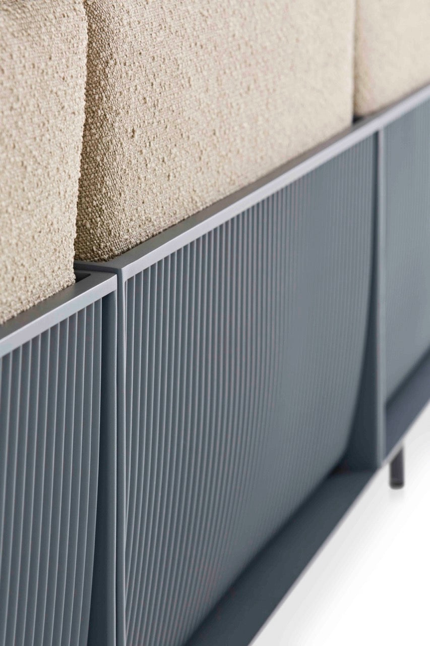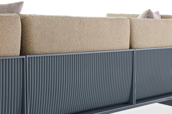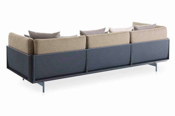 Die Bedeutung von Komfort und akribischer Liebe zum Detail. Das ONDE 3-Sitzer-Designersofa ist eines der repräsentativsten Stücke der Serie. Hergestellt aus geschweißtem Aluminiumwellblech, vermitteln die Präzision seiner Oberflächen und der Komfort seiner Kissen die Wärme, die Innensofas innewohnt, mit der Haltbarkeit und Widerstandsfähigkeit von Außenmaterialien.