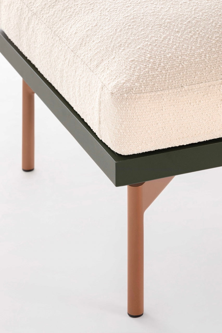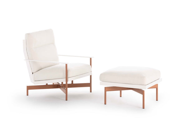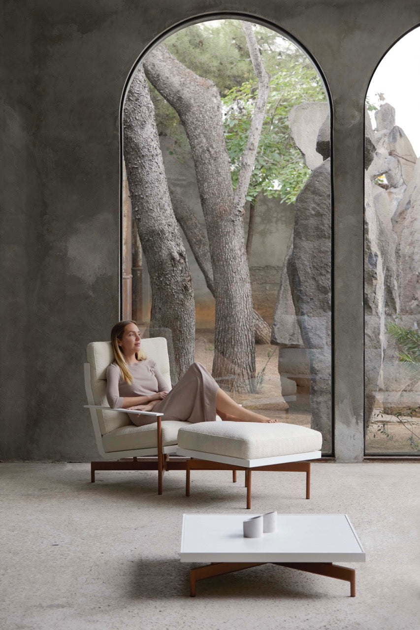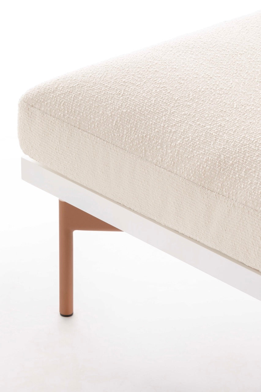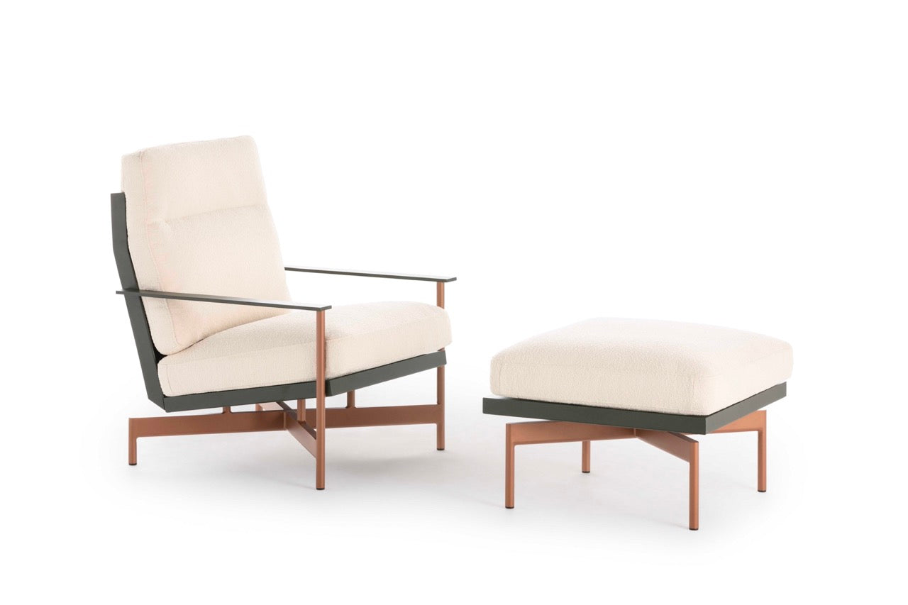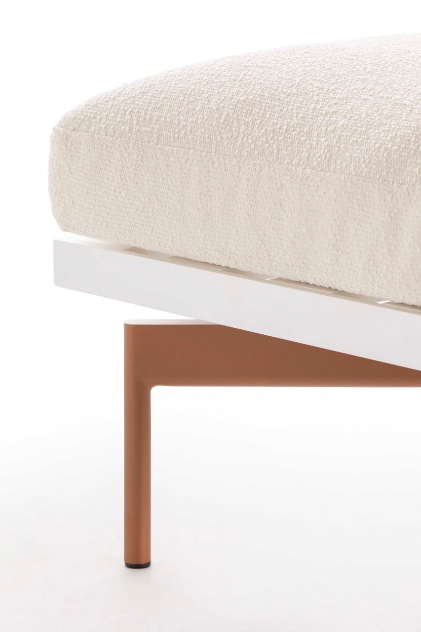 Der ONDE-Pouf für Clubsessel ist ein Design-Outdoor-Pouf aus pulverbeschichtetem Aluminium, ein Beispiel für Komfort dank des Triafill-Mikrofasertextils, das der Polyurethanschaum-Basis des abnehmbaren Kissens hinzugefügt wurde.