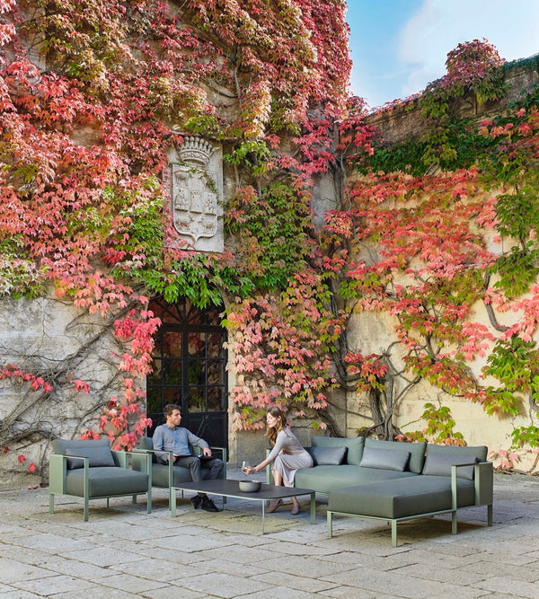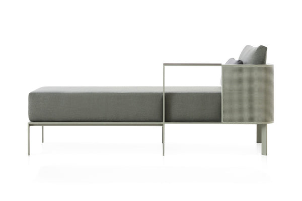 Das SOLANAS Sectional 2 ist ein Sofa oder eine Chaiselongue für den Außenbereich, das mit dem Rest der Kollektion kombiniert werden kann, um Inseln oder Räume mit demselben Stil und derselben Eleganz zu schaffen. Hergestellt aus Aluminium, dem charakteristischsten Material von GANDIABLASCO, besteht die Besonderheit darin, dass in diesem Fall das Aluminiumprofil mit einer mikroperforierten Oberfläche verschweißt ist, was dem Möbelstück Leichtigkeit verleiht.
