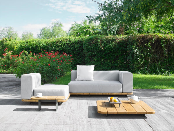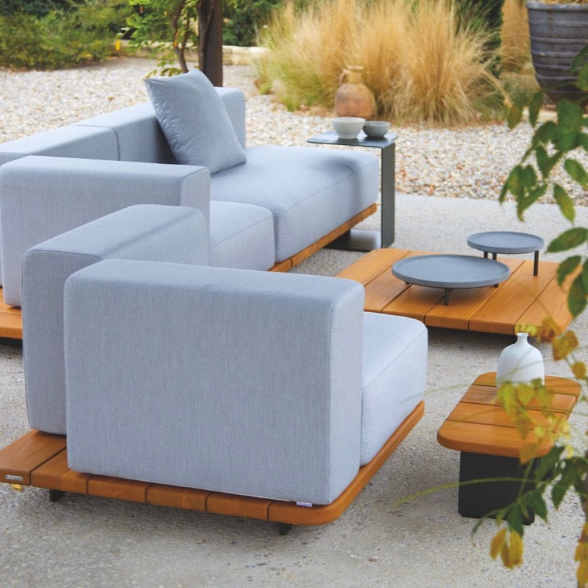 Beistelltisch 61x28 cm. Aluminiumstruktur in Metallic Grey 56 epoxilackiert Abdeckung aus Teakholz aus Burma
