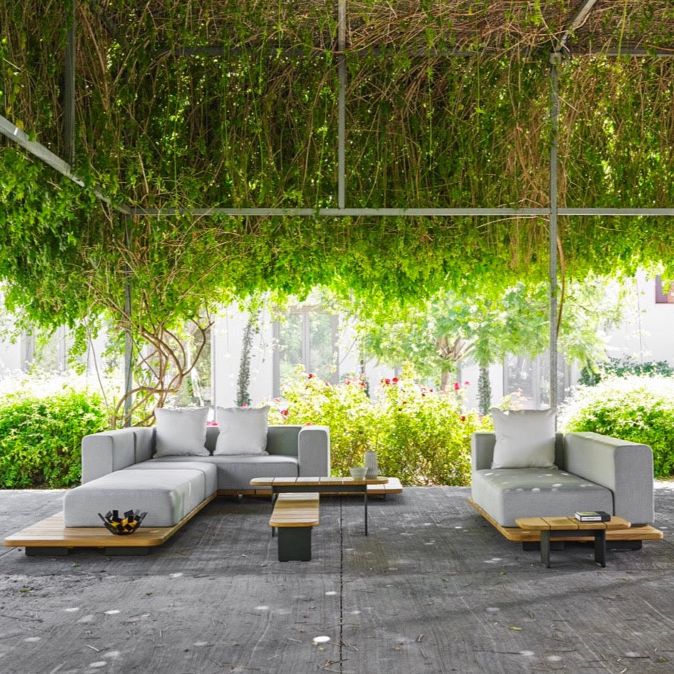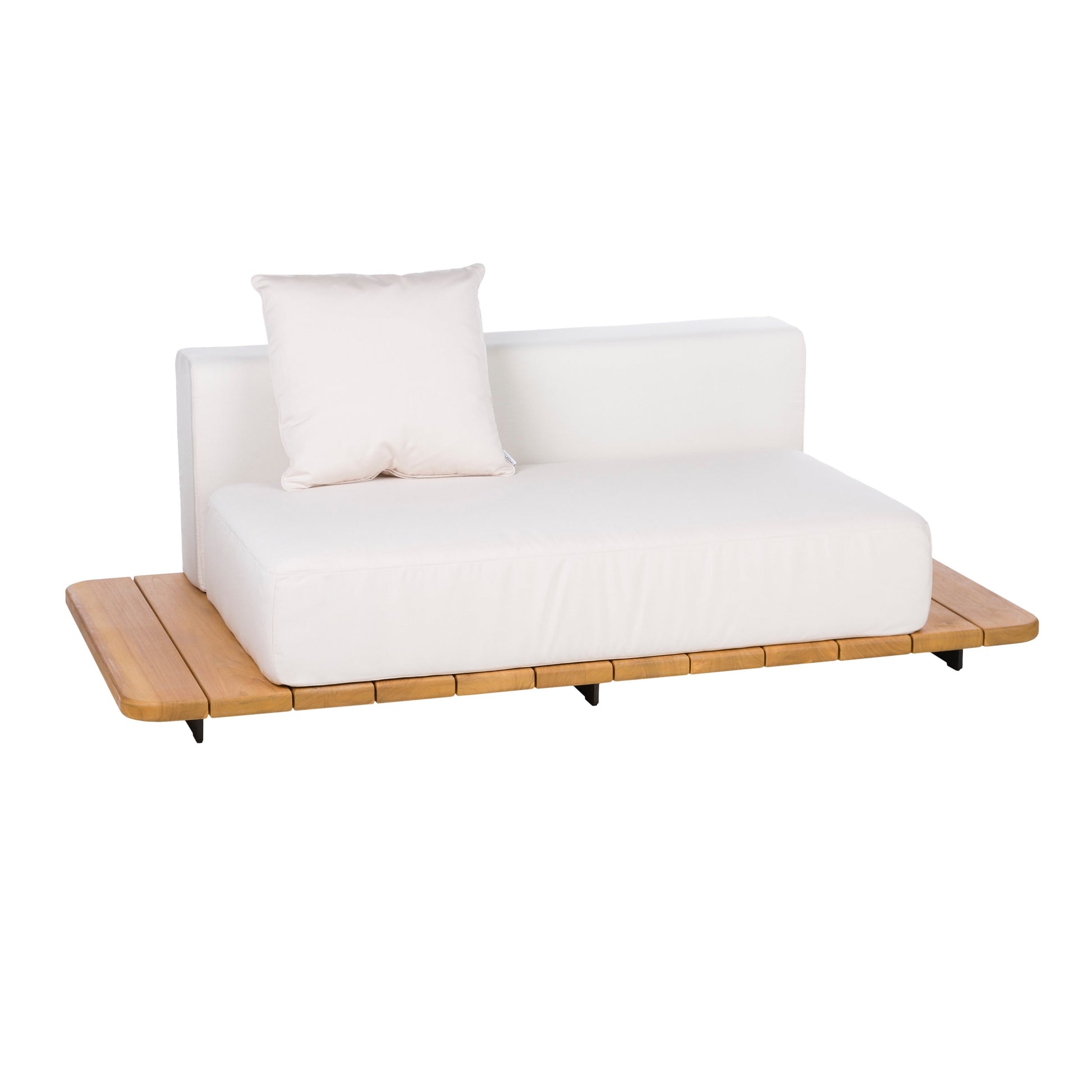 2 Sitzer Sofa Basis 184 x 92 aus Teakholz von Burma mit Beinen aus epoxylackiertem Aluminium Farbe Metallic Grey 56, Sitzkissen aus Schaumstoff von 35 kg. Mit undurchlässigem Innenbezug und Außenbezug mit Stoffen der Point Musterpalette. Sie können die Kissen auch ohne Stoff oder mit Ihrem eigenen Stoff kaufen.