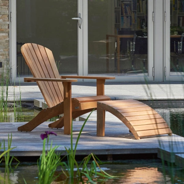 Wer mag, ergänzt den komfortablen Gartenstuhl um den passenden Fußhocker zu einem einladenden Liegestuhl und entscheidet sich für die zusätzlich erhältlichen Auflagen aus witterungsbeständigen Sunbrella Outdoor-Stoff.