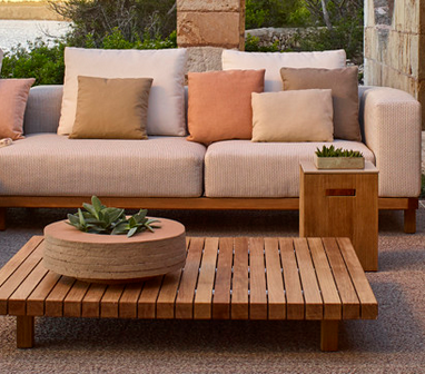 Das Vis á Vis Sofa ist ein Outdoor Lounge Sofa, das eine Ode an das reine Design bringt. Die Teakholzplatte scheint zu schweben. Da die Kissen über einen Bügel geschoben werden, sind Rücken- und Armstrukturen des Sofas unsichtbar. Hierdurch bietet das Sofa auf allen Seiten eine gute Sicht. An der Platte lassen sich außerdem ein Grafiktablett oder praktische Tische montieren.