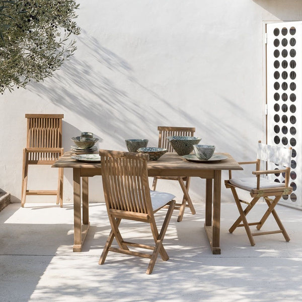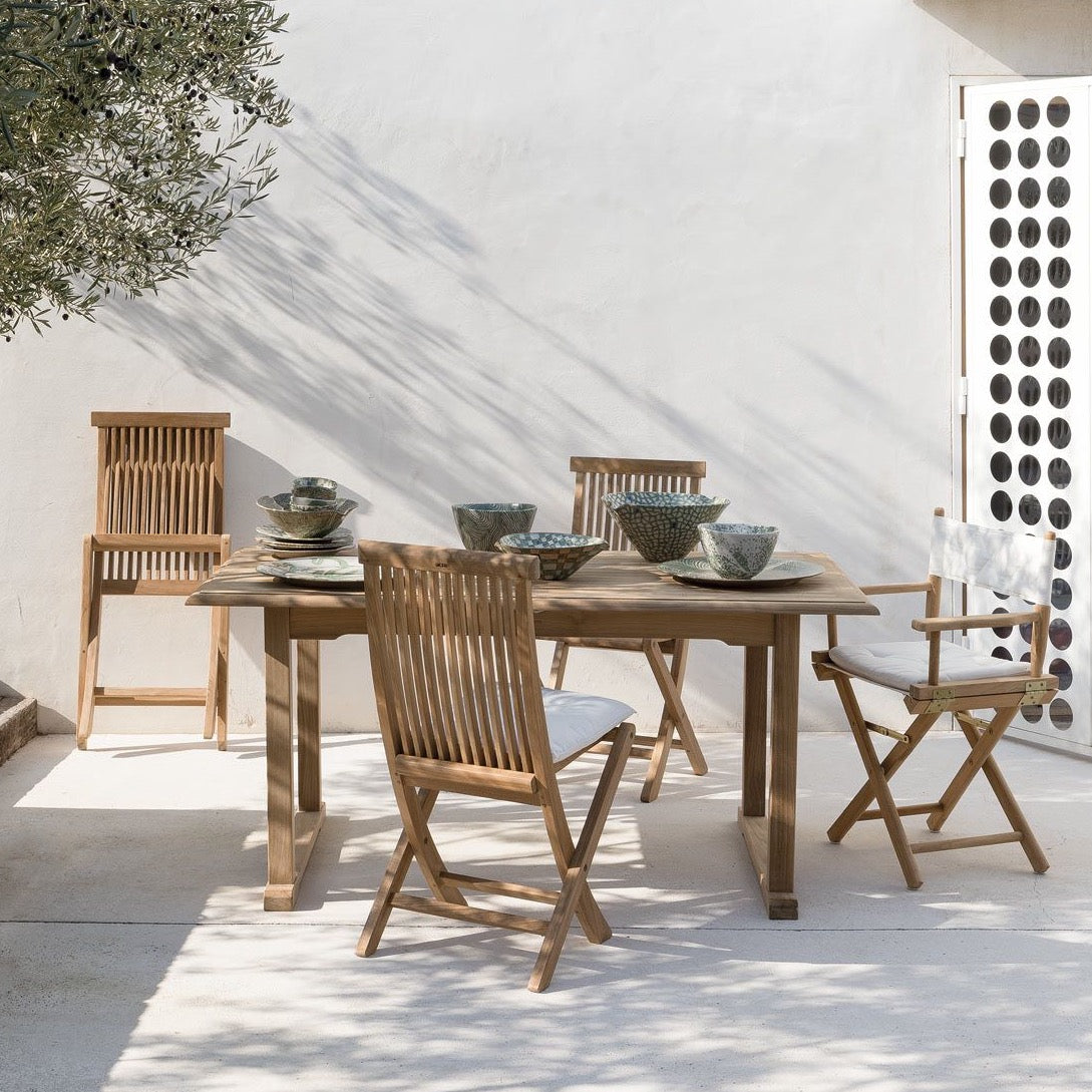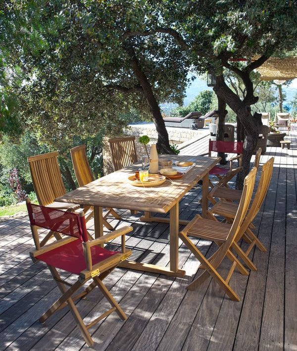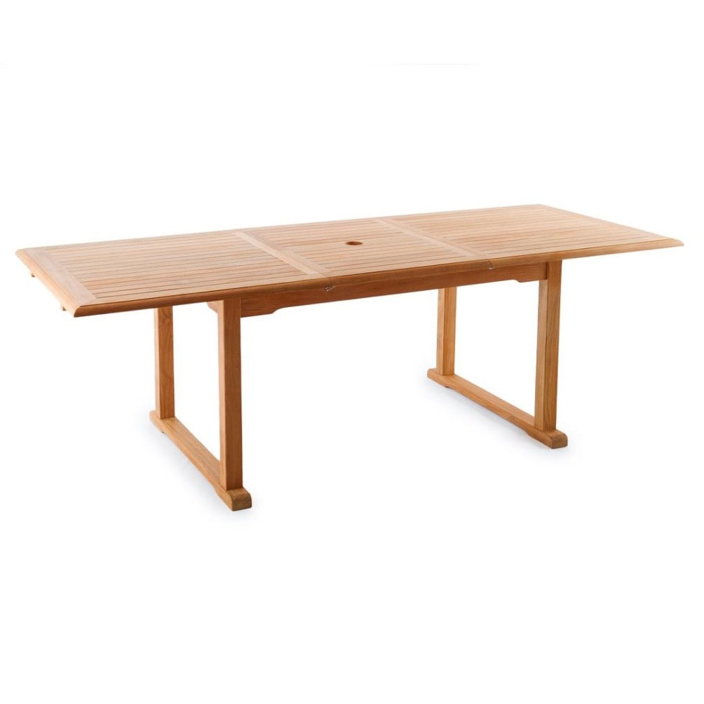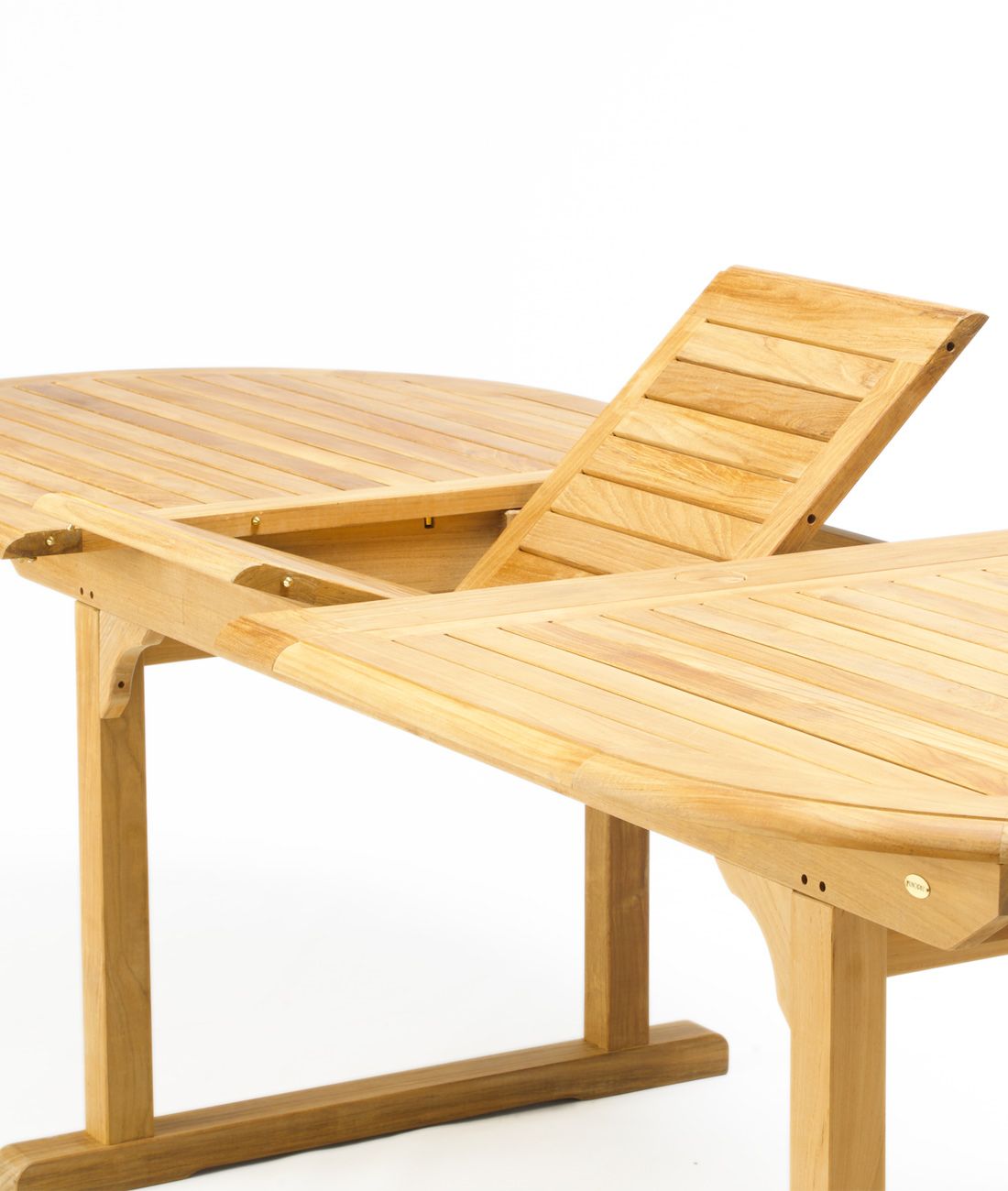 Der Tisch Chelsea ist komplett aus Teakholz angefertigt. Er ist ausziehbar und hat Platz für den Sonnenschirm Lipari.