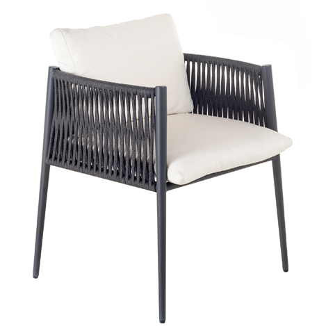 Der Luce Armstuhl entsteht aus der Kombination von Aluminiumstruktur und Seil, womit Rückenlehne und Armlehnen bespannt sind, so entsteht ein raffiniertes Zusammenspiel von Stil und Eleganz.