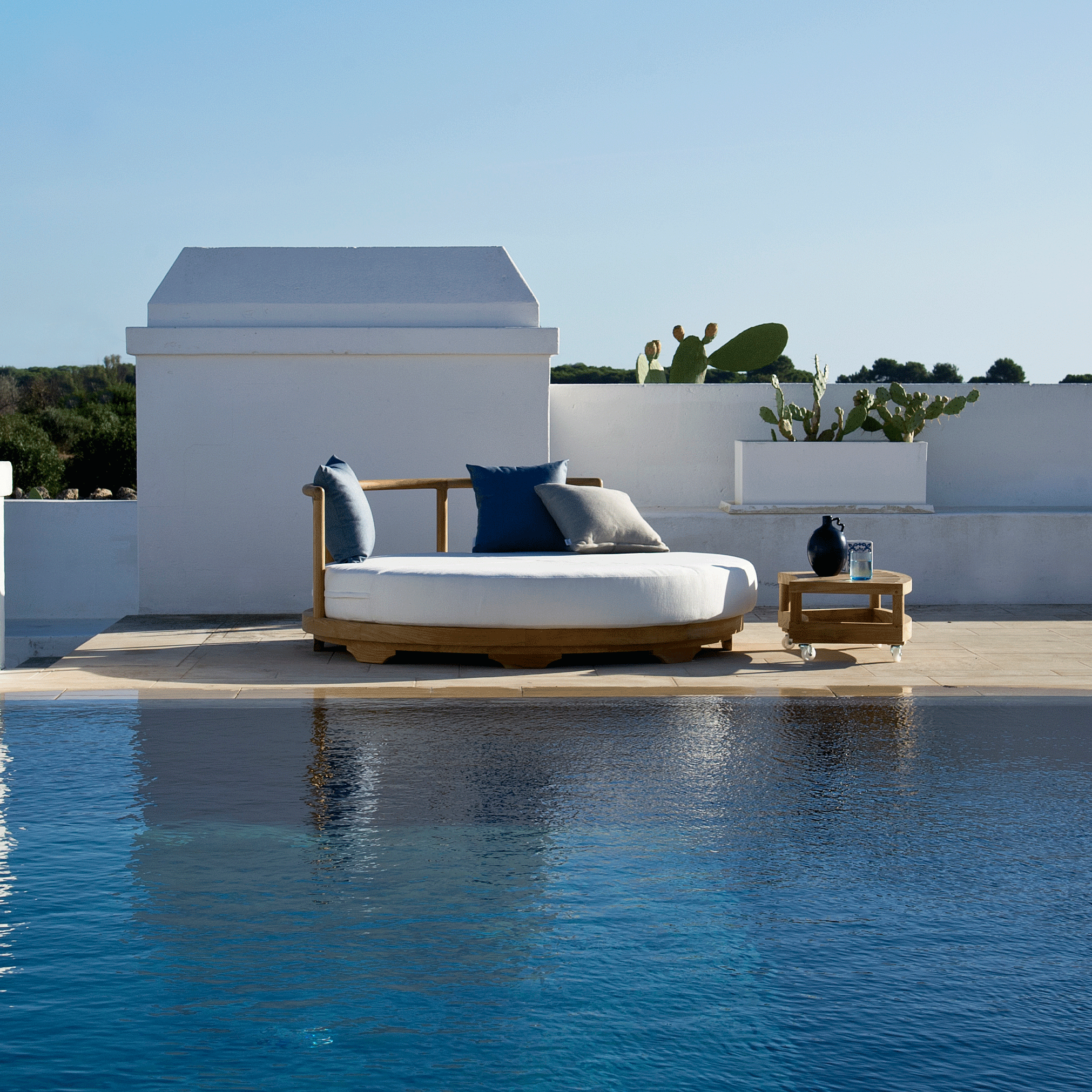 Das schlichte und essentielle Design der Pevero-Serie unterstreicht die Verarbeitung der Rundprofile. Sofas, Sessel, hohe Tische und Couchtische in verschiedenen Größen, drei unterschiedliche Modelle von Stühlen und Armstühlen, die auch mit anderen Kollektionen kombiniert werden können, eine Sonnenliege und eine große runde Insel holen den Urlaub in Ihren Garten. Alle Artikel zeichnen sich durch die Verarbeitung des Teakholzes und die weichen, abgerundeten und geschwungene Linien aus.