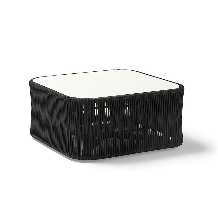 Square lounge table. Powder-coated aluminum braided with polyester rope. Table top made of porcelain or HPL