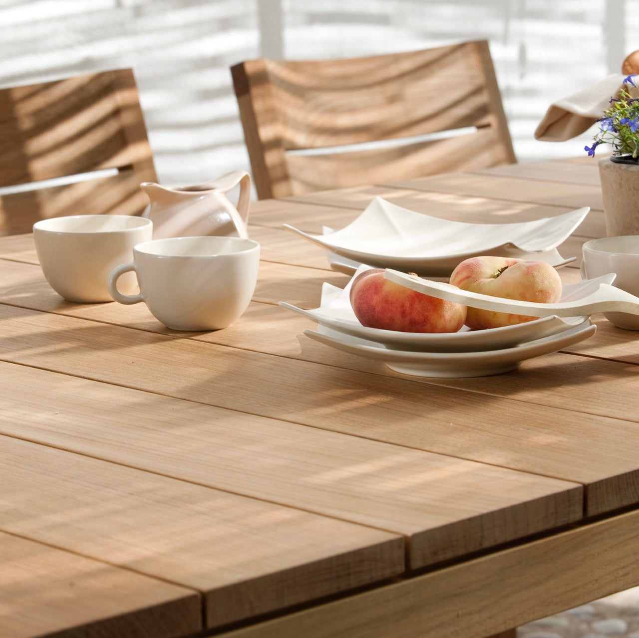 The combination of the wide slats and the clear yet impressive design show the teak from its modern and robust side. The Kos table is available in different sizes and fits different chairs. Tribù only uses teak of the highest quality, which has been awarded an A label and which has been sustainably grown on Indonesian plantations. Production is controlled on site all year round by the subsidiary Tribù Asia.
