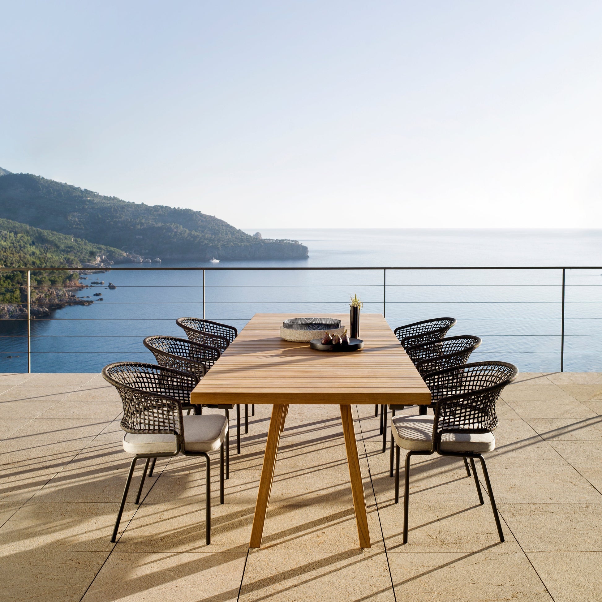 The Vis à vis collection gives wooden outdoor furniture a new dimension. Teak is designer Piergiorgio Cazzaniga's favorite material for outdoor use, it is natural, smooth and very durable. When he started designing the collection, he imagined a place where it would be pleasant to spend time together and communicate with each other. The result was an extra wide lounger with an integrated table. The collection was soon expanded to include a dining table that has the same square slats as the lounge table. Thanks to the 99x99 cm module, you can extend the table virtually infinitely, for even more fun at the table!