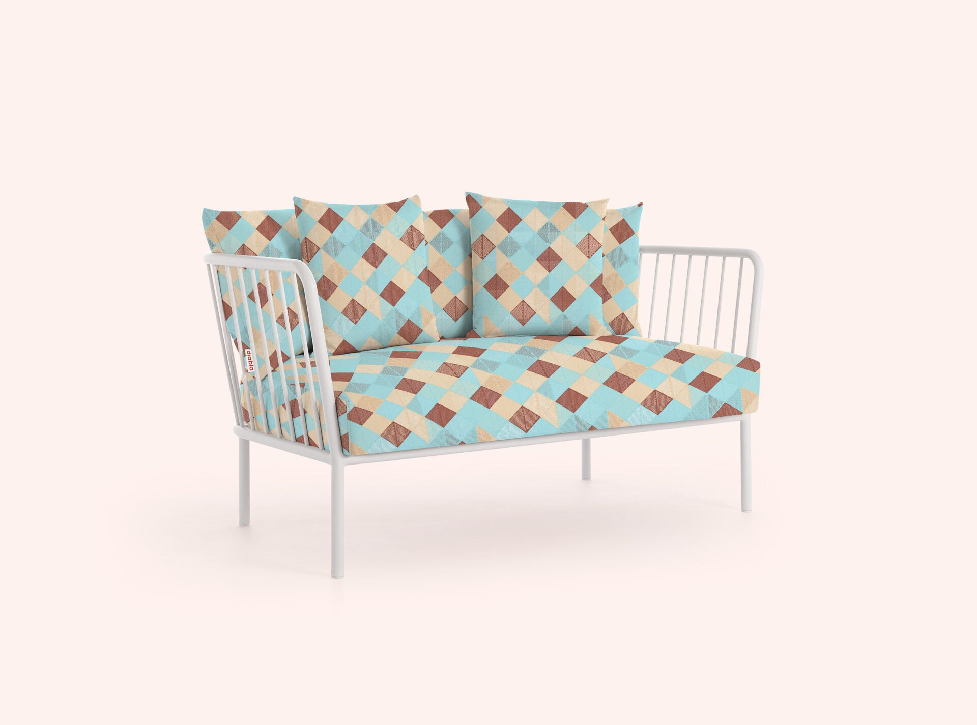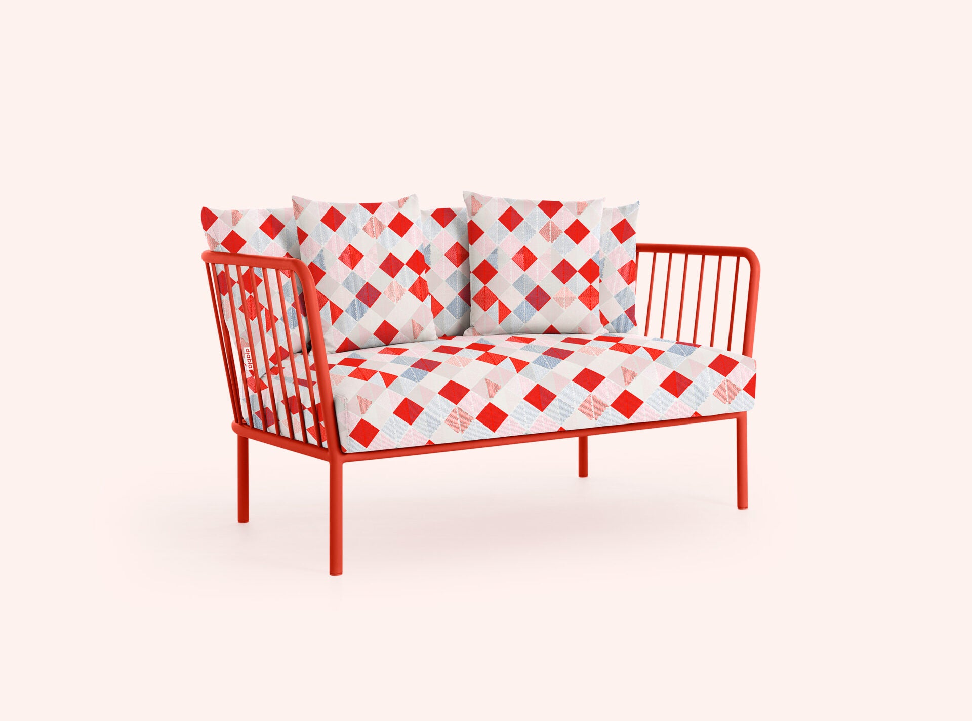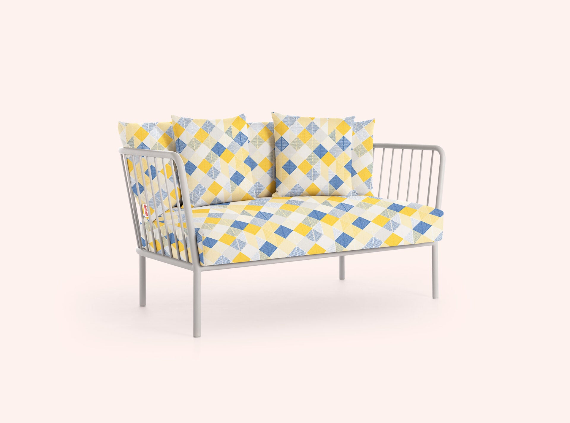 Das zweisitzige Arp-Sofa wurde aus einer Rohrstruktur aus strukturiertem Aluminium entwickelt, einem ausdrucksstarken und funktionalen Material. "Das Licht, das die eloxierte Oberfläche reflektiert, ist magisch und voller Nuancen, während eine rohe Oberfläche rau und aufrichtig ist. Und natürlich wird durch die Pulverbeschichtung die Farbpalette vervielfacht. Wir arbeiten seit Jahren damit, sowohl in Bezug auf das Produkt als auch auf die Architektur, und es hört nie auf, uns zu überraschen", kommentieren seine Schöpfer. Die abnehmbaren, mit Polyurethanschaum gefüllten Kissen sorgen für den Komfort dieses Designsofas.