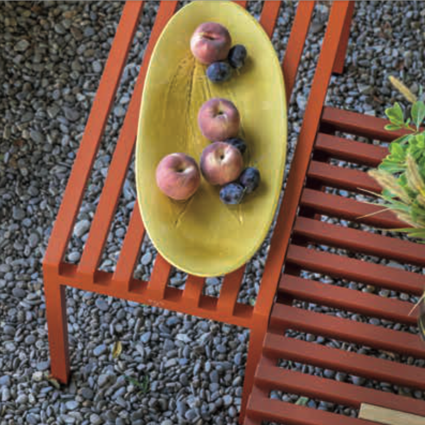 Das Gestell und die Latten dieser Tische bestehen aus pulverbeschichtetem Aluminium.
