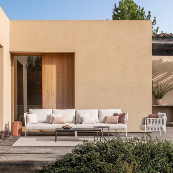 Nido ist eine modulare Polsterkollektion mit einer Struktur aus rostfreiem Stahlrohr, die den Einsatz im Freien garantiert.