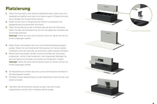 - Befestigungsmaterial: Die feste Teichwand wird auf dem Teich installiert. Die Befestigungselemente sind inklusive.